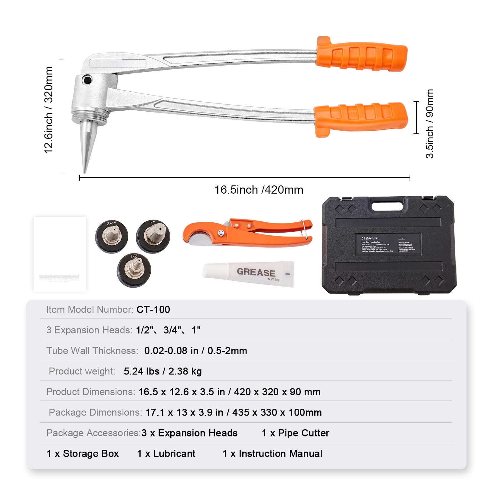 Product Description BENTISM Manual Lever Tube Expander Are you tired of struggling with complicated tube expansions? Look no further! BENTISM manual lever tube expander is here to revolutionize the way you connect pipes. Featuring 3 expansion heads (1/2″、3/4″、1″) to accommodates a wide range of tube sizes. Ergonomic long lever handle simplifies the expansion process, allowing you to achieve flawless connections with much ease! High Efficiency Are you tired of struggling with complicated tube expansions? Look no further! BENTISM manual lever tube expander is here to revolutionize the way you connect pipes. Comfortable Grip Our tubing expander features a long lever handle and a cushioned grip, providing you with comfortable and effortless working experience. Lever Effect With the leverage provided, you can expand the tube more smoothly and evenly, ensuring a tight and secure connections. Built to Last Hardened steel hvac swaging tool ensures the strength and durability of the tool throughout the expansion process. Versatile Accessory Kit Includes 1 manual lever tube expander, 1 pipe cutter, 3 expansion heads and lubricant, catering to various types of connection needs. Wide Applications Whether you’re working with aluminum, brass, soft copper, titanium, or mild steel tubing, this versatile tube expander kit makes expanding and connecting these materials a breeze. Specifications Item Model Number: CT-100 3 Expansion Heads: 1/2″, 3/4″, 1″ Tube Wall Thickness: 0.02-0.08 in / 0.5-2mm Product weight: 5.24 lbs / 2.38 kg Product Dimensions: 16.5 x 12.6 x 3.5 in / 420 x 320 x 90 mm Package Dimensions: 17.1 x 13 x 3.9 in / 435 x 330 x 100mm Package Content 1 x Manual Lever Tube Expander 3 x Expansion Heads 1 x Pipe Cutter 1 x Storage Box 1 x Grease 1 x Instruction Manual
