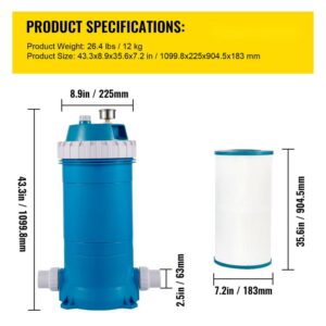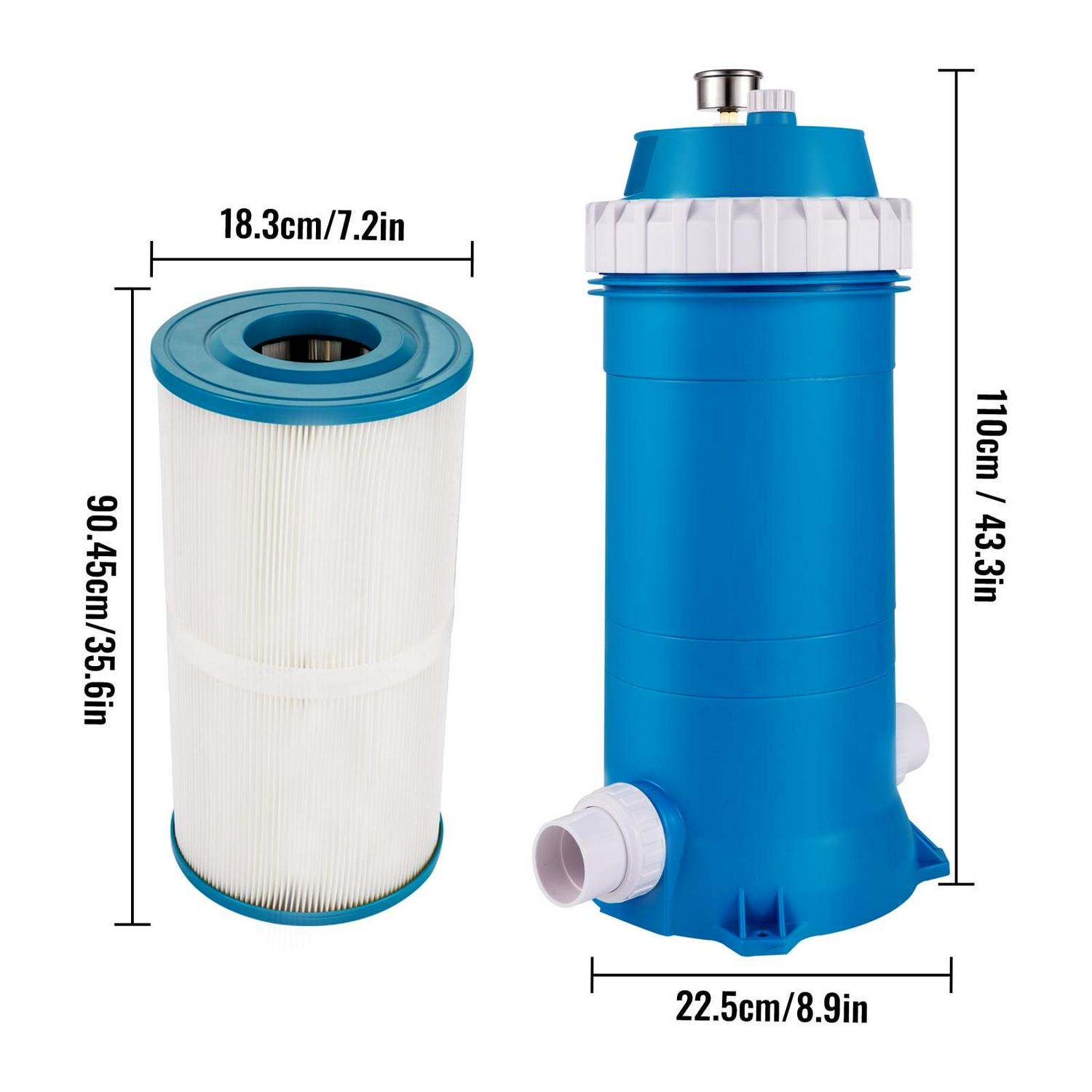 The pool filter is equipped with a PVC air vent pipe, pressure relief valve, and a pressure gauge for emptying the excess air automatically and prevent the filter from a burst. The pressure gauge allows you to examine the pressure inside the filter precisely.The pool filter is glass fiber polypropylene material with a polyester cartridge, air relief valve, and gauge for efficient pool water purification. The filter comes with 2 unions for easy installation. You and your family will have clean, refreshing, and cool water fun with the help of this pool cartridge filter.