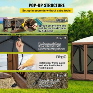 Bite-proof & Private Space & Well-ventilated.10′ x 10′ large camping gazebo tent can fit up to 8 people inside, constructed of waterproof 300D oxford fabric and bite-proof B3 gauze netting.We provide six wind fabrics, and two of them have a window. So if you want a private space for you and your friends, this canopy screen tent will be a great helper. Also, the winding fabric can withstand rain and wind.Designed with a pop-up strap, a camping gazebo can be installed effortlessly. You just need to spread out every side and make the center flat. It takes just a minute to finish the whole installation.