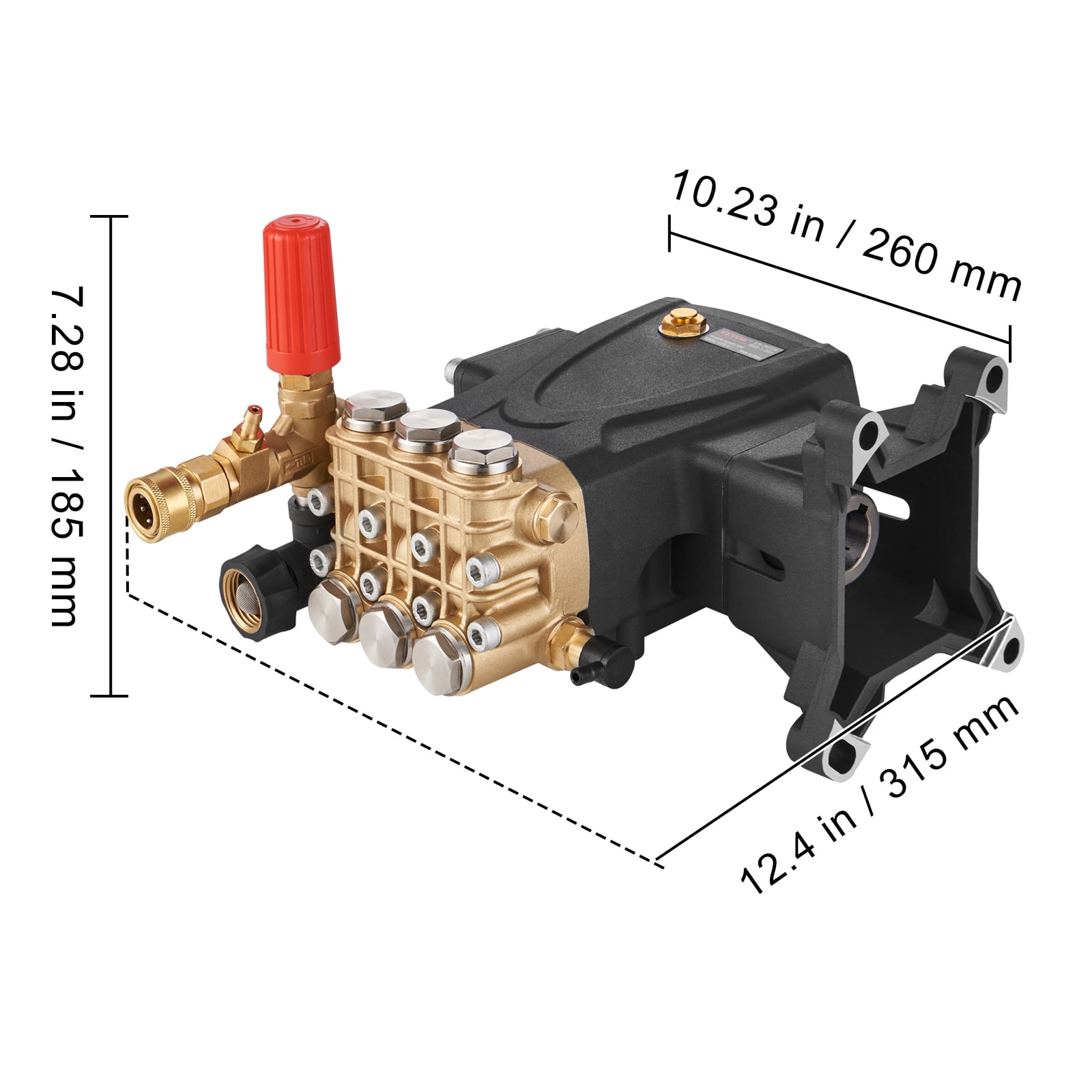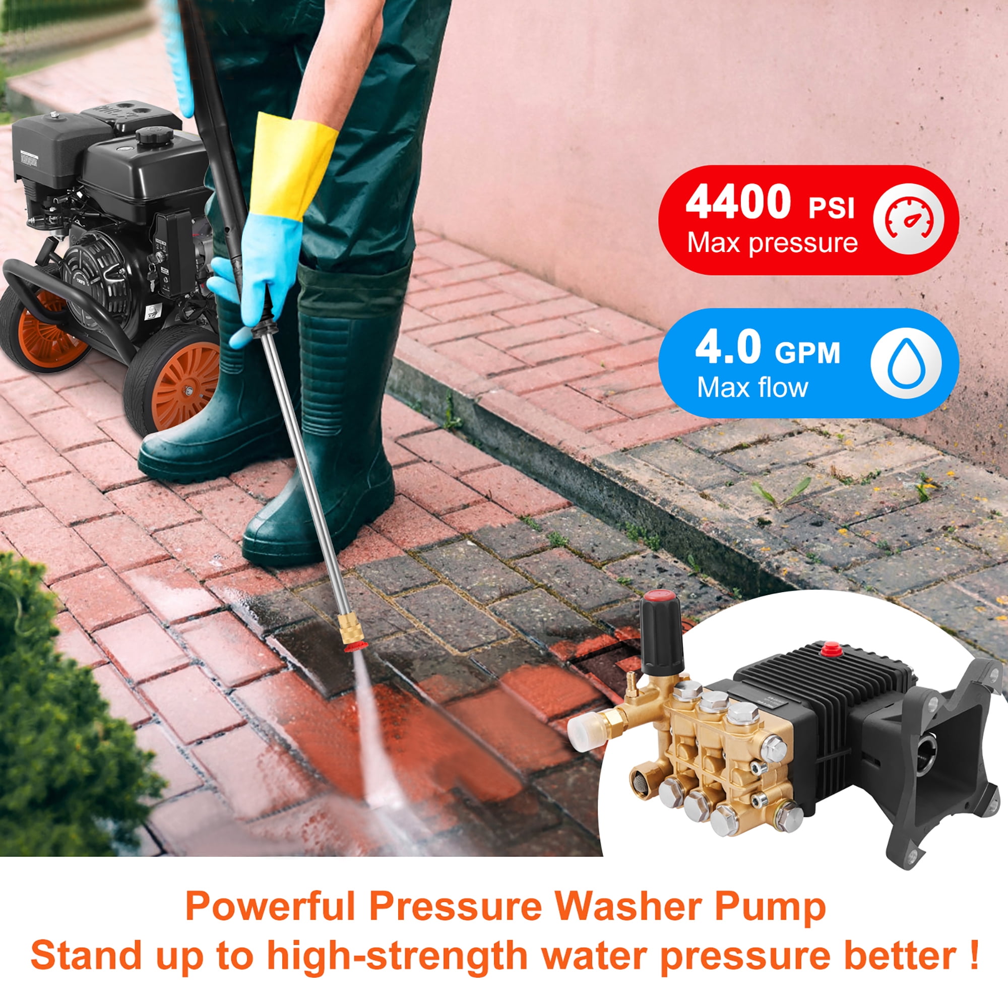 Product Description 1″ Shaft Horizontal Triplex Pressure Washer Pump Looking for an easy way to complete your daily and professional cleaning tasks? BENTISM replacement residential pump is the one you can trust! With adjustable pressure between 2500-4400 PSI, it’s perfect for boosting water pressure for your walls, sidewalks, and vehicles. Our parts washer pump features a standard SAE bolt pattern for easy installation. It is suitable for various gas pressure washers with horizontal engines. The power washer pump strengthens plunger hardness to reduce the chance of being damaged by impurities. It also improves wear resistance and prolongs the life of water/oil seals. Our replacement power washer pump has a sight glass for easy oil level inspection. By observing the oil level and the oil itself, you can easily check the oil level or see if water has mixed into the oil. From outdoor walls, sidewalks, cars, to construction sites, our power washer replacement pump can get the job done efficiently and effectively. It’s the go-to tool for all your cleaning needs. Our high pressure washer pump’s one-piece pump head is made of precision-forged brass material, ensuring high strength and increased durability. During installation, ensure the replacement pump for power washer matches engine orientation, PSI, GPM, engine shaft diameter, and current pump inlet and outlet connections. Specifications Item Model Number: KBD2815G Shaft Diameter: 1″/25.4 mm Max Pressure: 4400 PSI Max Flow: 4 GPM Horsepower: 9-15 HP Product Weight: 20.5 lbs/9.3 kg Product Size (L x W x H): 11.2″ x 9.6″ x 7.7″/28.4 x 24.35 x 19.7 cm Package Content 1 x Pressure Washer Pump 1 x Detergent Hose 4 x Bolts (UNC3/8-16 x 1-1/2) 1 x Vent Plug 1 x Shaft Key (6.3 x 6 x 54) 4 x D10 Flat Pads 4 x D10 Spring Washers