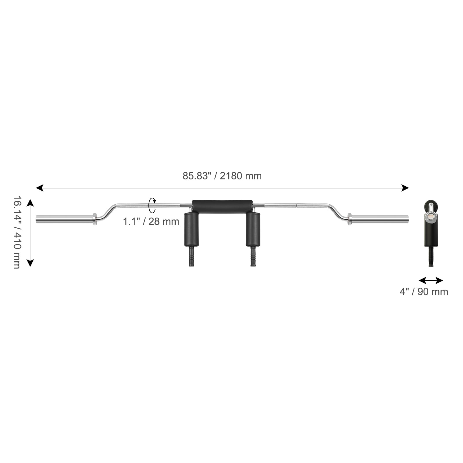 Product Description Safety Squat Bar This safety squat bar is a fitness equipment designed for your workouts, and it protects your shoulders and upper body during training. It allows you to comfortably exercise your glute muscles while also targeting your thighs and hamstrings. Whether you have injuries or not, it will be a valuable supplementary training tool in your arsenal. It offers comprehensive workouts for major muscle groups like the chest, legs, and back, helping you sculpt your ideal muscles! Superb Weight Capacity Our safety squat bar is meticulously crafted with seamless welding technology to support weights of up to 700 pounds, helping you achieve the perfect fitness lines. Full-Body Muscle Workout This versatile training equipment allows you to target all major muscle groups in your body, including the chest, abdomen, back, thighs, calves, forearms, neck, and shoulders, ensuring balanced development throughout your body. 2-Foot Barbell Shaft Our bar easily accommodates standard weight plates available in the market. Even beginners can operate it effortlessly, ensuring safe and effective squat training. Balanced Shoulder Strength The shoulder and neck areas of our squat equipment feature foam cushioning designed to help you balance your shoulder strength, making your training more diverse. Space-Saving Design Our squat equipment is thoughtfully designed to meet your training needs while occupying minimal space. You can start exercising anytime, anywhere, creating a healthy and comfortable personal space for yourself. Durable Structure Made from thick steel and utilizing seamless welding technology, our squat equipment is built to last, ensuring long-term use. Specifications Item Model Number: YQ-001 Middle Bar Diameter: 28mm Total Length: 87 inches / 2210 mm Dumbbell Bar Diameter: Compatible with 2-inch weight plates Maximum Weight Capacity: 700 pounds / 315 kg Product Weight: 44.53 pounds / 20.2 kg Product Dimensions: 85.83 x 16.14 x 4 inches / 2180 x 410 x 90 mm Packaging Dimensions: 44.69 x 17.13 x 4.53 inches / 1135 x 435 x 115 mm Package Content 1 x Safety Squat Bar 4 x 8*φ20 Screws 1 x Hex Screwdriver 2 x Handles