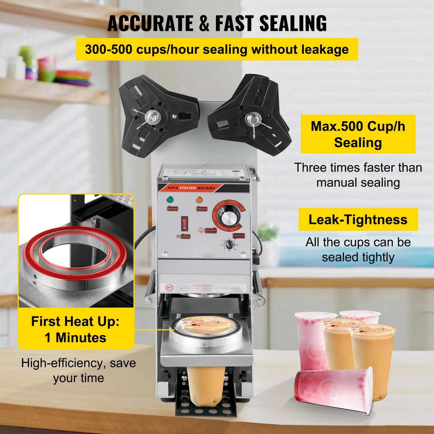 – Max.500 Cup/h Sealing: This cup sealing machine features secure and convenient operation, allowing it to seal cups within seconds. It offers an astonishing sealing output of 300 – 500 cups per hour, and you never have to worry about leakage. Besides, the first heat up time is just one minute, improving your working efficiency when business is busy. Get ready to start sealing confidently in no time.