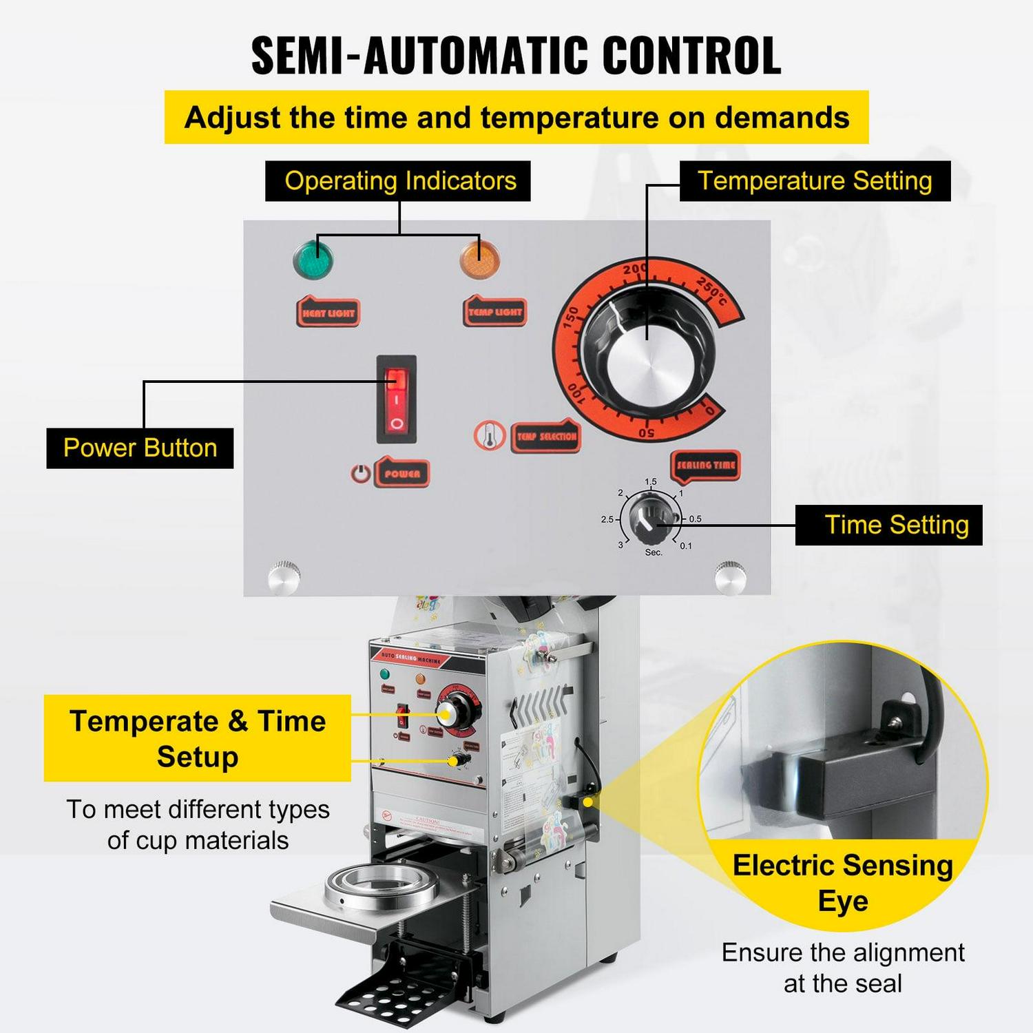 – Semi-Automatic Control: The teacup sealer machine is designed with an electric laser eye to track the film’s position to ensure accuracy. Moreover, the sealing time and temperature can be adjusted manually for various types of cups. It will save time and avoid complaints from customers, so your reputation can skyrocket.
