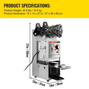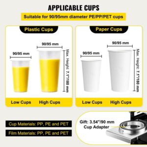– For 90/95mm PE/PP/PET Cups: This cup sealer is suitable for 3.54/3.74 in( 90/95 mm) PP, PE, and PET cups. The inner diameter of the cup is required to be less than 3.46 in/88 mm. Max. Height: 7.1 in/180 mm. The cup tray can be adjusted to fit the heights of various-sized cups and satisfies your different needs.