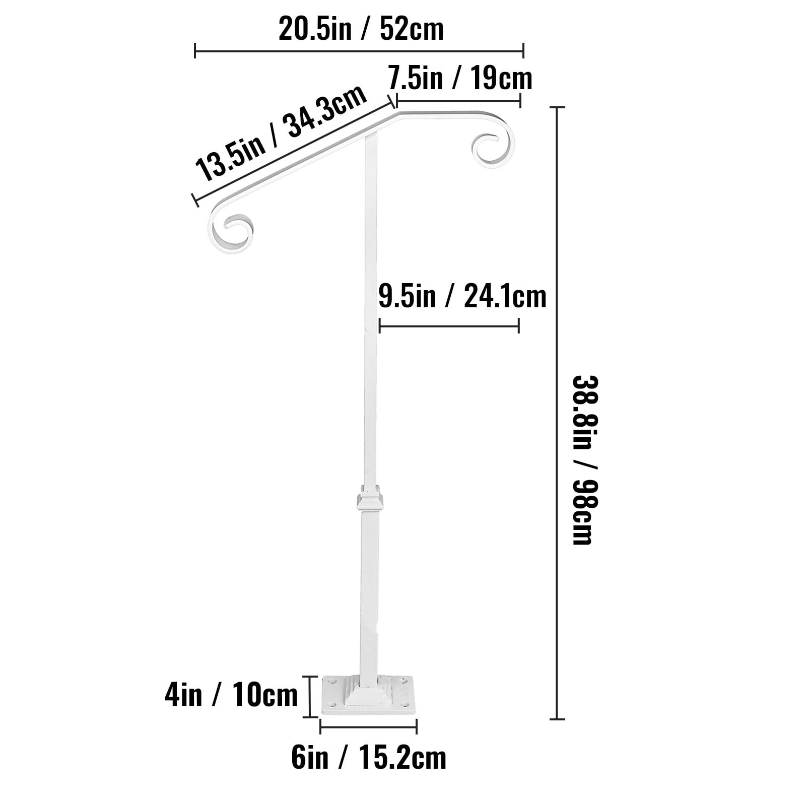 Product Description 1-2 Steps Single Post Railing Kit White This matte white handrail is single post ornamental handrail that fits 1 or 2 steps for stairs. Adopted welded steel, hand forged scrolls and powder coating technology, this single post railing is an elegant handrail providing the utmost safety. Suitable for gardens, residential buildings, commercial office buildings, hotels, etc. Decoration Single Post Handrail The single post railing for steps allows for 36” international building code. 4″x 6″ base plate for concrete or wood mount. Real Iron Metal This handrail is constructed with real wrought iron, not aluminum. It is more strong and reliable and will not fail or bend like aluminum. Also, stainless steel post mounts will not rust or flex. Powder Coating Technology Welded steel, hand forged scrolls and powder coating technology give these handrails stylish character while providing the utmost safety. Reliable & Stylish Design The single post rail with curved design is beautiful and stylish. The post are fused together with decorative cast iron parts at the transition points. Fast & Easy Installation The handrail includes all necessary assembly and installation hardware. It is easy for you to install instantly. Wide Application Suitable for gardens, residential buildings, commercial office buildings, hotels, etc. Specification Size: Installed Height is 36″ Color: Matte White Material: Wrought Iron Installation Method: Screw-In Package Content 1 x Single Post Handrail 1 x Installation Kit