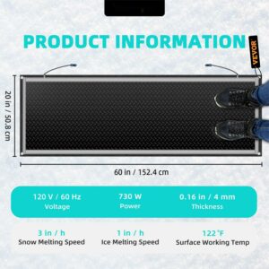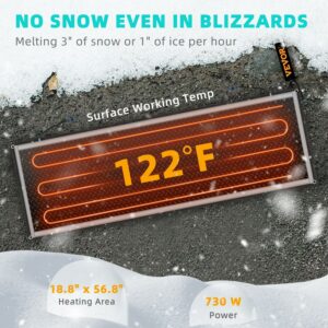 – Keep Your Walkways Snow-free: Rather than waste time hurting your back and spreading salt on snow by yourself, why not make life easier, and choose our 20″ x 60″ snow melting mats instead It will clean your walkways quickly at a jaw-dropping snow-melting rate of 3 in/h and heating temperatures of 122 , ideal for most surfaces like concrete, asphalt, stone, and wood decks. Make this winter pain-free.