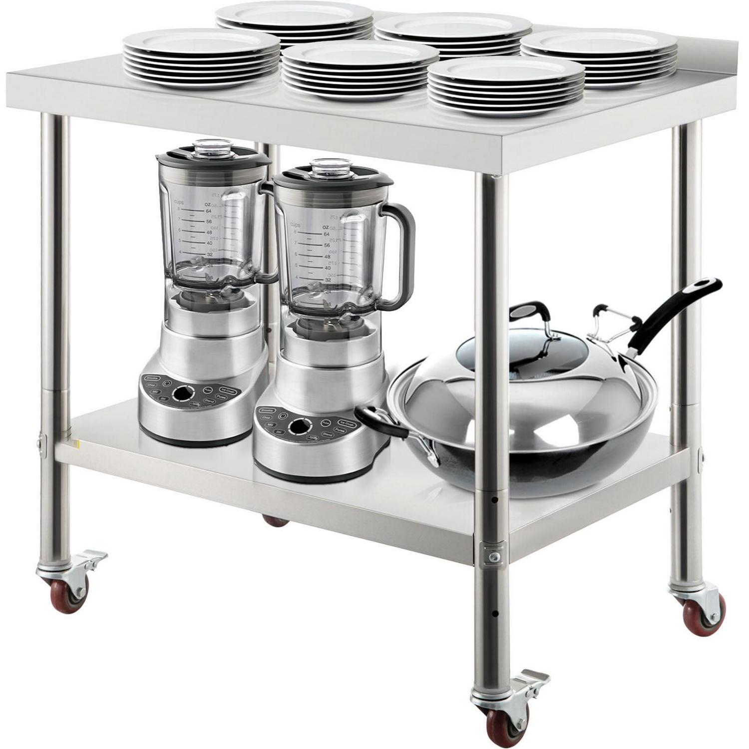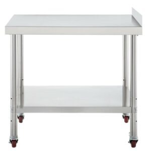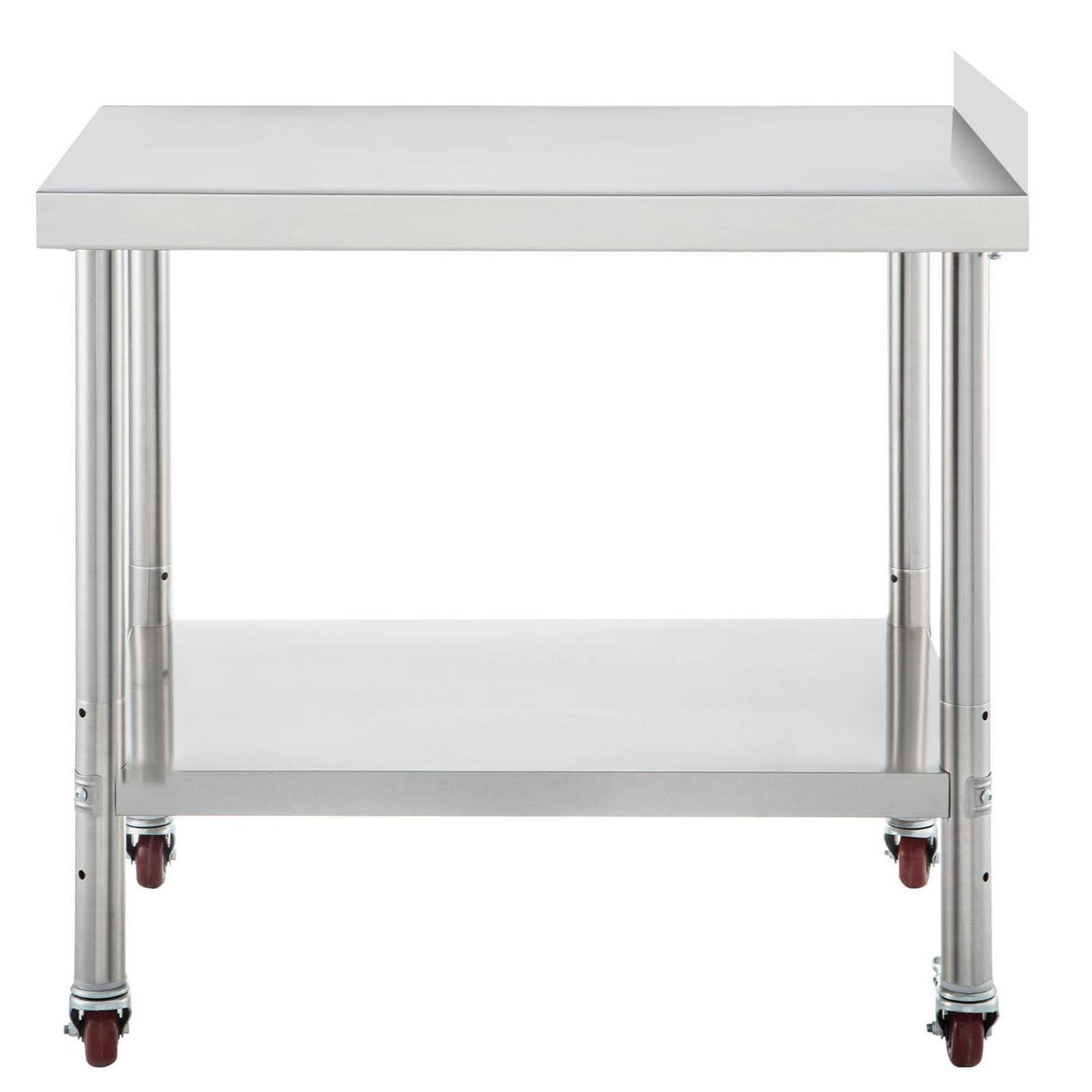 – Rock Solid Material: Our kitchen work table is made of 201 stainless steel material, ensuring that it s rust-proof, corrosion-proof, and easy to clean. With the wire-drawing surface, this table offers a beautiful appearance, is not easy to scratch, and hardly leaves water stains. The 2-inch high backsplash is equipped to keep the items from falling. The smooth edges can keep your hand from getting hurt. Besides, the 4 flexible casters (2 with brakes) are well-designed for moving conveniently.