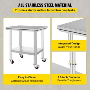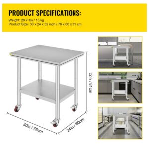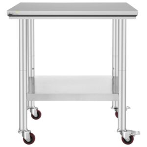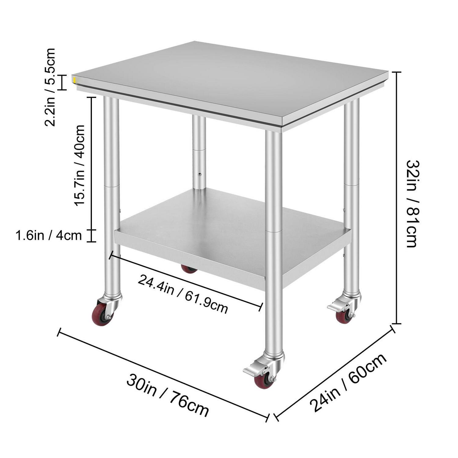 Superior commercial work table. Constructed by durable stainless steel, corrosion, and wear-resistant; It won’t deform easily. 30 x 24 x 2.2 in upper table size and 24.4 x 18.1 x 1.6 in undershelf provide ample storage space. 4 chaster wheels provide flexibility. You can easily change the height of the undershelf perfect using in the kitchen, restaurant, school, or other domestic or commercial applications.