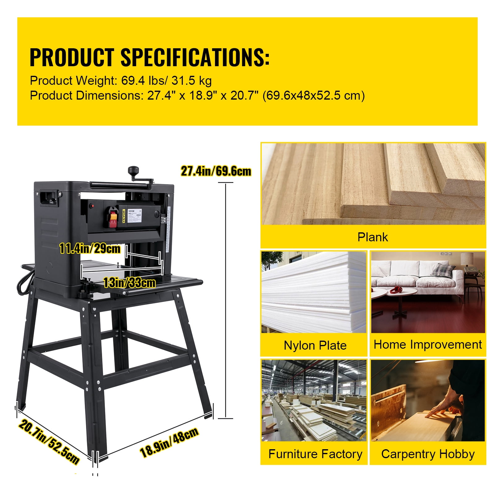 Product Description 13-Inch Thickness Planer This 13-inch thickness planer re-purposes old, weathered, rough, and worn wood to give it an extraordinarily smooth finish. The powerful 1800W motor can efficiently plan at a 236″/min (6 m/ min) feed rate. They are combined with a heavy-duty stand to prevent the planer from walking or wobbling during operation. It also features a dust exhaust interface for connecting to the dust collector, creating a clean working environment. It is an ideal tool for bringing your worn boards back to life! Specifications Model: M1B-LS-3301 13″ Power: 1800W Material: Iron + Stainless Steel + Aluminum + ABS Max. Cutting Width: 13″/ 330 mm Cutting Thickness: 0.2″-6.3″/ 6-160 mm Feeding Speed: 236″/min (6 m/ min) Max. Cutting Depth: 0-0.1″ (0-3 mm) Blade Speed: 8000 rpm AMP: 15 AMP Product Size: 20.7 x 18.9 x 27.4 inch/ 52.5 x 48 x 69.6 cm Work Table Size: 12.5 x 11.4 inch/ 31.8 x 29 cm Weight: 69.4 lbs/ 31.5 kg Voltage: 110V Package Content 1 x Thickness Planer (with 2pcs double cutter blades pre-positioned) 1 x Stand 1 x Set of Accessories (Foot Pads, Iron Dust Cover, Nuts)