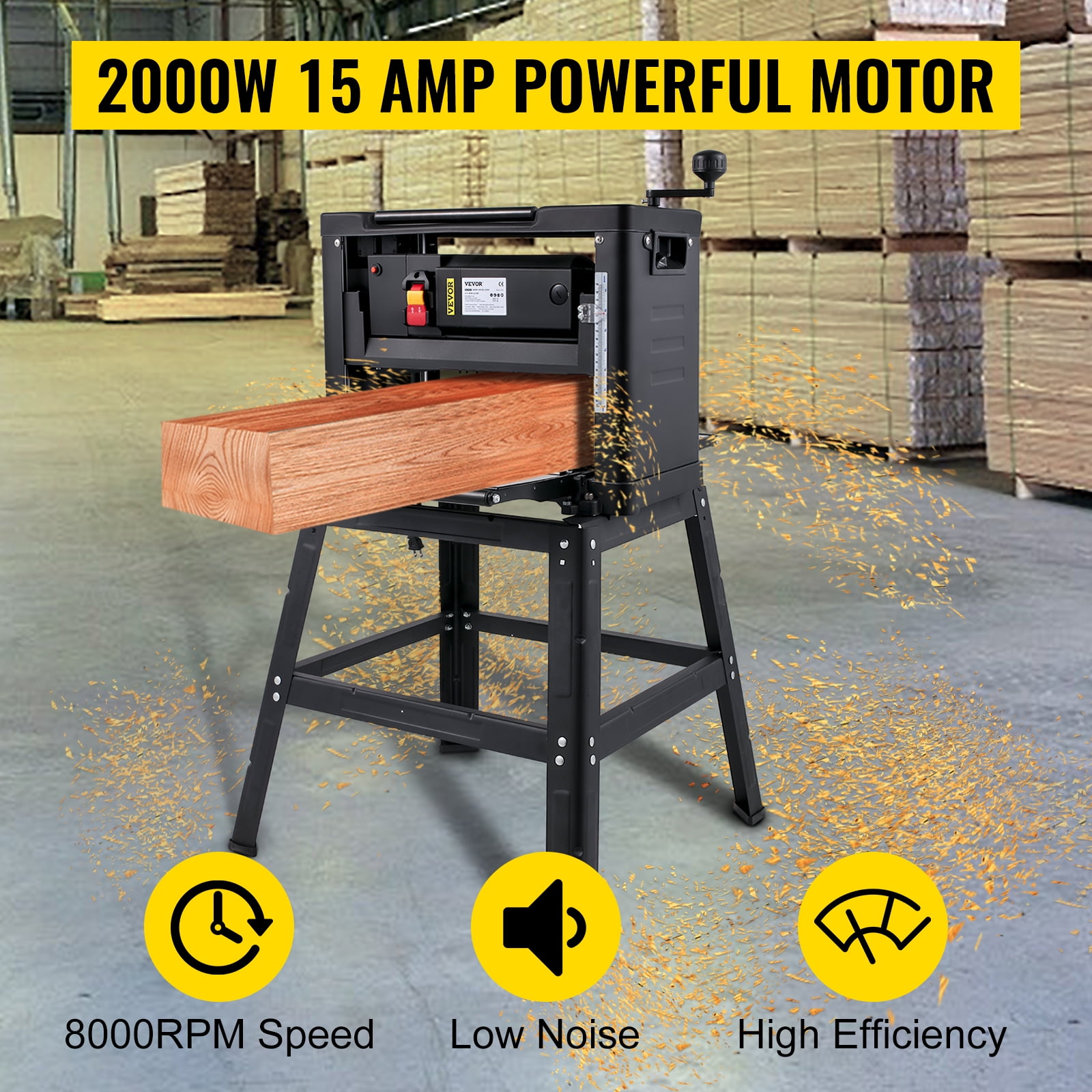 【POWERFUL THICKNESS PLANER】 – Our 2000W 18-AMP high-power thickness planer (8,000 RPM cutter head speed) handles larger cuts in broader materials with ease. It is 236″/min(6 m/min) in feeding speed, 13″(330 mm) of max cutting width, 0-0.12″(0-3 mm) of planing depth, and 0.24″-6.3″(6-160 mm) of planing height for excellent performance. 【FOLDABLE WORKBENCH & STAND】 – The benchtop planer is equipped with foldable tables & a detachable stand for extra operating space. You can adjust both tables to get the appropriate angle for smoothly feeding boards. And the automatic feeding design is available, able to auto-feed the materials to facilitate effective and secure works. 【HASSLE-FREE TO OPERATE】 – It is hassle-free for you to adjust the height of the cutter head with a comfortable crank handle. Besides, the scale indicates the thickness of the board being machined so that you can precisely control the required thickness to meet your different needs. 【USER-FRIENDLY DETAILS】 – The wood planer comes with thoughtful details for your security and long-term use. The dust exhaust interface, an electromagnetic switch, two return rollers, and carrying handles ensure a stable & reliable working environment for a wide range of professional and DIY woodworking projects. 【WIDE APPLICATION SCENARIOS】 – The woodworking planer is your ideal option for planing old, weathered, rough, and worn wood, giving it an extraordinarily smooth finish. It is widely applicable to processing materials as wood, bamboo, lining nylon, etc.