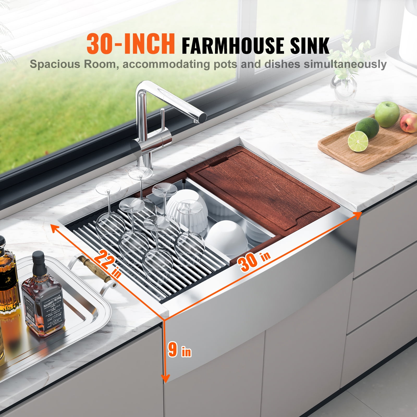 Product Description Multifunctional Farmhouse Sink A practical and elegant multifunctional farmhouse sink, adding aesthetic value to your kitchen and optimizing your dishwashing experience! Holistic Improvement Compared to conventional sinks, we’ve enhanced various aspects like size, material, accessories, appearance, and details of the sink. We assure you won’t regret choosing it. Rich Accessories We’ve provided a plethora of accessories for you. You can assemble and move these accessories on the tiered structure of the kitchen sink, allowing operations like chopping and draining. Plus, it extends more counter space for you. Durable & Long-Lasting Addressing common sink issues like being easily scratched or rusted, our drop-in sink has upgraded materials, additional accessories, and meticulous craftsmanship, significantly reducing the chances of these problems and making post-use cleaning and maintenance convenient. Easy to Install We’ve broken down the measurement and installation process for this farmhouse sink into steps. You can refer to pictures for guidance and seamlessly complete the installation. Three Drainage Designs With it’s X-shaped water guide and slightly sloped bottom, water retention is avoided. Paired with a large diameter drain, it solves problems of slow drainage and water accumulation. Aesthetic and Functional The single bowl basin features a streamlined front barrier design, offering an impressive visual effect. When you or your guests step into the kitchen, it’s bound to catch the eye. Moreover, it aligns with ergonomic principles, ensuring effortless operation. Specifications Item Model Number: TXHW302209RS1 Primary Material: 304 Stainless Steel Item Size: 30x22x9 inch / 762×558.8×228.6 mm Net Weight: 15.65 kg / 34.5 lbs Standard Drain Opening: 3.5 inch Package Content 1 x Farmhouse Kitchen Sink 1 x Chopping Board 1 x Drying Rack 1 x Drainer Basket 1 x Protector 1 x Strainer 10 x Clamps 10 x M6x26 Hex Screws