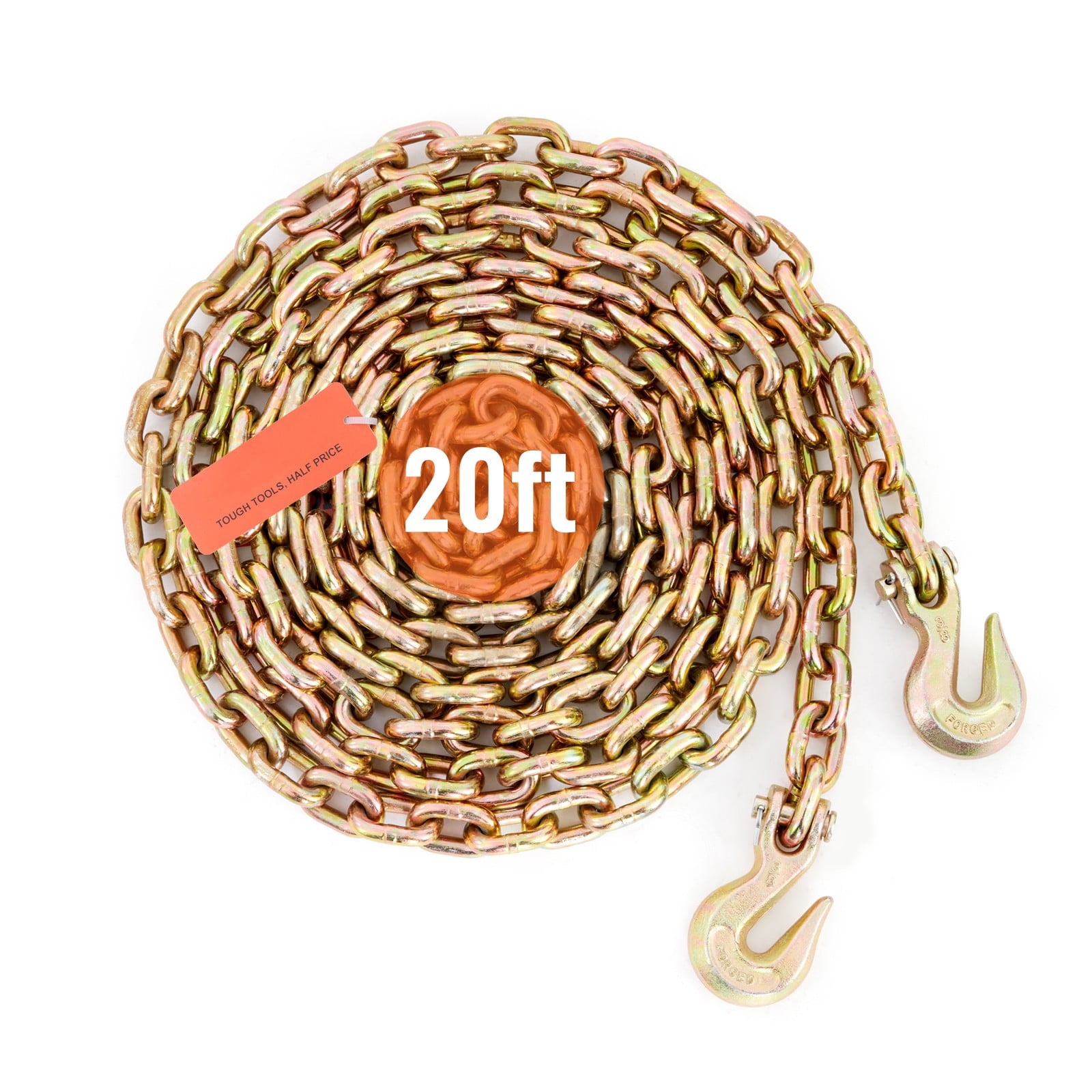 Product Description Binder Chain with Hooks BENTISM, your exclusive tool expert. This binder chain is made of high-quality steel and has passed Grade 80 DOT certification. It also has alloy steel grab hooks to better grip large cargo. The diameter of the chain is 3/8 inch, and the length is 20ft can firmly fix heavy items. It’s the ideal option for transport. Strength Grade The chain is made of G80 manganese steel, meeting DOT related requirements. Chain Diameter The high-brightness alloy steel chain has 7100 lbs load capacity. Chain Diameter: 3/8”. The chain has 4:1 security factor, and the limit load is 4 times larger than the safety load. Surface Treatment The chains and hooks are all galvanized, beautiful and rustproof. Easy-to-use Size Chain Diameter: 3/8 inch; Chain Length: 20 ft. It is suitable for handling and transporting various heavy objects, ensuring the secure arrival of products. Critical Coating The galvanized chain is beautiful and rustproof, which is fearless of rain. Wide Applications To meet all your needs, the transport chain is designed for the secure binding, towing, and transportation of goods, suitable for factories, construction sites, mining activities, ports, and so on. Specifications Chain Length: 20 ft Chain Diameter: 3/8 inch Product Surface Treatment: Galvanized, Color Product Weight: 32 lbs / 14.5 kg±3% Main Material: Manganese Steel, G80 Secure Load: 7100 lbs Package Content 1 x Binder Chain 1 x Manual