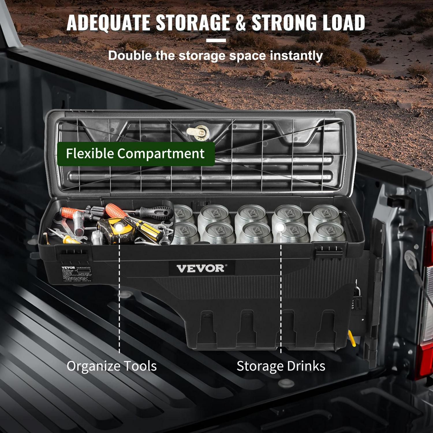 The truck bed storage box can be put on the driver or passenger side, giving you plenty of space for your trip needs. Slides in and out conveniently. There s no need to climb up into the bed like most boxes require.