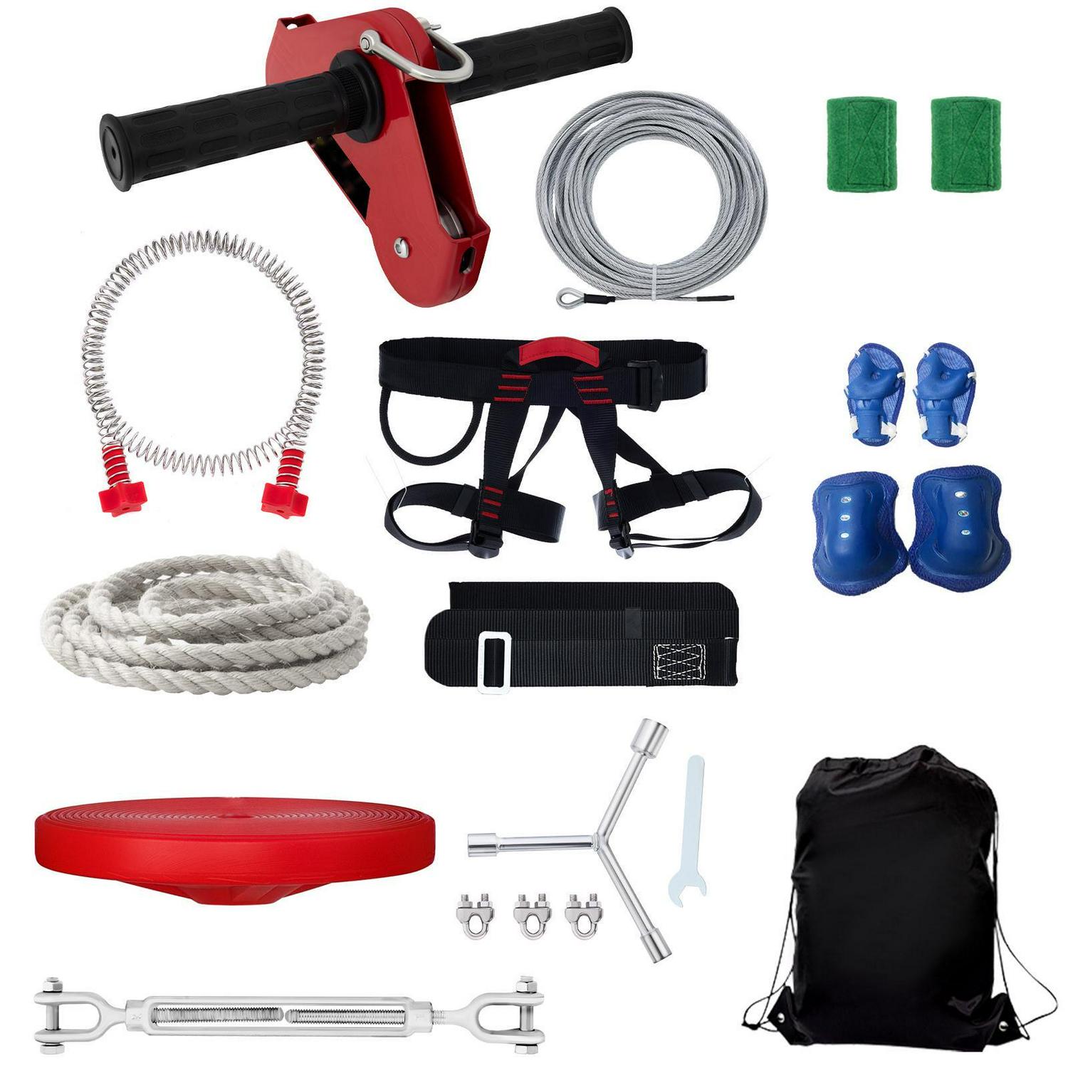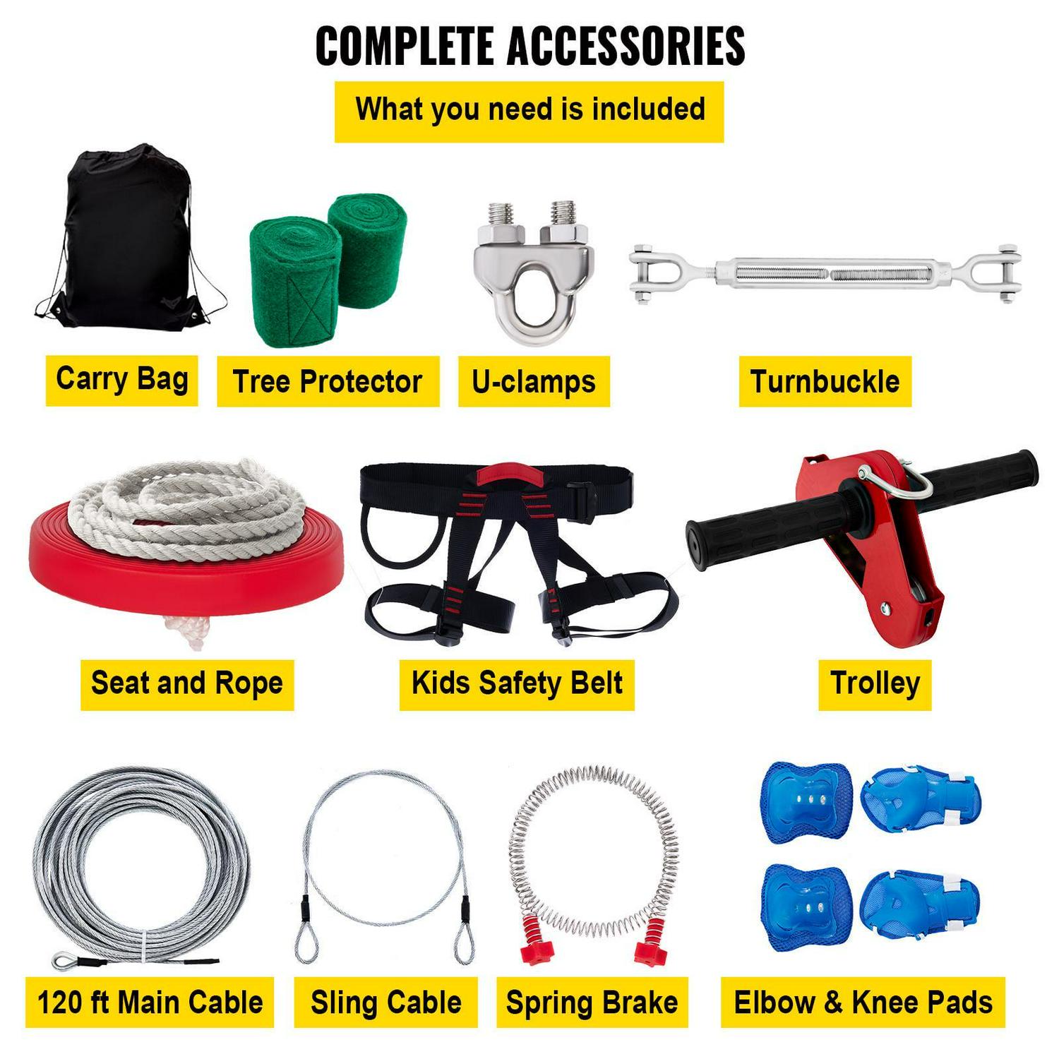 – Spring Brake & Trolley: Our zipline kit includes a 6.3-foot stainless steel spring brake as the braking system, so the zipper will not stop suddenly to ensure security. The trolley is made of iron, equipped with an anti-skid bearing and a long wear-resistant pulley firmly fixed on the cable.