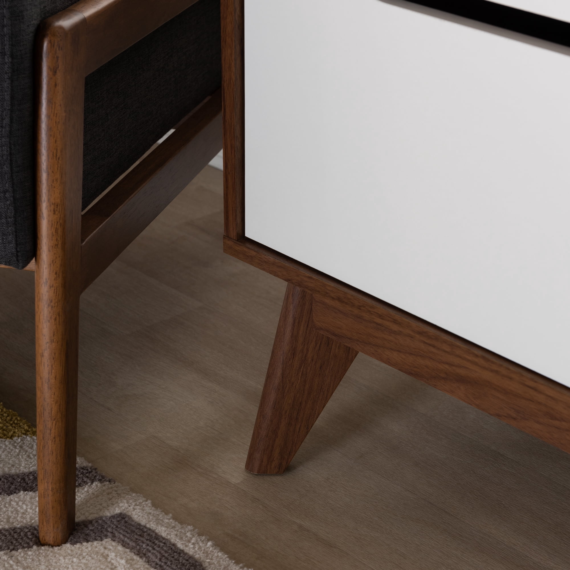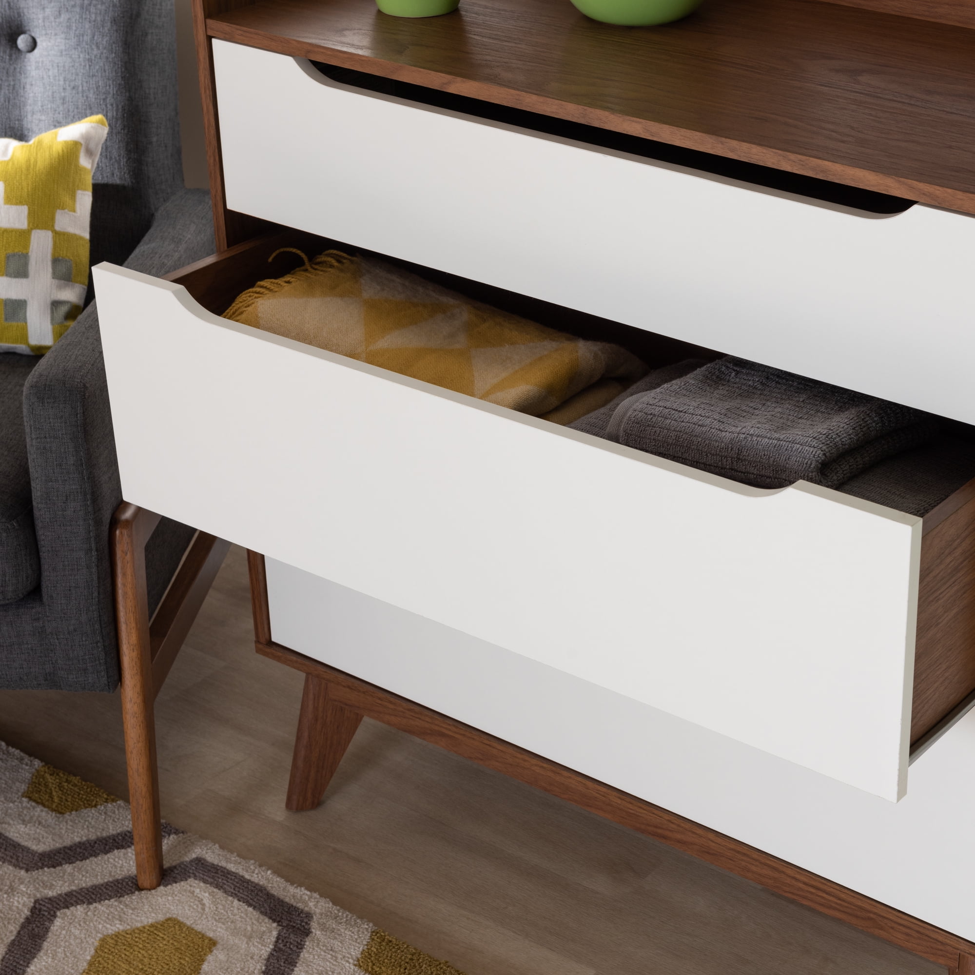 Bellamy Studios Benton 3 Drawer Storage Chest, White and Walnut Mid-century 3-drawer chest Three drawers with cut-out handles and a shallow top shelf reveal ample storage space Smooth drawer runner Engineered wood angled legs White drawers with walnut finished frame Finishing: two-tone in white and walnut Assembly required
