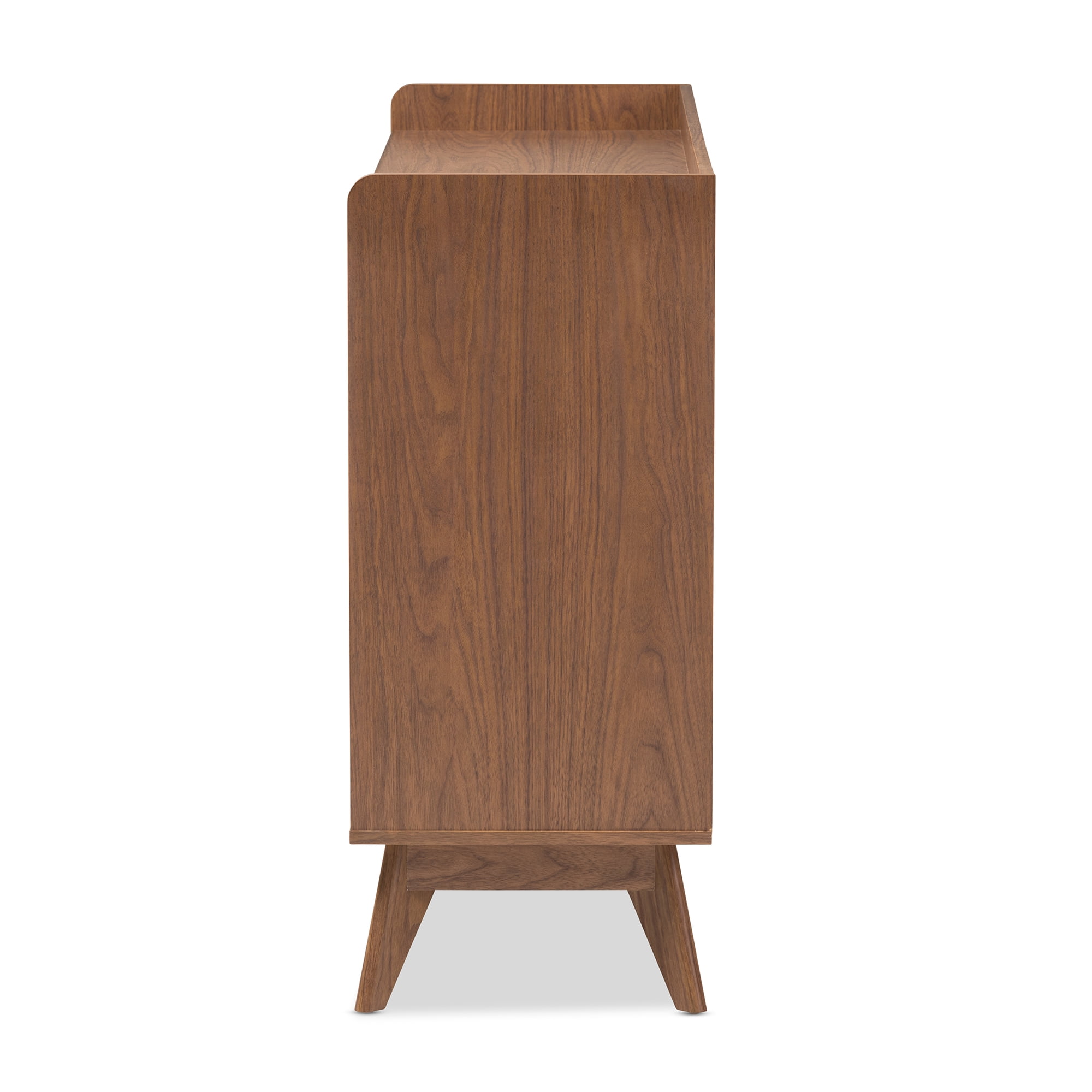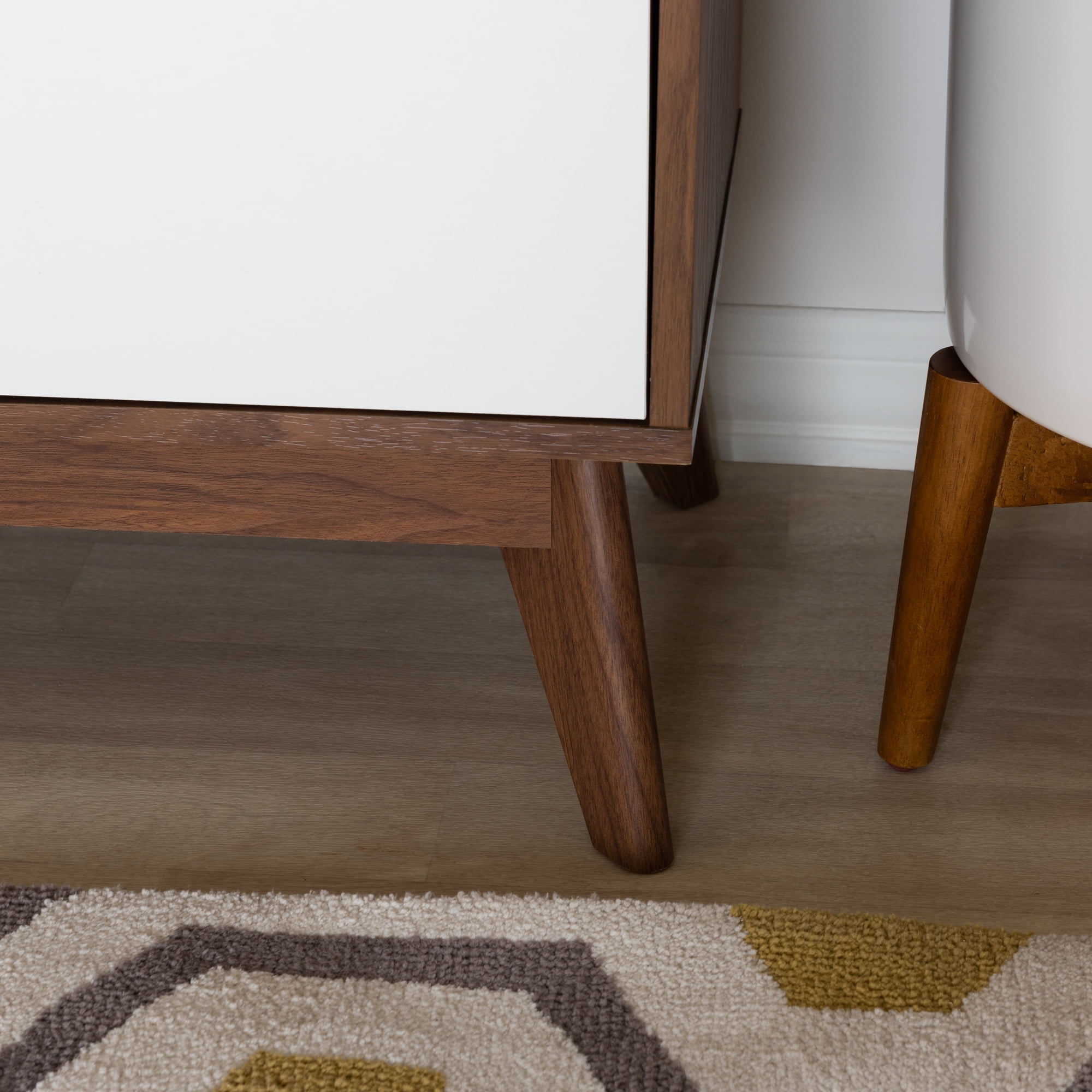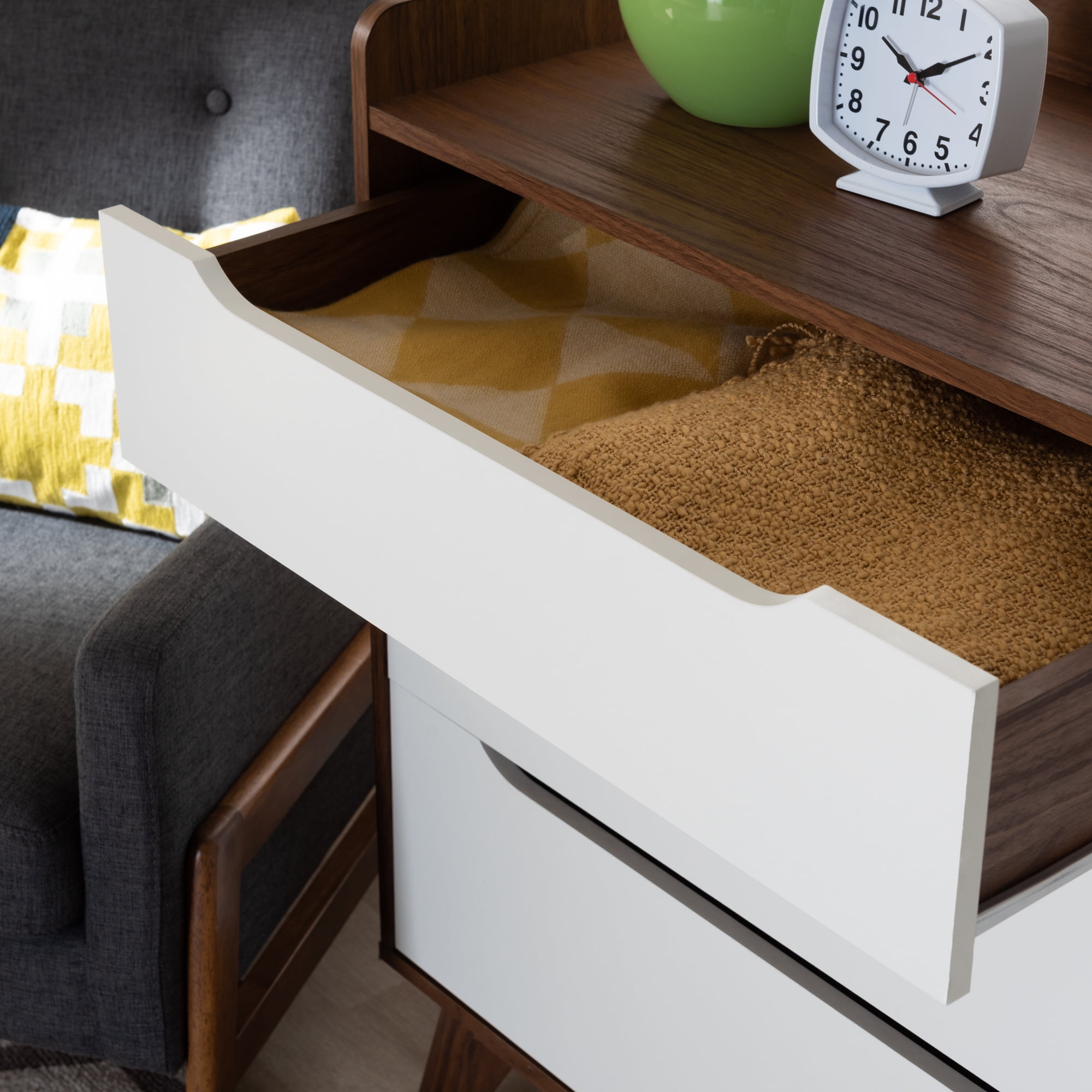 Mid-century 6-drawer chest Finishing: two-tone in white and walnut Smooth drawer runner Six drawers with cut-out handles and a shallow top shelf reveal ample storage space Engineered wood angled legs Assembly required Made in Malaysia