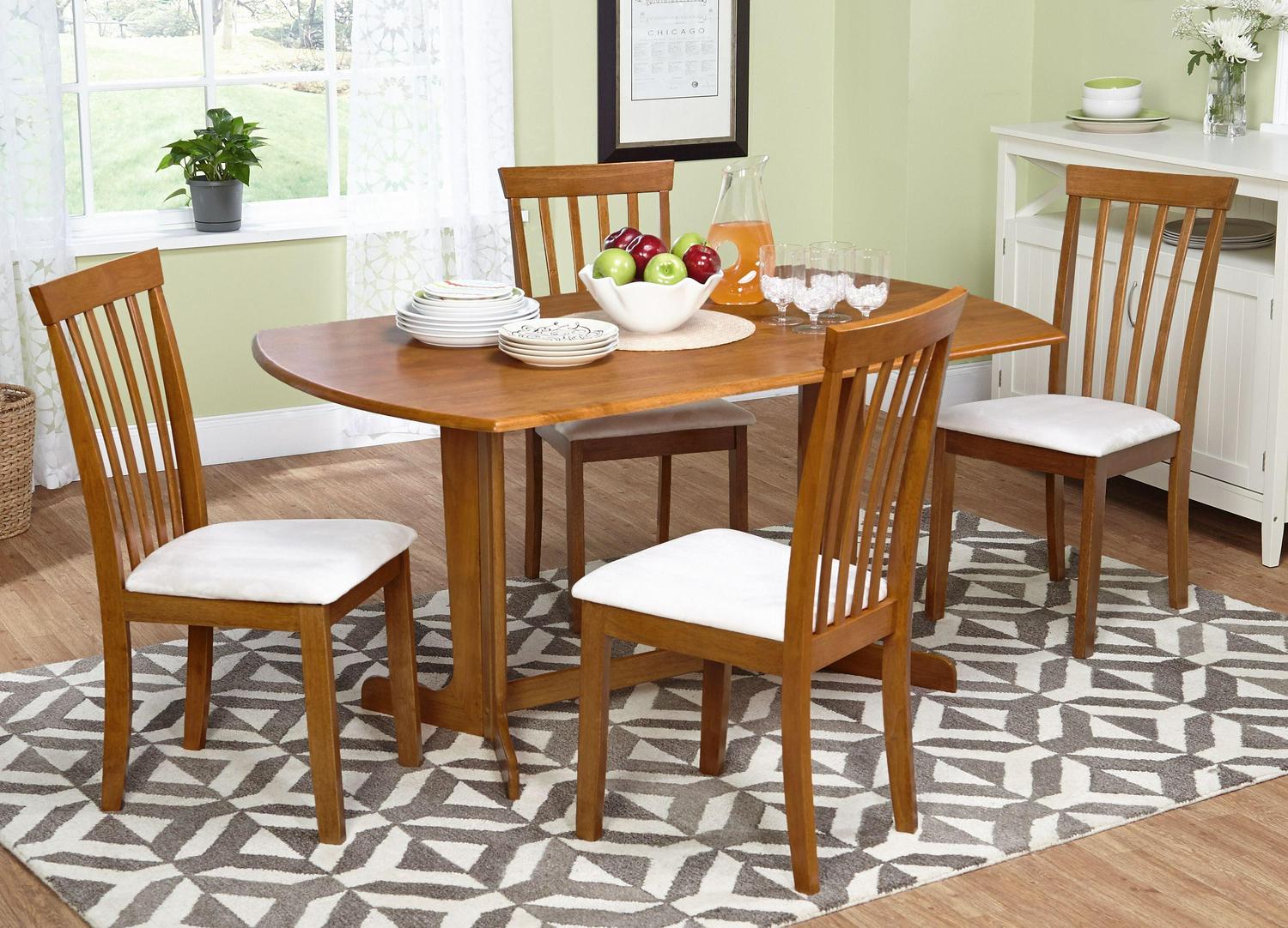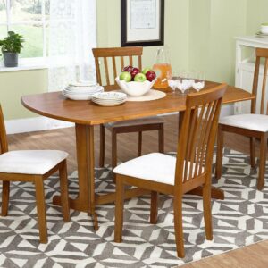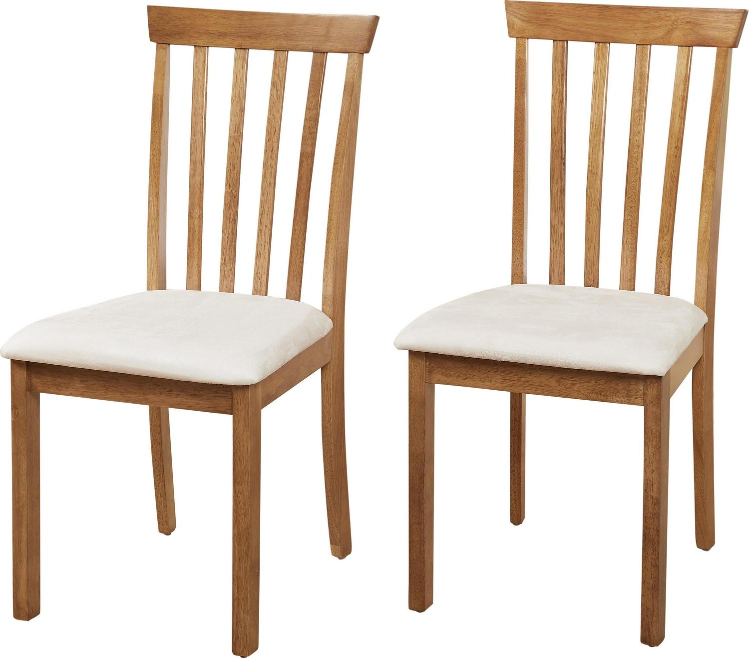 The Benton Dining Chairs feature a beautiful honey tone natural finish that complements any decor. Includes two chairs with light cream upholstered padded seats for extra comfort. Sturdy rubberwood construction. Finish: Honey Materials: Rubber wood Chairs upholstered in cream microfiber Slat back chairs Seat height: 18.5 inches Seat dimensions: 17 inches wide x 16.5 inches deep Chair Dimensions: 36.75 inches high x 17 inches wide x 21.25 inches deep