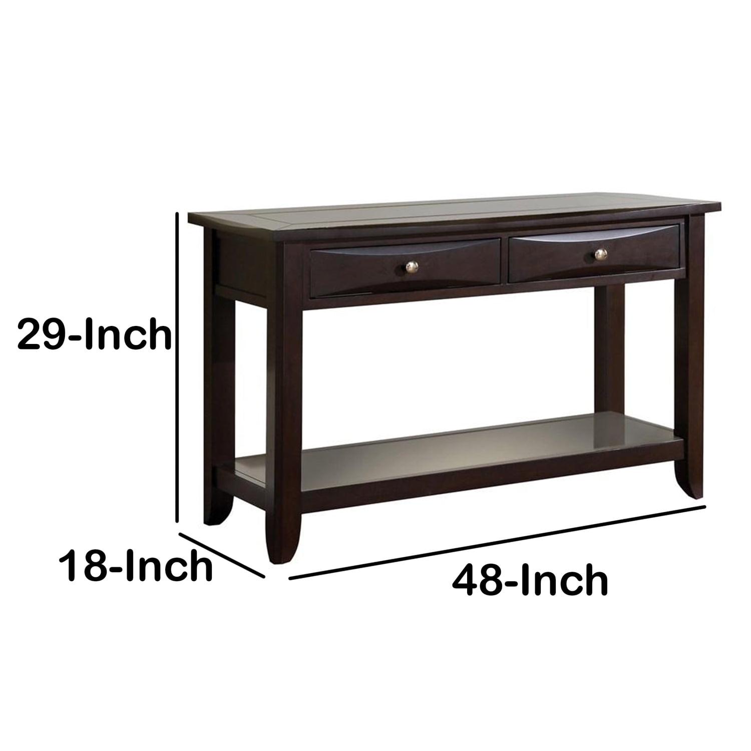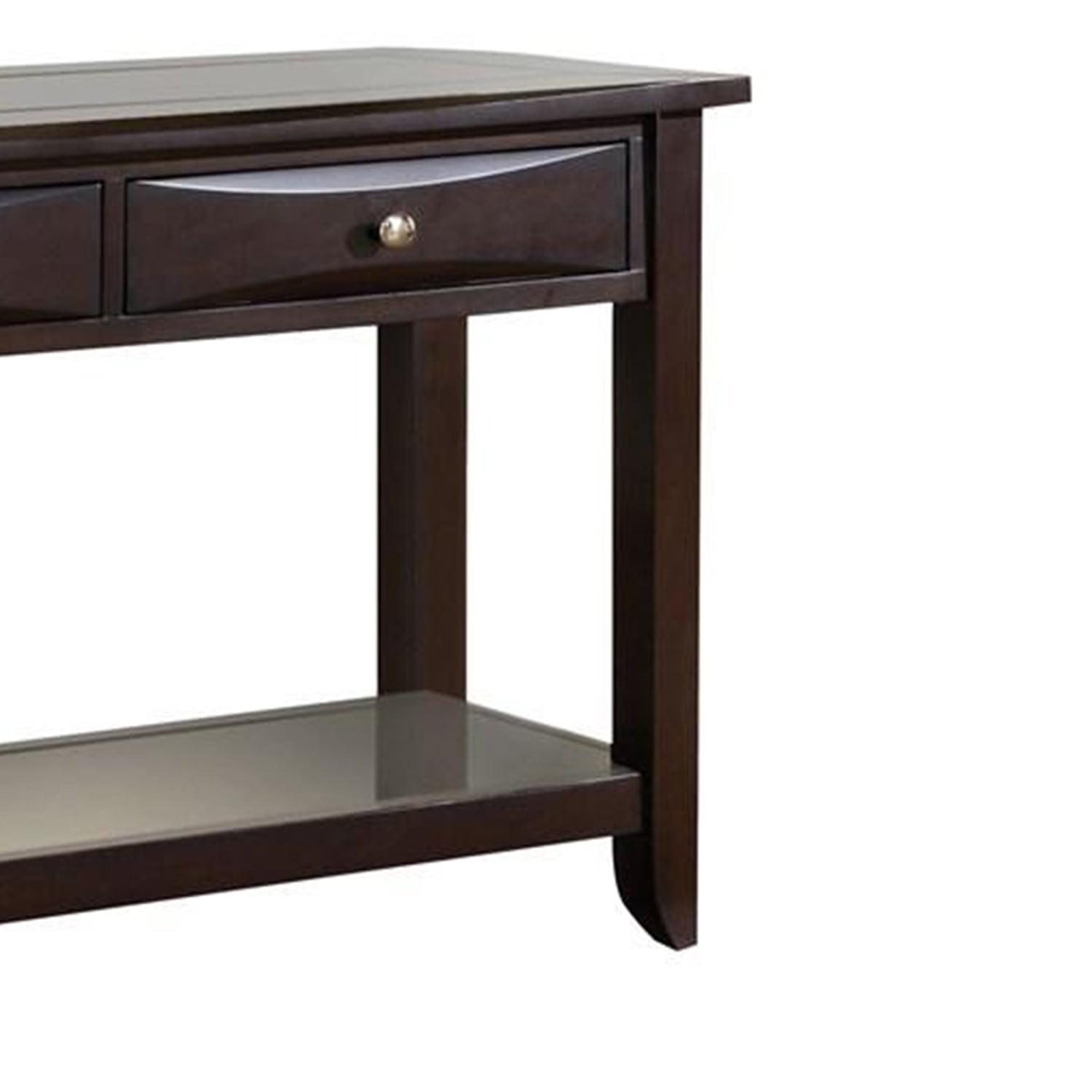 Faceted drawer fronts and tapered wood block legs give the Benzara Baldwin Style Sofa Table its contemporary silhouette. A rich espresso finish ensures this sofa table will work with any home décor. Style it in your front hall, entryway, or behind your sofa. Its spacious top and lower shelf provide two levels for display.