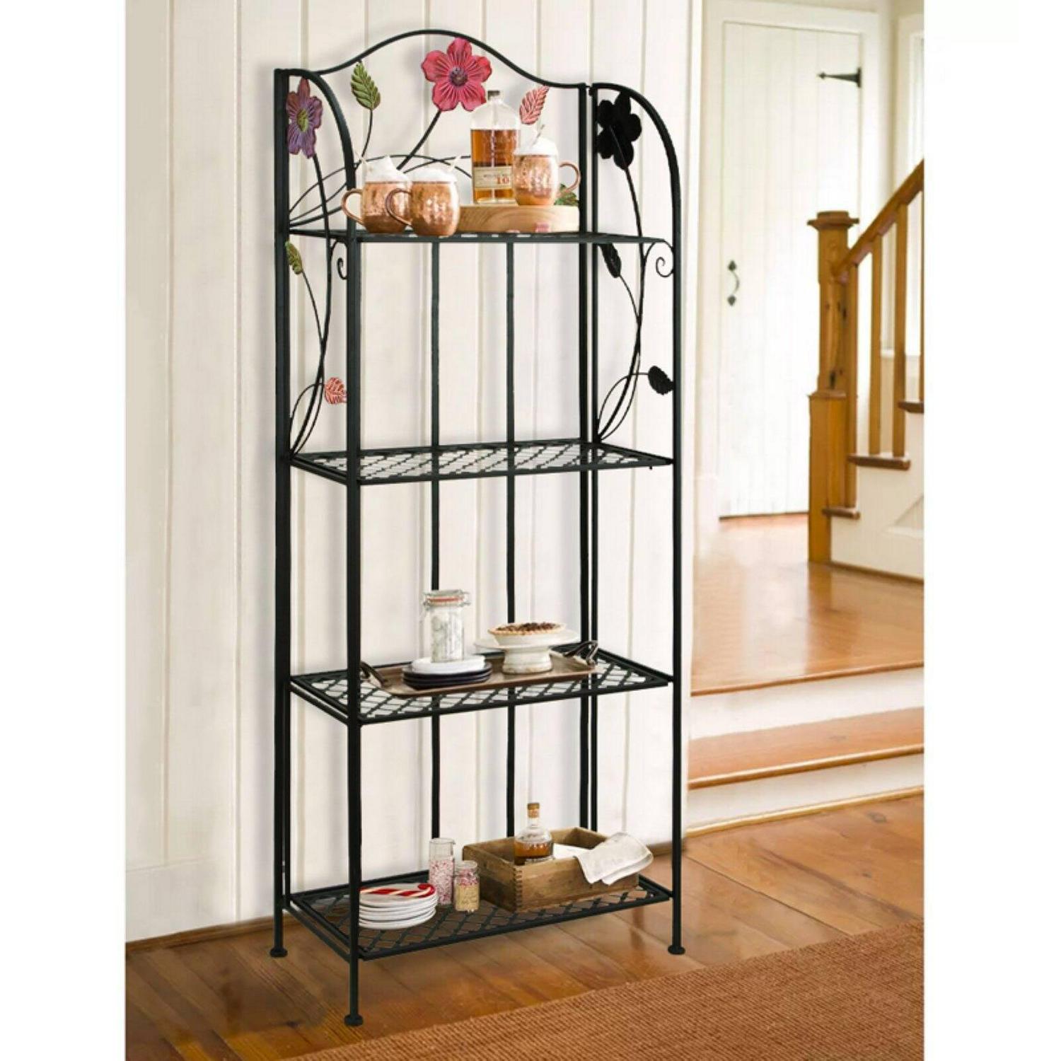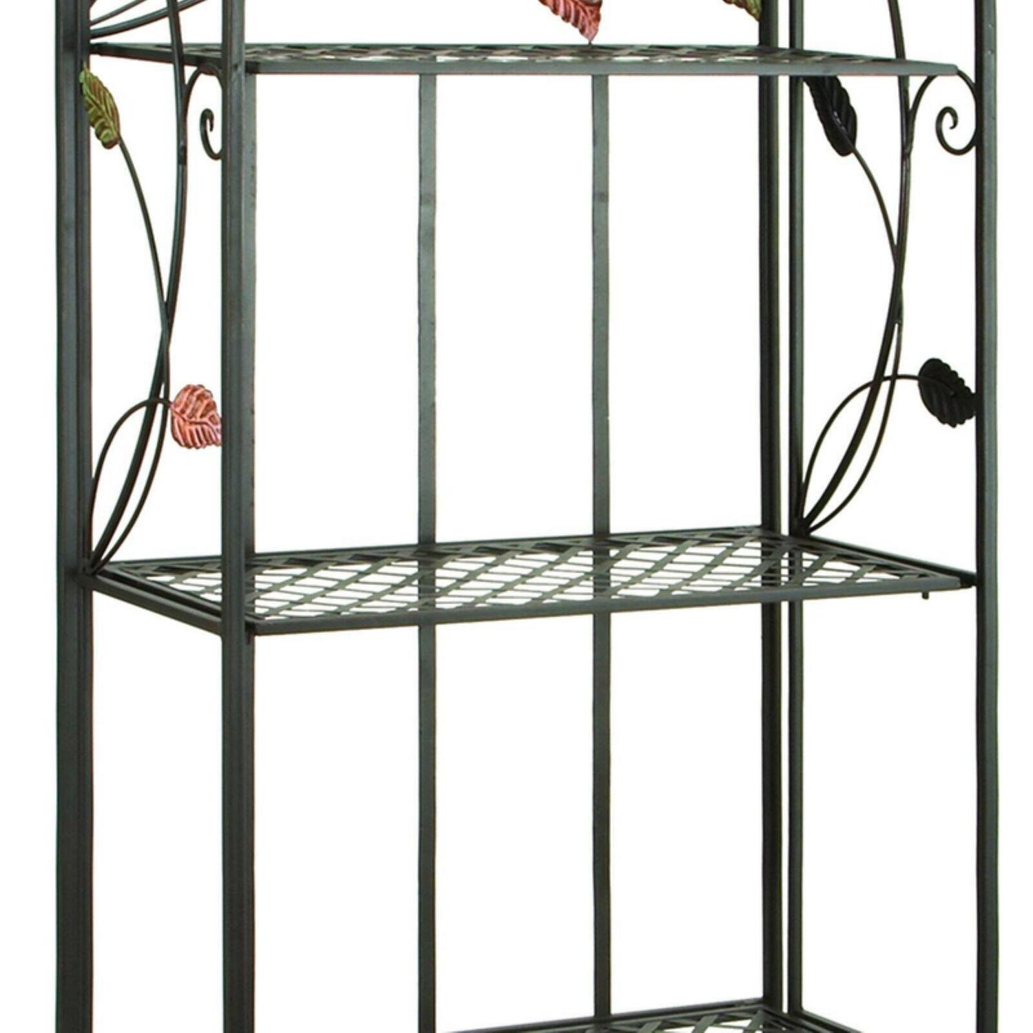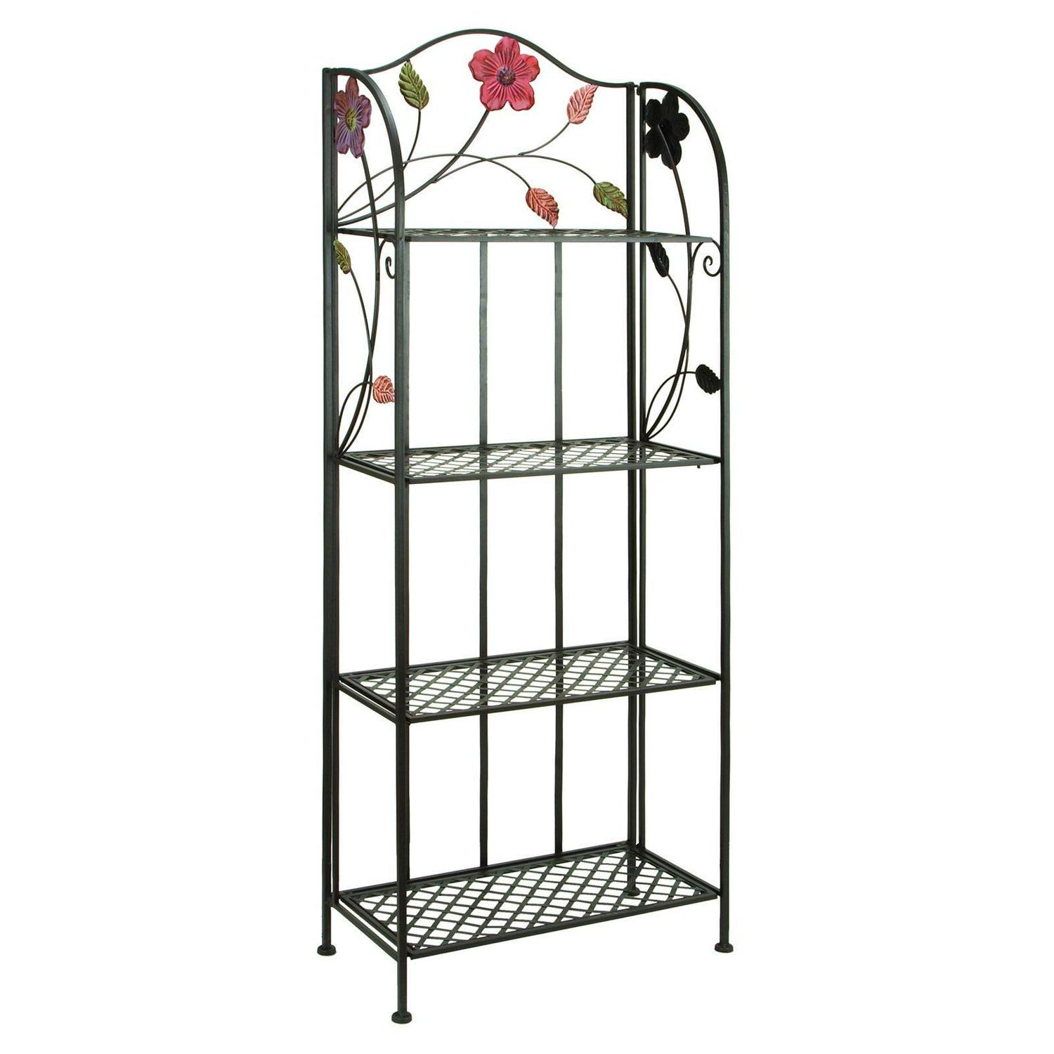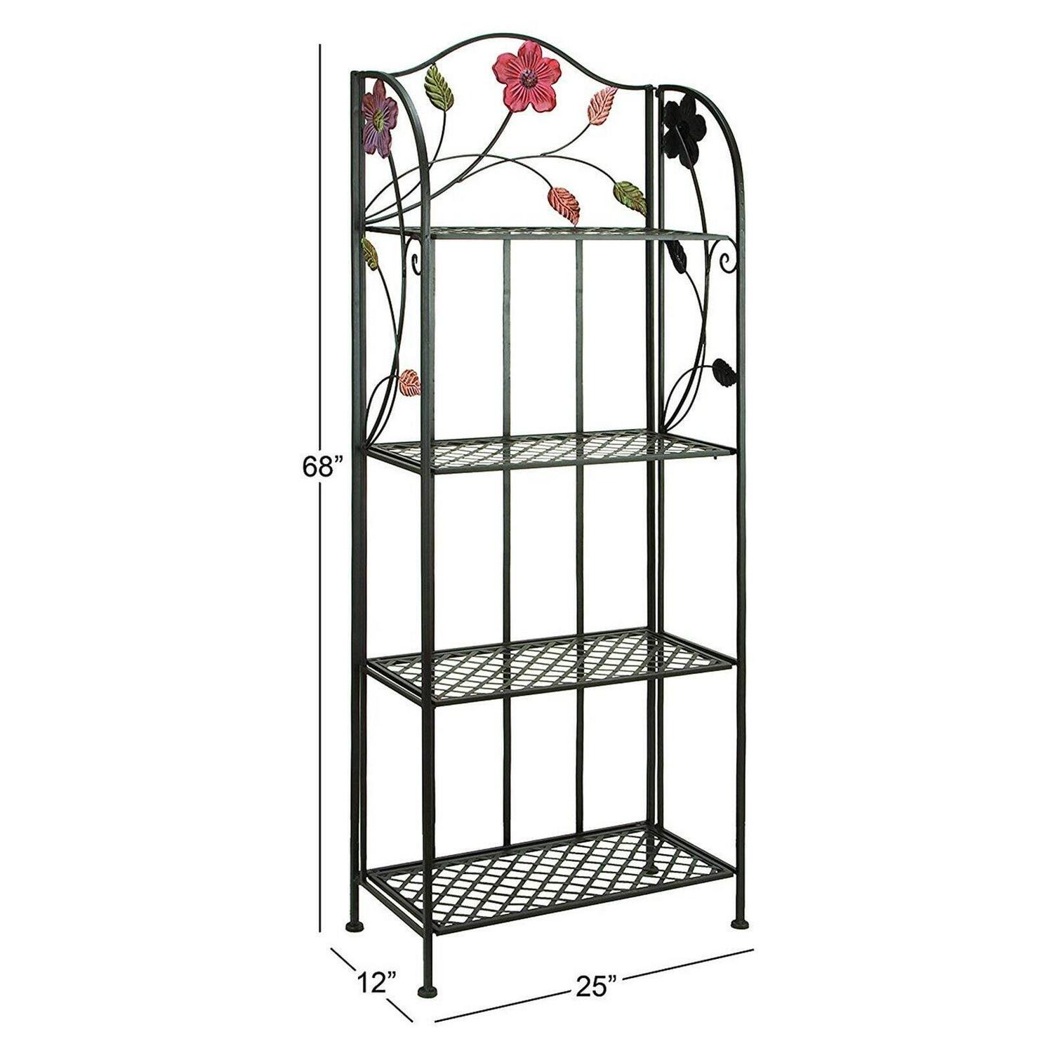 Four shelves with grid bottoms offer display for décor or space for storage baskets, food, dishes, and kitchen tools. Scrolled accents at the top feature large, vibrant flowers and leaves painted in various colors to add a little pizzazz to this bakers rack.