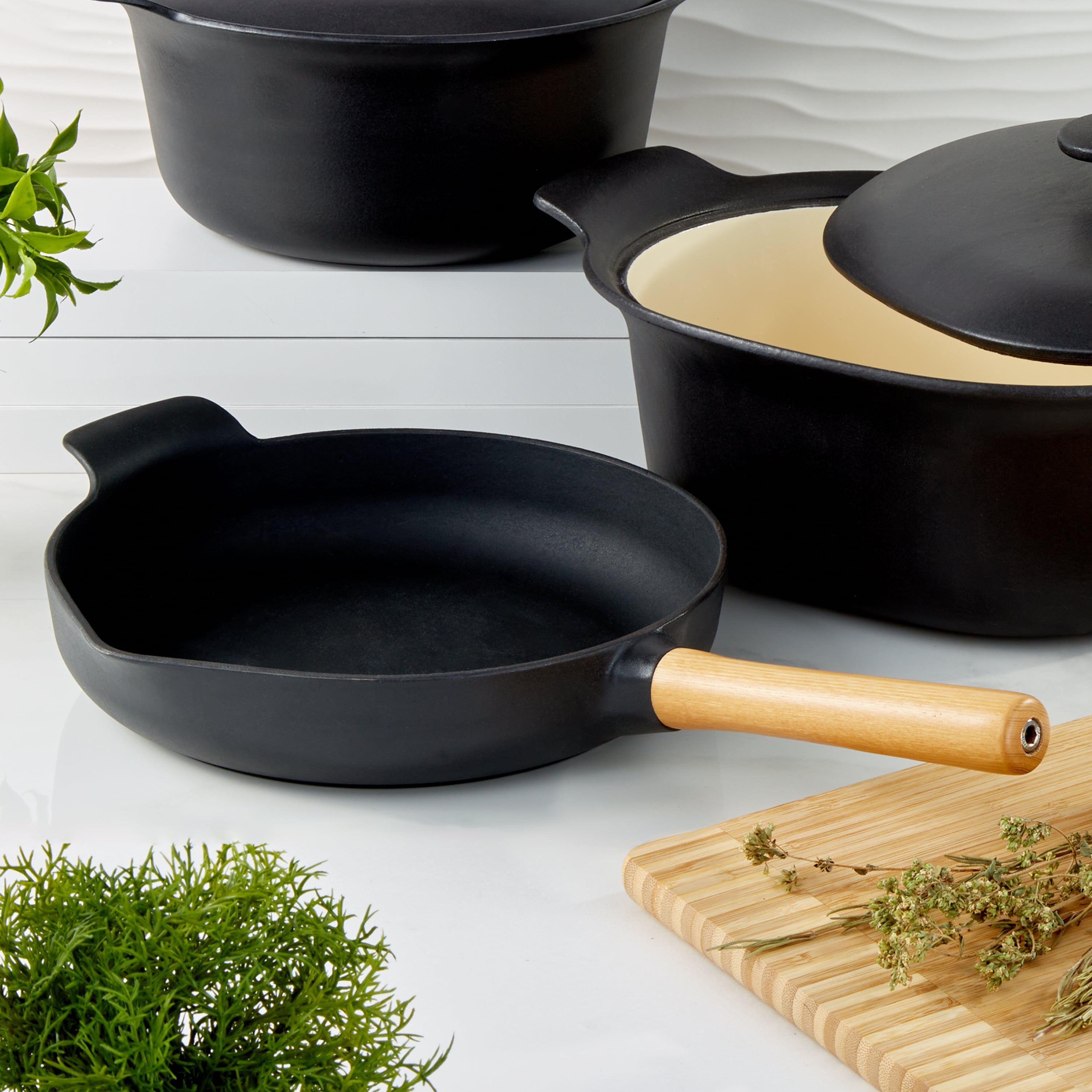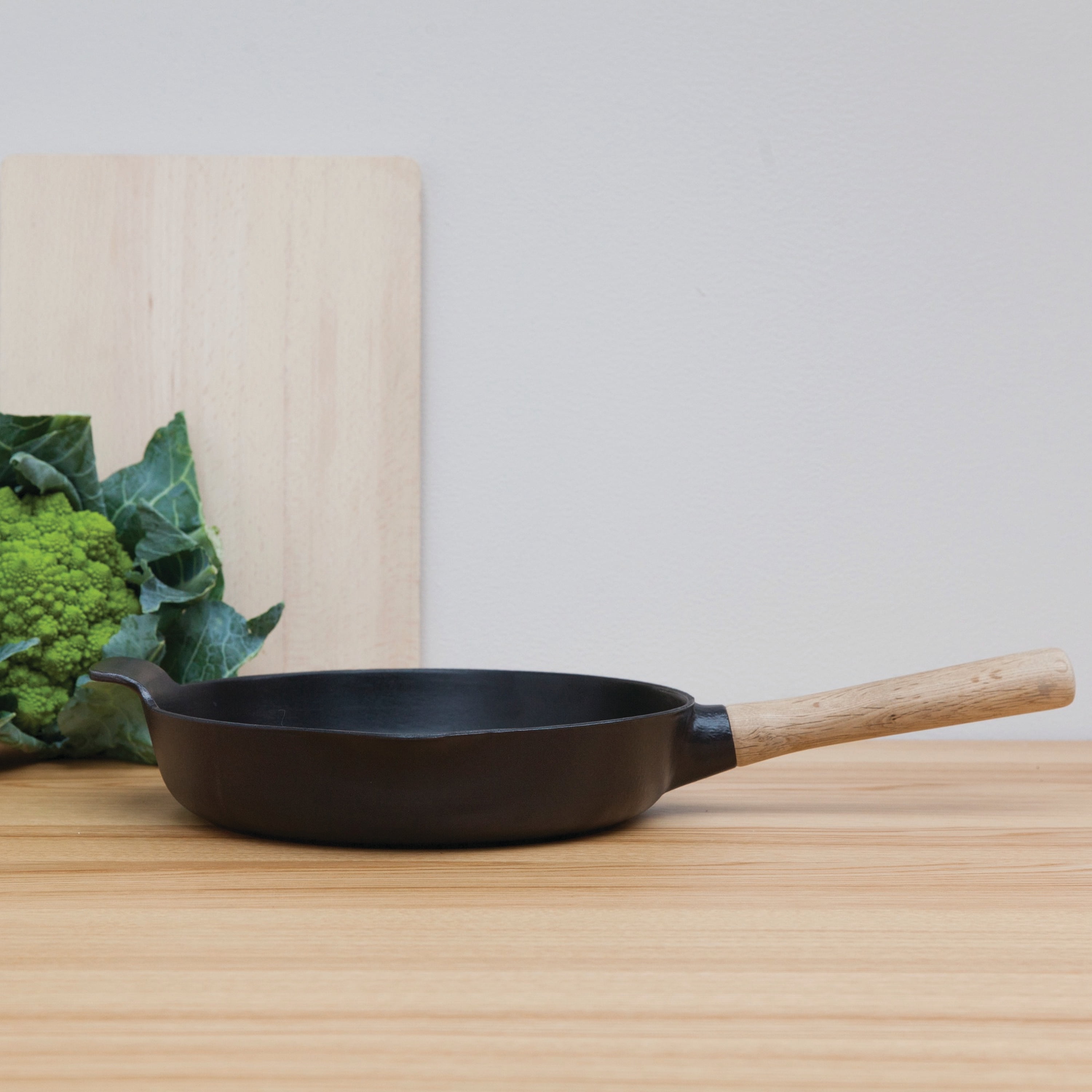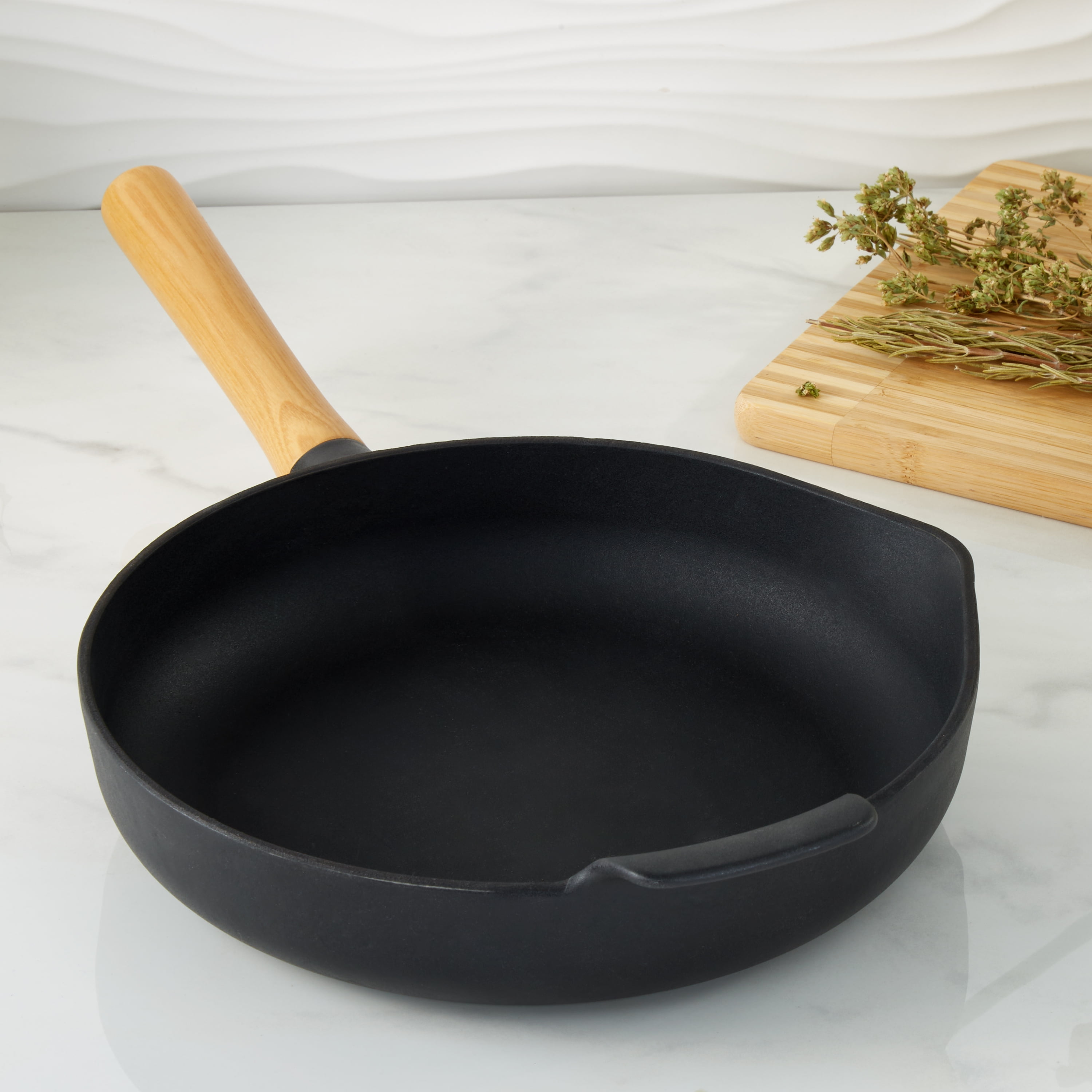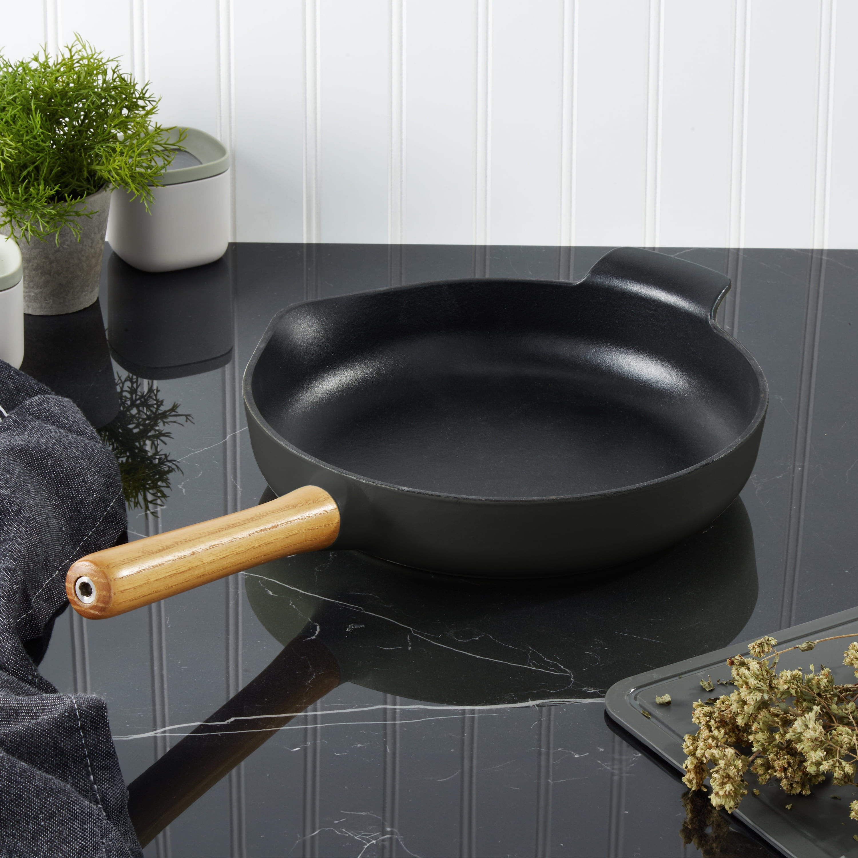 Package includes: Cast Iron 10.25″ Frying Pan 2.5 qt., Black Made of durable Cast Iron with Enameled interior, Safe grip handle, Long Wood Handle. Enameled interior. Cast Iron is best material for heat retention, steady and even heat ideal for slow-cooking, roasting, searing, stir-frying or baking. Smooth enamel interior resists staining and prevent sticking for easy cleanup. Wooden handle stays cool for a safe, secure grip. Built to withstand heavy use with a fast, simple cleanup. Oven-Safe up to 400°F. Ideal for all cook tops, induction, vitroceramic, gas, electric and halogen cook tops. Hand-wash recommended for long-lasting use. Allow to cool before washing. Avoid abrasive or steel wool, steel scouring pads or harsh detergent. Food residue and stains can be removed with a sponge or nylon scrubbing pad.