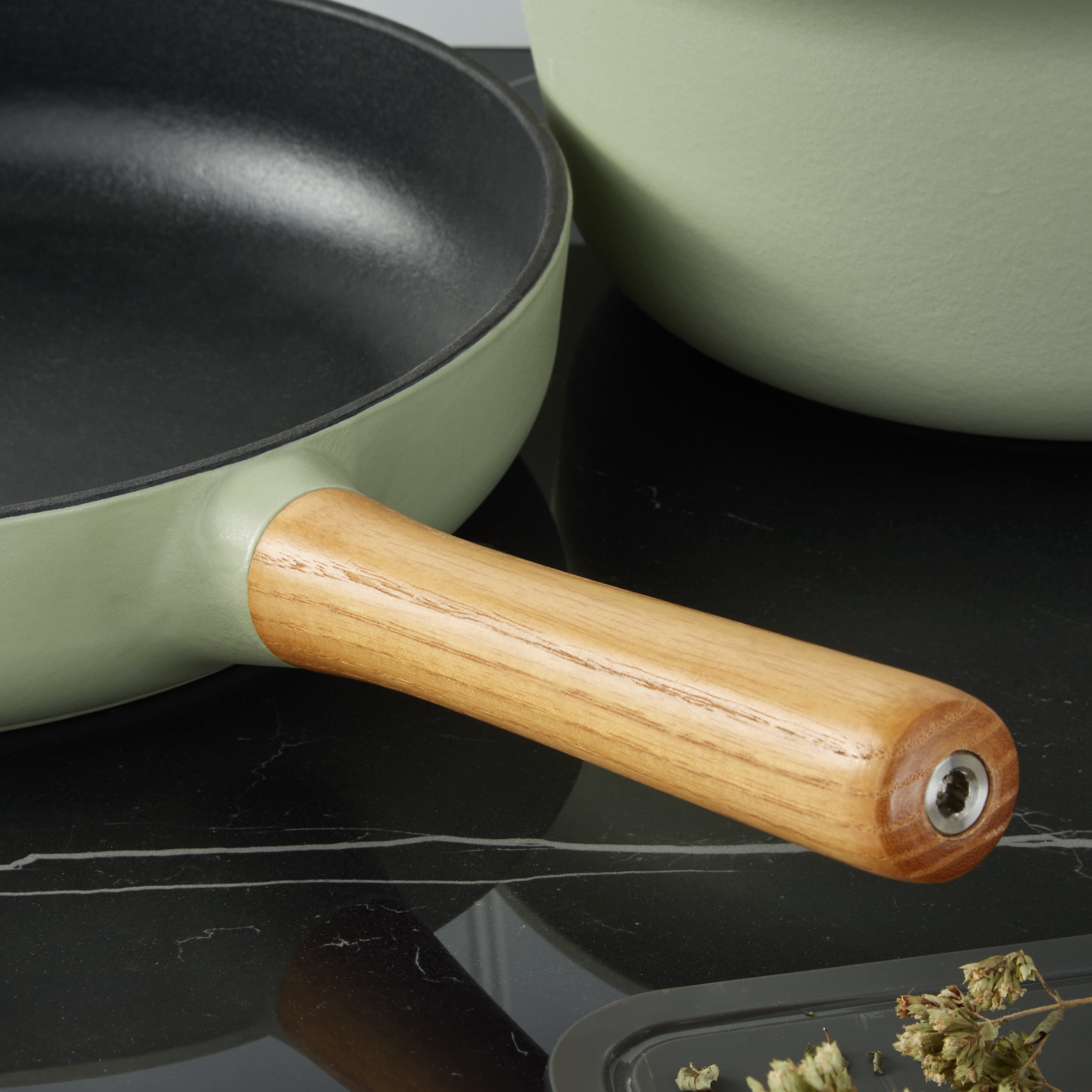 Package includes: Cast Iron 10.25″ Frying Pan 2.6 qt., Green Made of durable Cast Iron with Enameled interior, Safe grip handle, Long Wood Handle. Enameled interior. Cast Iron is best material for heat retention, steady and even heat ideal for slow-cooking, roasting, searing, stir-frying or baking. Smooth enamel interior resists staining and prevent sticking for easy cleanup. Wooden handle stays cool for a safe, secure grip Built to withstand heavy use with a fast, simple cleanup. Oven-Safe up to 400°F. Ideal for all cook tops, induction, vitroceramic, gas, electric and halogen cook tops. Hand-wash recommended for long-lasting use. Allow to cool before washing. Avoid abrasive or steel wool, steel scouring pads or harsh detergent. Food residue and stains can be removed with a sponge or nylon scrubbing pad.