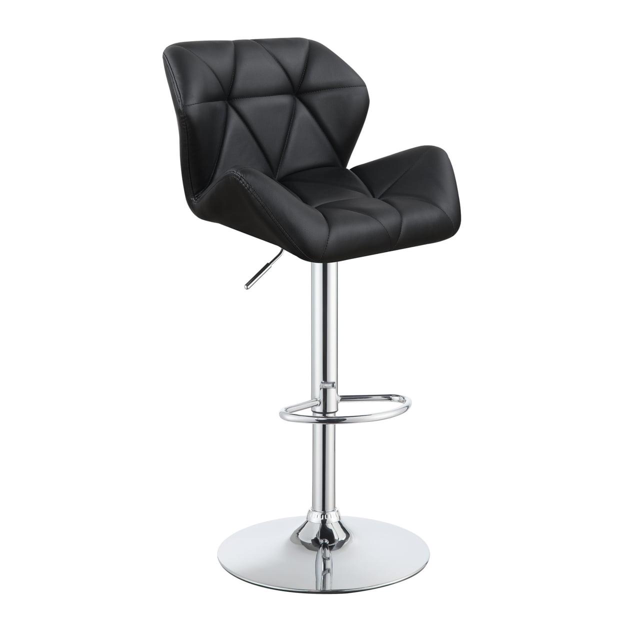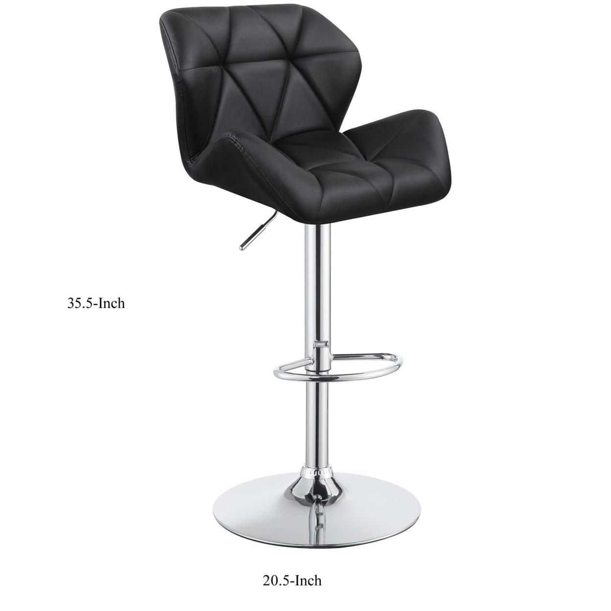 Adjustable Diamond Bar Stool with Chrome Base, Black ,Set of 2- Saltoro Sherpi The Diamond Bar Stools Exudes Minimalism With Unique Features. Incorporating Futuristic Style With Traditional Elegance, The Seat Is Upholstered In Black Faux Leather And Is Padded For Ensured Comfort. Featured On The Seat And Medium Height Backrest Is A Stitched Detailing That Creates Distinguished Diamond Shapes. The Height-Adjustable Swivel Seat Adjusts From Counter To Bar Height With The Help Of Handle Located Below The Seat. The Chrome( Silver) Footrest Supports Your Feet While Also Providing A Contemporary Design.