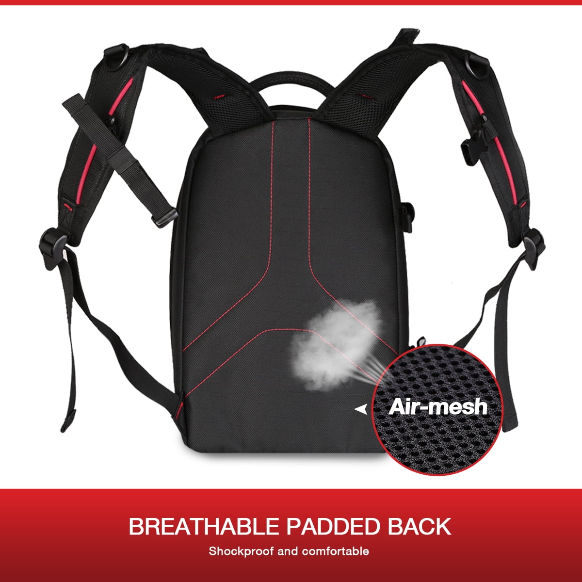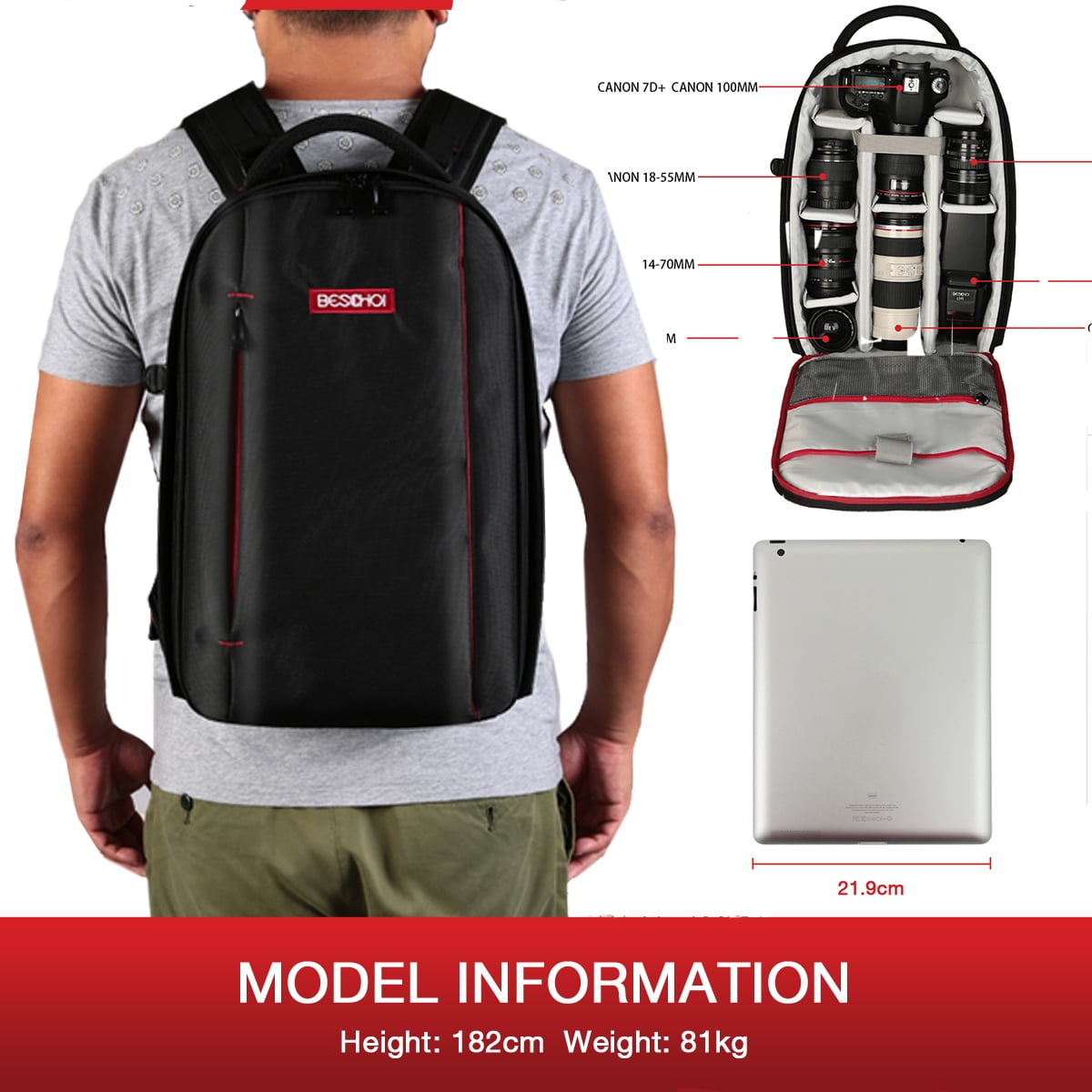 Dedicated compartment: Dedicated compartment for 13.3 “laptop/tablet, For products larger than 13.3 inches, please compare the pocket size with the laptop/tablet size to ensure proper fit External Tripod Attachment: The photographer backpack has the optional connection to attach a tripod externally. On the bottom of the tripod pocket, there is a mini zippered pocket for small items such as the SD card and keys. Attention: The length of the tripod must not exceed 55 cm Water repellent: A special coating applied to the fabric keeps it resistant to moisture. High-Performance Materials: Constructed of durable nylon, compact and safe, it resists bumps and scratches Hinge with Security Lock: There is a locking hook with a padlock (not included) on the main compartment Comfortable with Mesh Fabric: Adopt the knitted fabric in the part that comes into contact with the body to have good ventilation on the back, you can shoot comfortably even if you have already been standing for a long time Padded back for Extra Comfort: The straps and shoulder straps are fully adjustable in length to better distribute the weight and offer maximum flexibility and comfort Color: Black + Red; External size: 44 x 28 x 14 cm Net weight: 1.05 kg Material: Nylon (waterproof / wear-resistant / scratch-resistant / break-resistant fabric)