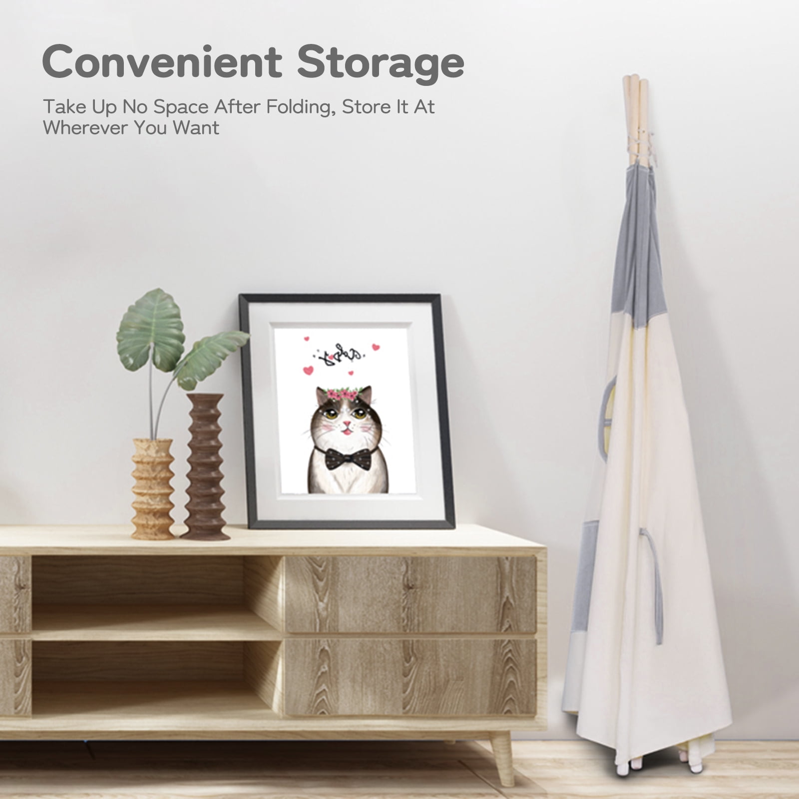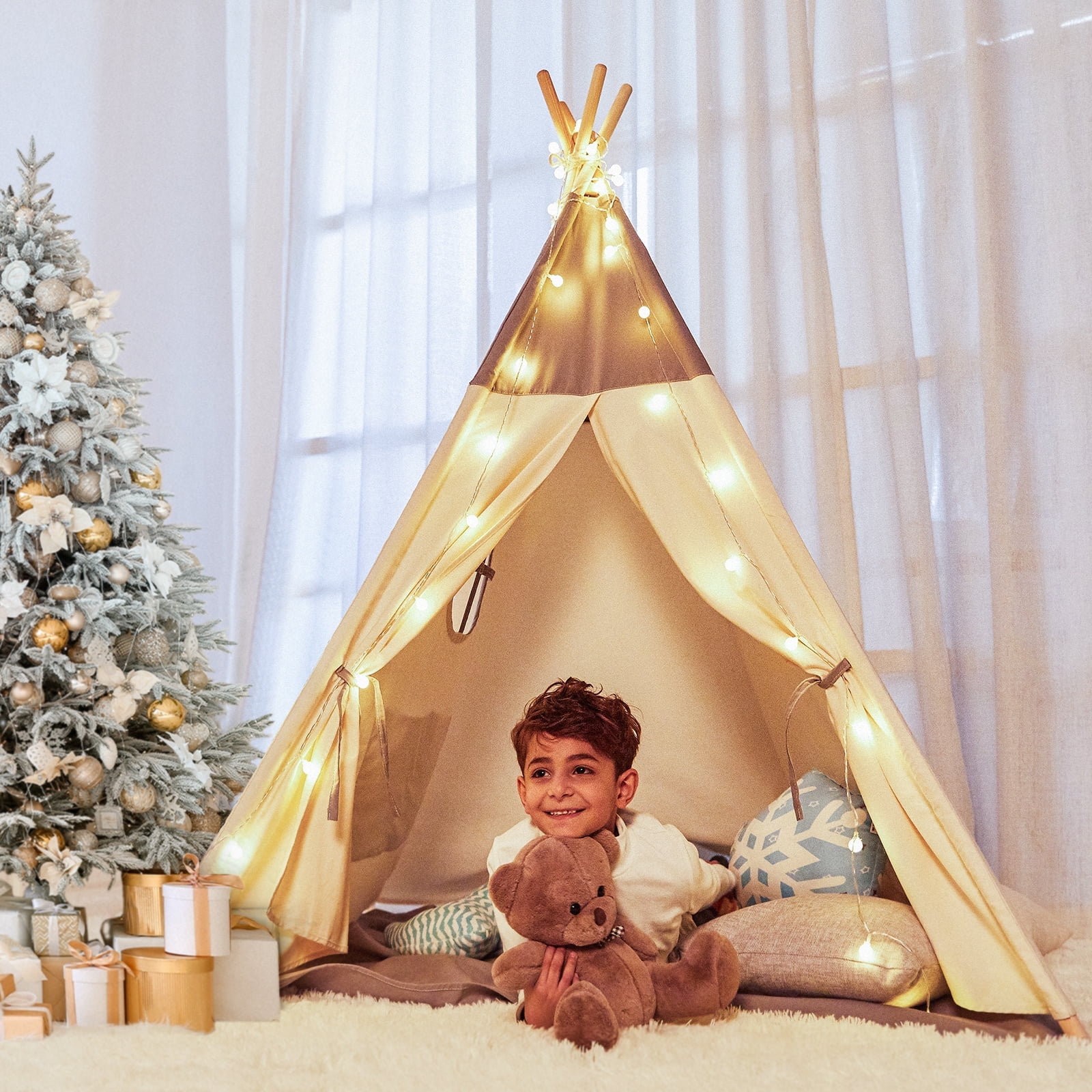Besrey kid’s teepee tents are made of 100% cotton canvas, free of harmful substances, skin-friendly and soft like cloud. The frame of this Indian teepee tent is made of solid natural pine poles, which are not easily deformed after long time use. And this cute play tent for child also comes with stabilizers and 4 pcs of non-slip sleeve, giving the teepee tent double stability, which can withstand any curious child’s play. The play tent also has ties on both sides, and when it tied, the teepee tent becomes a private little space for kids. Don’t worry about breathability, the tent has a cute little window, through which fresh air circulates. Easy to assemble and dissemble is also a significant feature. Besrey teepee tents for kids comes with all accessories, when kids want to play, just open the tent, tie the rope tightly, and you’re all set. Under your supervision and with your help, you and your kids can enjoy the precious family time together. Isn’t it great to have such a lovely leisure time? Besrey Indian play tent is the perfect gift for kids at Christmas or their birthday. Let your children’s imaginations run wildly inside this cozy teepee play tent. Children’s play tents provide them with a secret private space, allowing kids to use their imagination and design a kingdom of their own inside the tent.