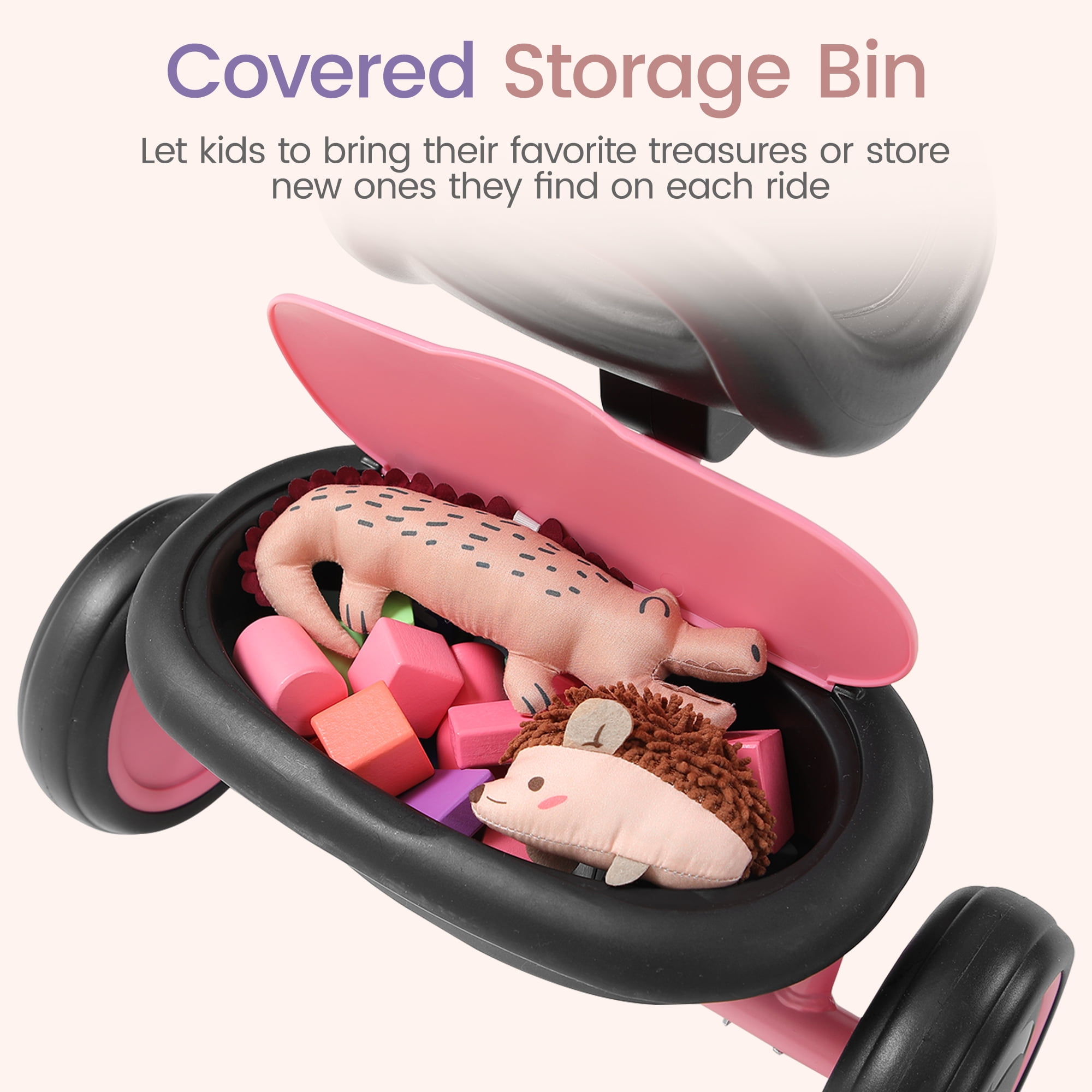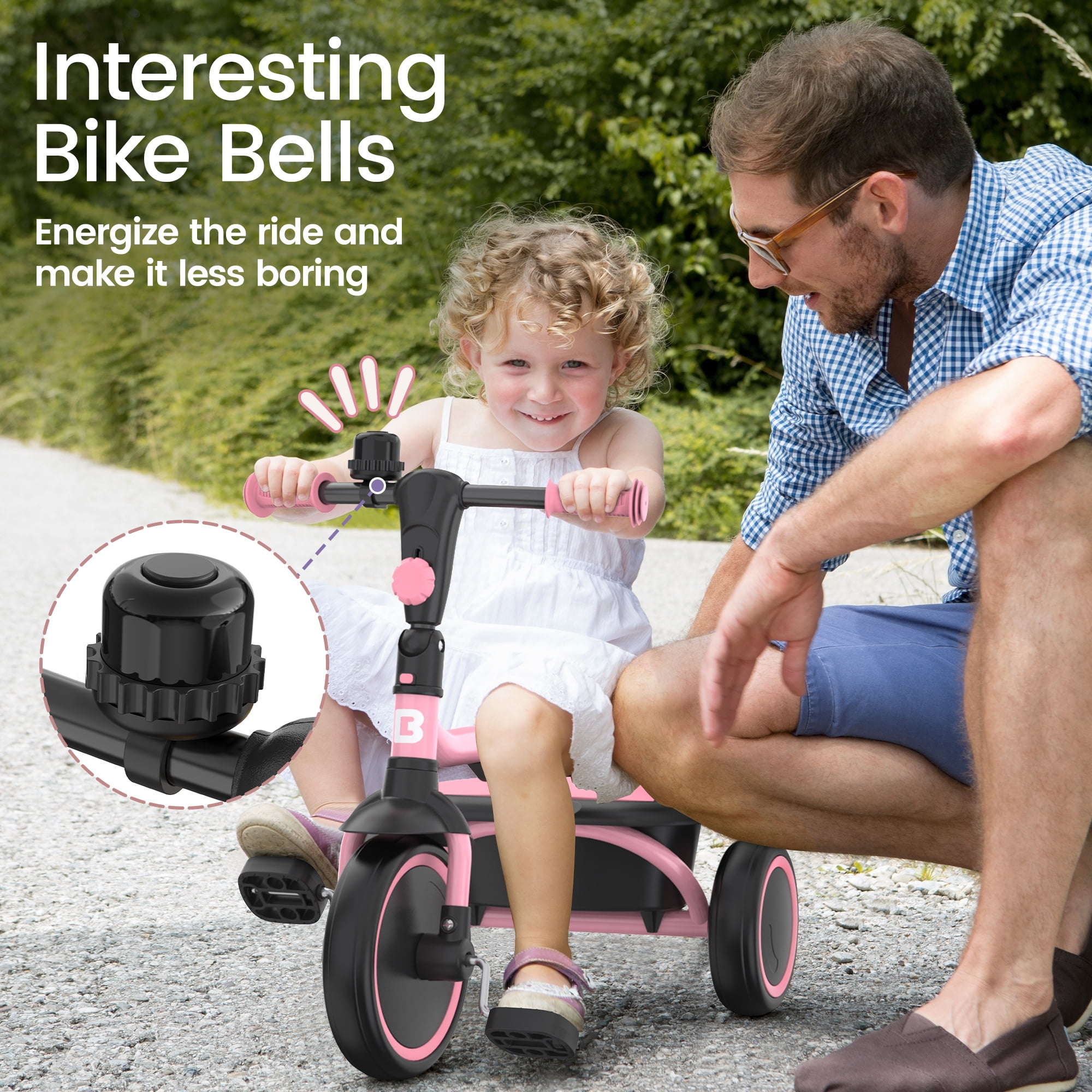 Features Best Bike for Beginners: This toddler tricycle is designed for boys and girls ages 18 months to 5 years old, who are curious about the world and passionate about exploring it, to develop motor skills and coordination from an early age. 4-Gear Adjustable Seat: The seat can be adjusted backwards and forwards. There are 4 customized positions to accommodate a wider age range. Add More Fun To Riding: Playful handlebar bell is attached for added style and extra fun. And the covered storage bin allows your child’s favorite toys to join every adventure! Compact & Portable: This toddler bike has a foldable handlebar. Easy to store and carry after folding, you can easily put it into the trunk for outing or traveling. Double Care for Added Safety: Enclosed wheels prevent foot pinching, while the low center-of-gravity and controlled turning radius ensure stability and minimize the risk of rollover. Durable, Quiet Tires: Equipped with EVA non-slip shock-absorbing wheels, sturdy and wear-resistant, strong enough for indoor or outdoor riding. Riding Comfort: Ergonomically designed non-slip handlebar and low-back seat for a comfortable riding experience. Easy Assembly: Refer to the detailed manual included, you can easily and quickly assemble the toddler tricycle in a few minutes. Safety Guaranty: Besrey kid’s tricycle has passed rigorous safety tests, ensuring that all materials and designs are child-safe. Specifications Color: Pink Gender: Unisex Certificate: CPC; ASTM F963-17 Recommended Age: 18 months – 5 years Max Weight Capacity: 55.12 Lbs Item Size: 24.80″ x 20.08″ x 15.94″ Item Weight: 7.94 Lbs NOTE All measurements are taken manually and may be subject to slight inaccuracies. Besrey offers a 2-year limited warranty. If you encounter any problems regarding the product, please contact us at (888) 310-6255 or [email protected].