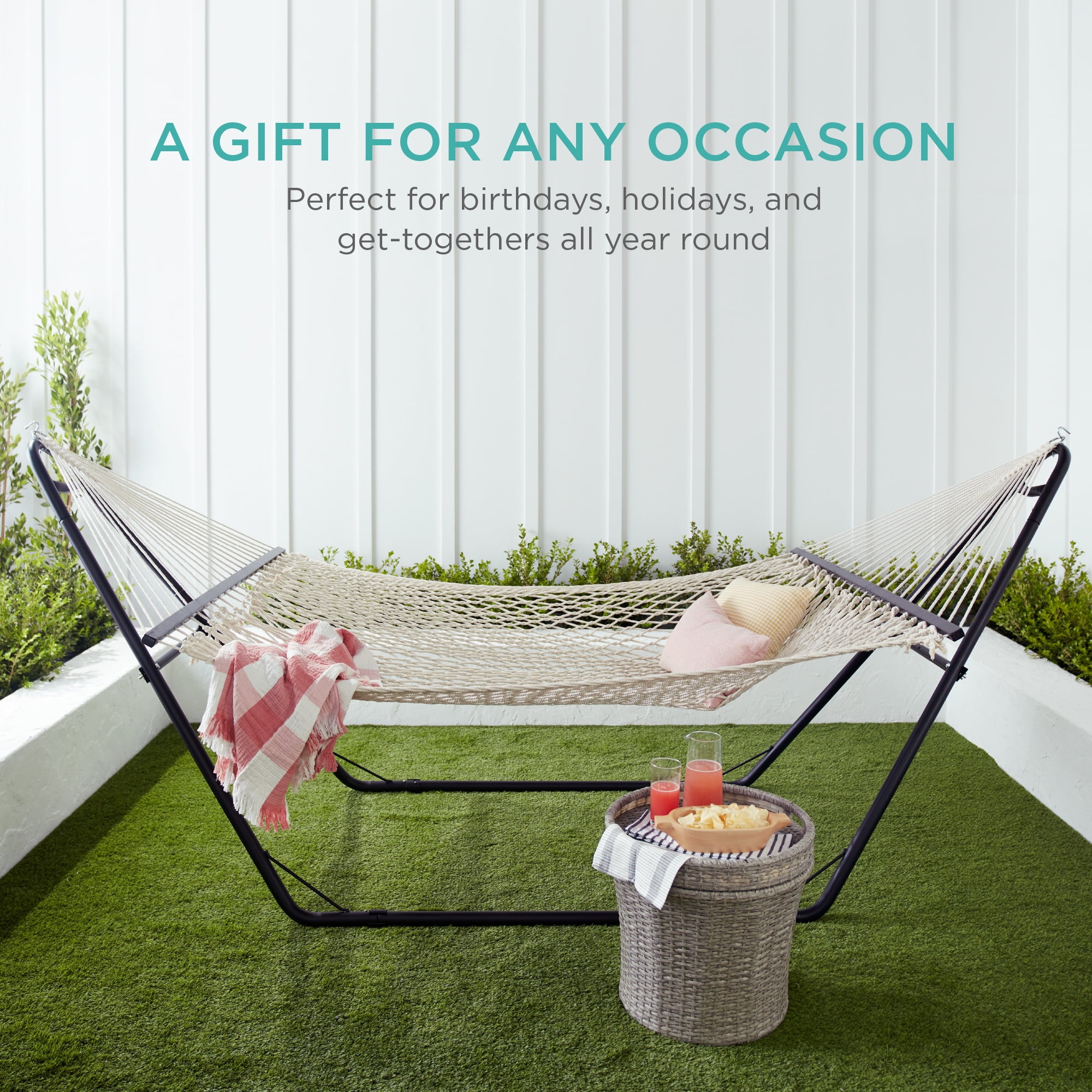 Relax anywhere with this versatile, durable, woven cotton hammock. At the park, camping, or in the backyard, this hammock is crafted for on-the-go comfort. Its convenient carrying case makes it portable and compact. Thick cotton rope, a wood-finished spreader bar, and tight eye weave ensure quality. It’s also steel stand compatible and weather-resistant, which makes this the perfect gift for any occasion, including birthdays, holidays, and get-togethers. A quick, tool-free assembly makes the perfect way to hang out.