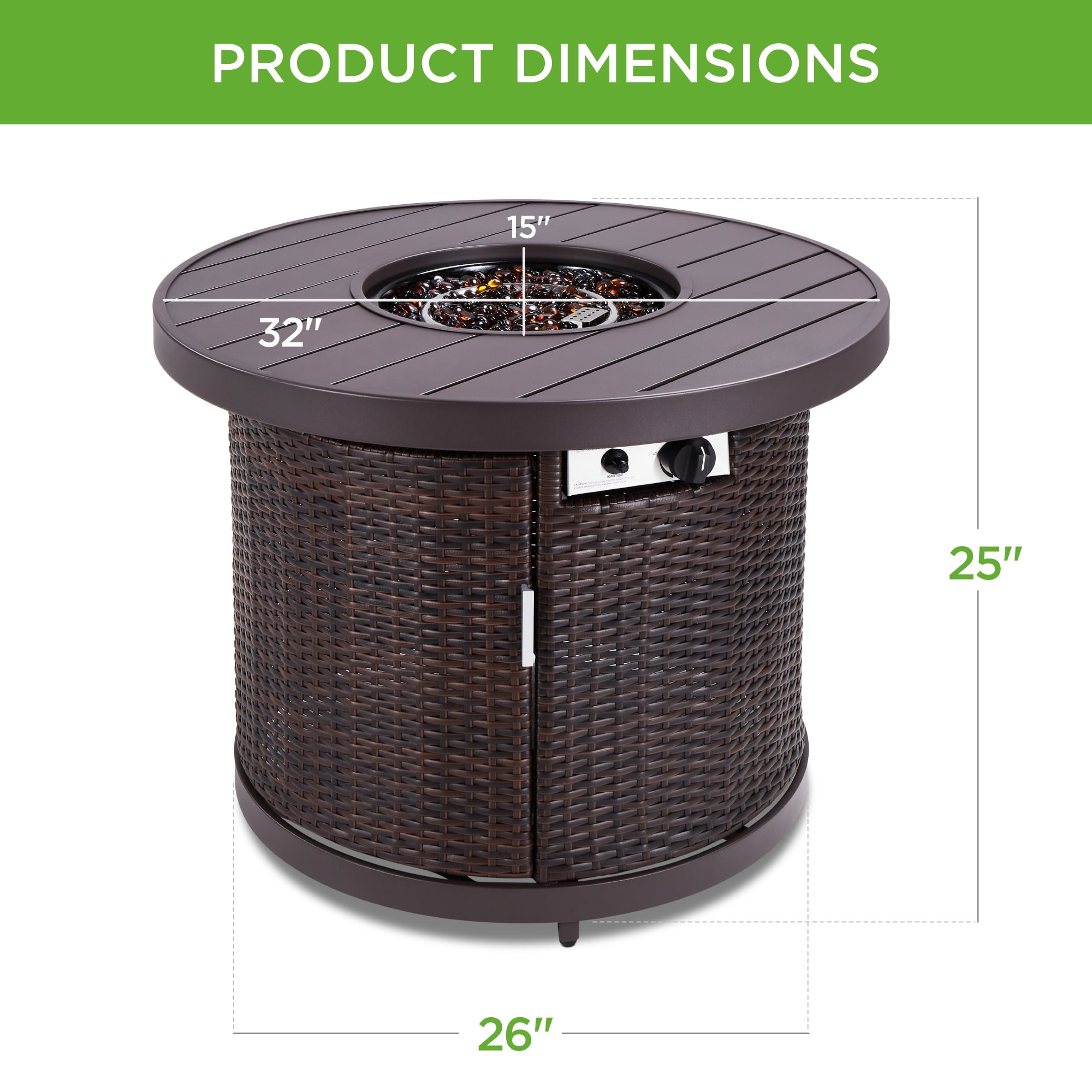 ROUND EDGES: A table free of corners is an ideal option when children are present, while making conversations easier to carry on in a cozier, more intimate setting ENJOY MORE TABLE SPACE: Remove the lid from the built-in side hooks and cover the pit to add more space for family and friends to enjoy a light meal, or carefully chow down around a warm fire HIDEAWAY TANK HOLDER: Change and conceal your gas tank quickly with a convenient side door; works with a standard 20-pound propane tank at 50,000 BTUs. A securing strap also helps prevent shifting REMOVABLE LID & GLASS ROCKS: Take off the center lid and ignite an inviting flame over a removable bed of glass beads that trap and disperse heat WEATHER-RESISTANT COVER: A durable nylon cover is included to help ensure this wicker fire pit table with heavy-duty, weather-resistant steel frame will withstand the elements when not in use; OVERALL DIMENSIONS: 32″(Dia) x 25″(H)