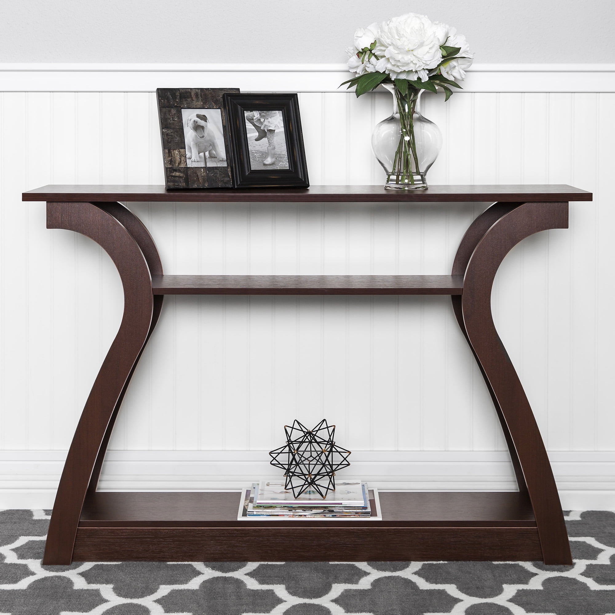DISPLAY SURFACE: Stylish accent table is designed with ample surface space, ideal for display and decorations HIGH-CAPACITY STORAGE: Spacious furniture piece is made with 3 shelving tiers to provide additional room for storage and decorations SOLID CONSTRUCTION: An engineered wood frame coupled with a sturdy curved base makes this a mainstay in nearly any setting VERSATILE: Utilize it as a hallway or sofa console table in your living or office space, and add an air of class to each OVERALL DIMENSIONS: 47″(L) x 11.75″(W) x 32″(H); Weight Capacity: 118 lbs.