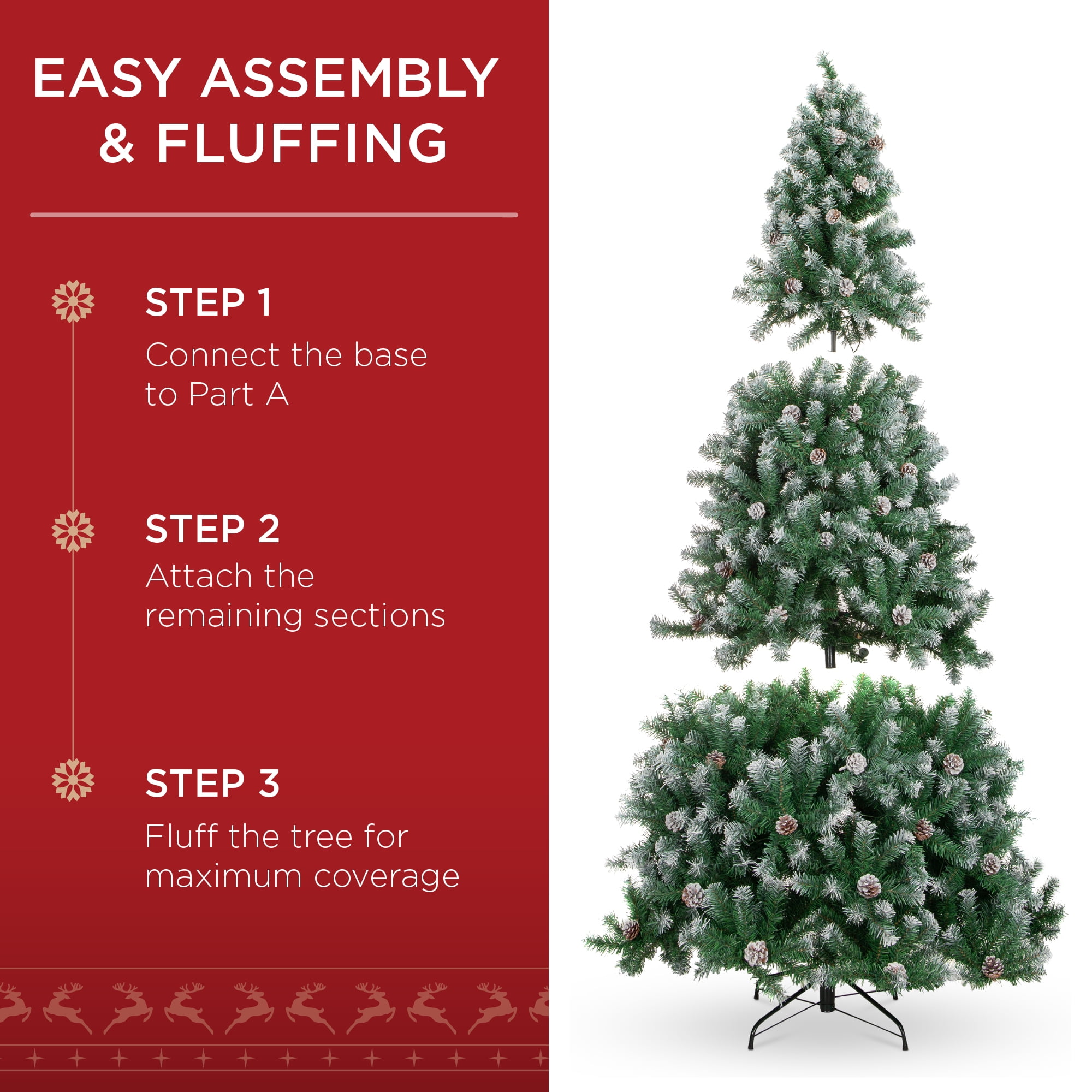 Take the stress out of Christmas tree shopping! Enjoy thousands of lightly flocked, faux pine PVC branch tips with realistic pine cones and holly berries. This tree features a simple 3 step assembly: step 1 connect the base to part A, step 2 attach the remaining sections, step 3 fluff the tree for maximum coverage! Easy construction and a metal base makes this the perfect addition to a happy holiday!