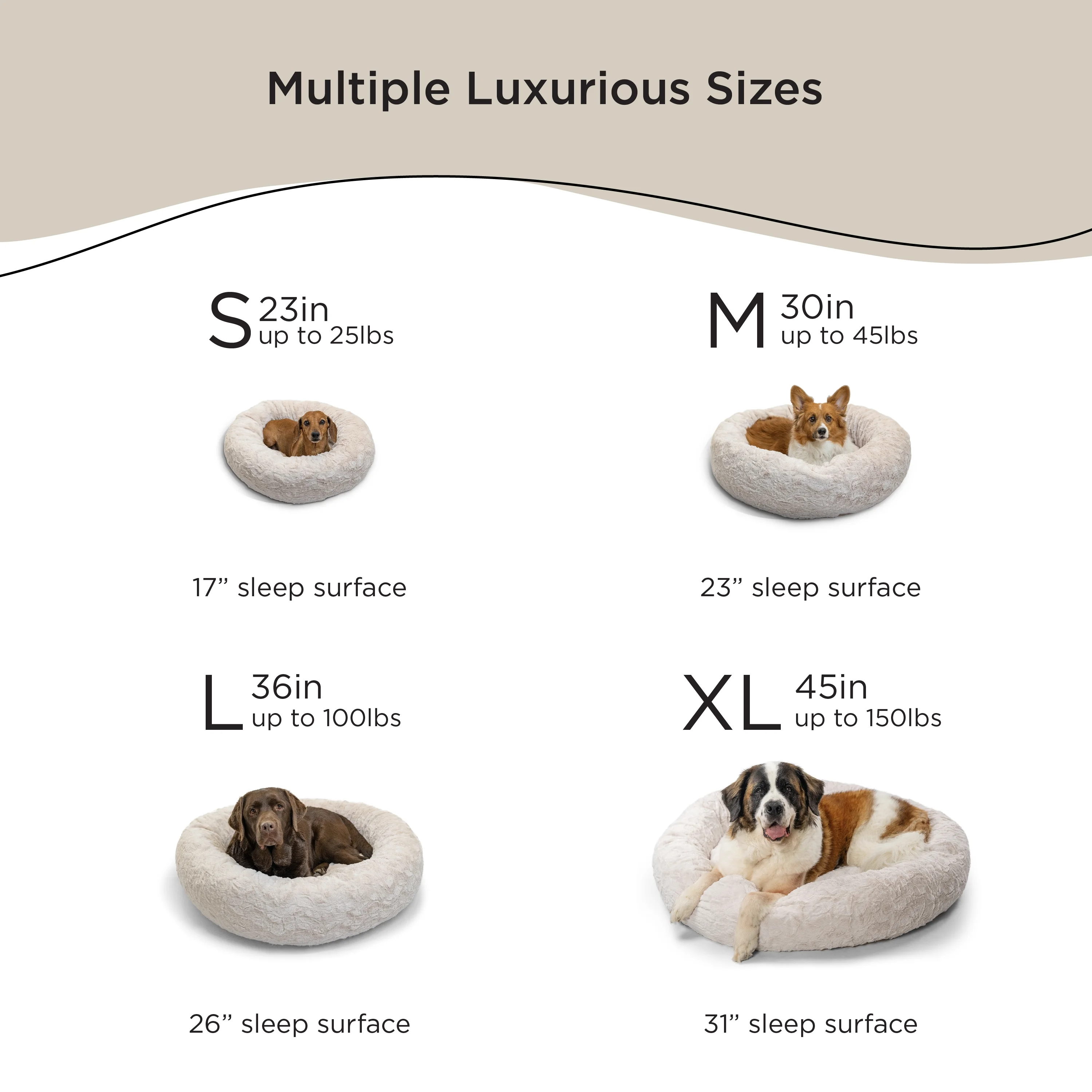 DONUT PET BED; 36 in round dog bed for pets up to 100 lbs; this includes breeds such as Australian Shepherd, Siberian Husky, Border Collie, Labrador Retriever, Golden Retriever, German Shepherd, Boxer, Poodle, Dalmatian, etc CALMING COMFORT DESIGN; the bed’s round shape, 9 in tall bolster, and soft self-warming faux fur make this the perfect bed for cuddling up and burrowing, helping to calm dog anxiety and provide a sense of security while your pet sleeps LOFTY AND SUPPORTIVE; filled and with premium high loft and high density polyfill for long-lasting support and comfort SAFE FOR HOME AND PETS; made with materials that are free from harsh dyes, skin irritating chemicals, formaldehyde, and flame retardants MACHINE WASHABLE BED SHELL; use zippers to remove interior fill; machine wash bed shell only; please see our pro tips and special care instructions for more details