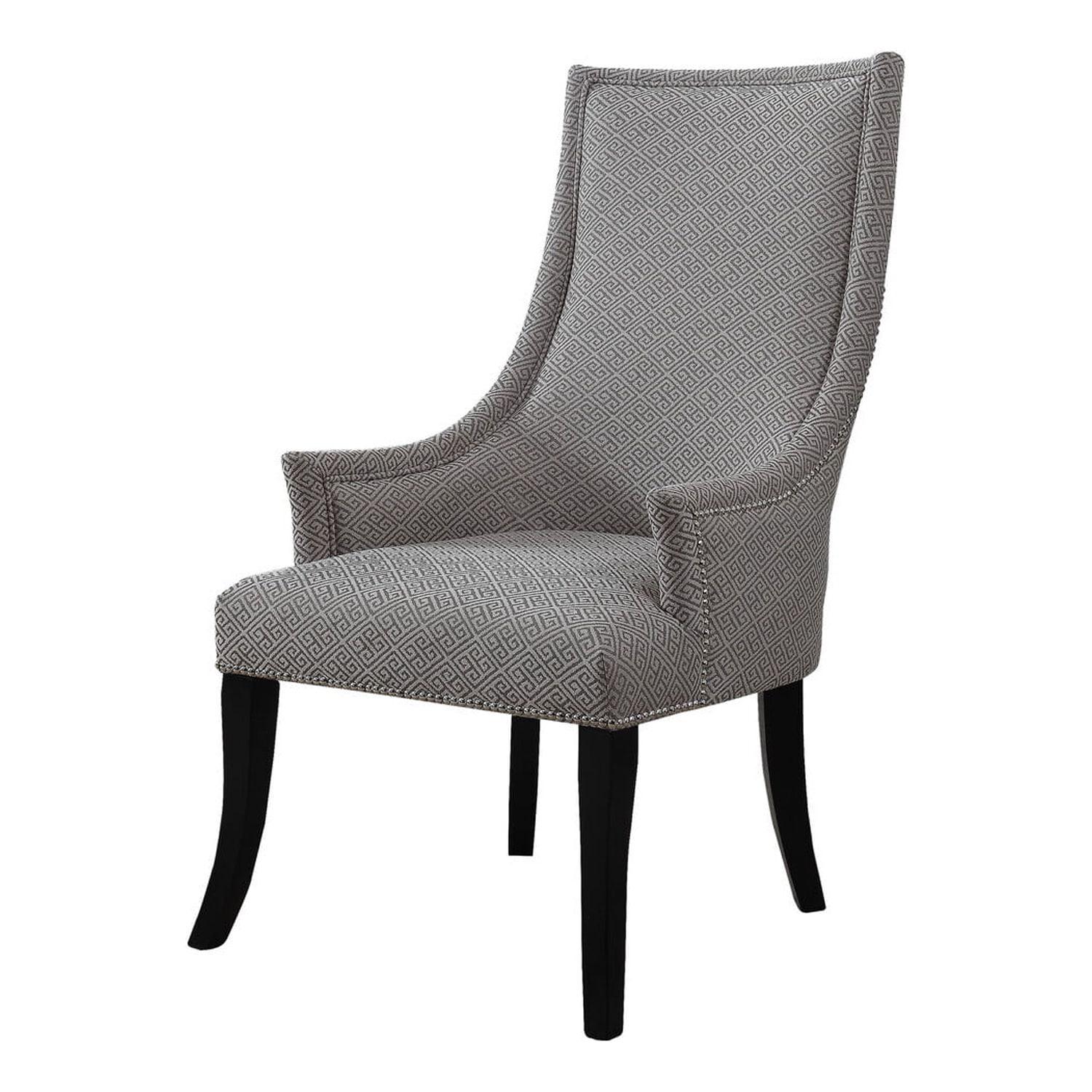Peacefully reminiscence the day away on this attractive accent chair. Decorated with various designs palettes along with silver nail heads give this chair glistening life when doused in day light. It is upholstered in durable polyester blend fabric and stands on chic black wooden legs. The curvy design provides comfort and a welcoming appeal. Perfect for living rooms, bedrooms or studios. Pair up with a side table to match for style perfection. Available in various patterns.