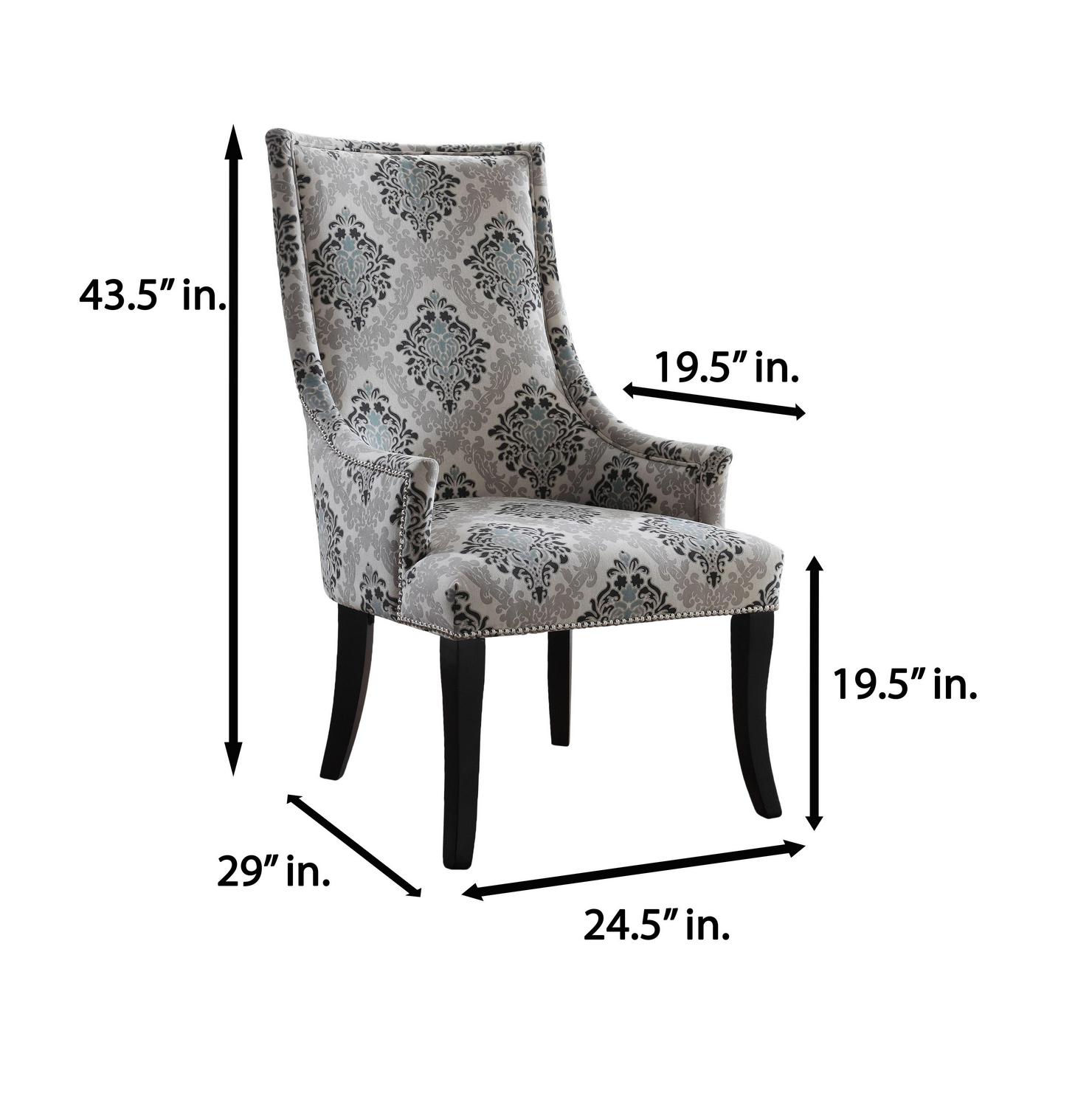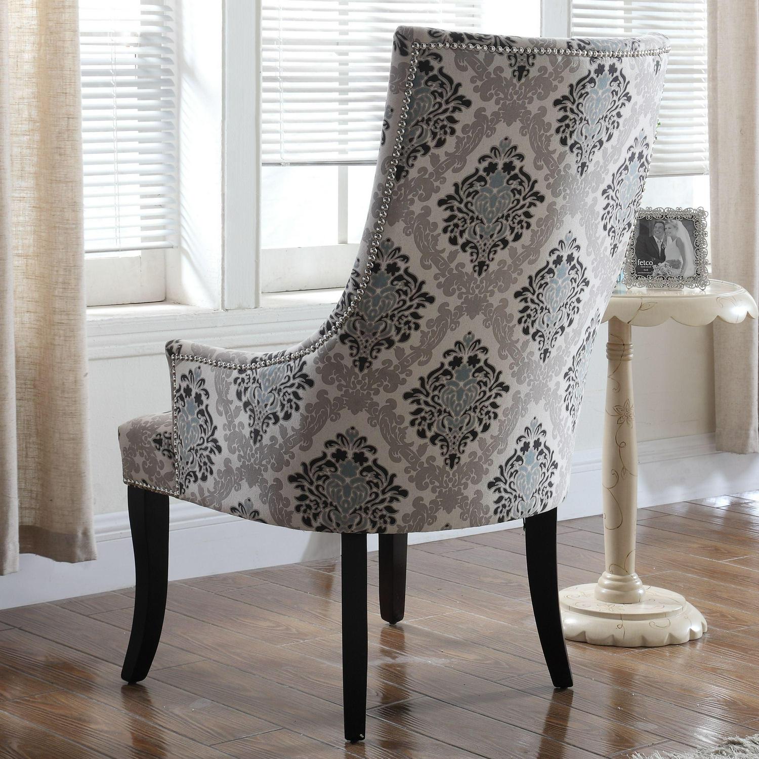 Peacefully reminiscence the day away on this attractive accent chair. Decorated with various designs palettes along with silver nail heads give this chair glistening life when doused in day light. It is upholstered in durable polyester blend fabric and stands on chic black wooden legs. The curvy design provides comfort and a welcoming appeal. Perfect for living rooms, bedrooms or studios. Pair up with a side table to match for style perfection. Available in various patterns.