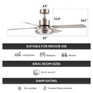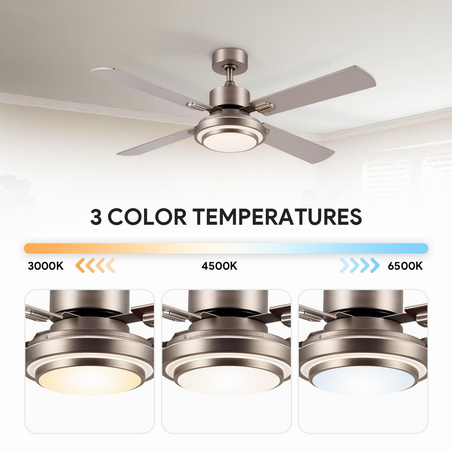 Elevate the ambiance of any space effortlessly with This 52 inch ceiling fan with light a seamless blend of style and functionality that complements diverse settings, whether it’s your cherished home or bustling office. Stay comfortable all year round thanks to the quiet bidirectional DC motor of this modern ceiling fan, ensuring a consistent circulation of air that cools you down during summer and evenly distributes warm air throughout winter. Experience a tailored comfort zone as you choose from an array of options: select the perfect fan speed from the six available settings, establish automatic shutoff times ranging from 1 to 8 hours for optimal energy efficiency, and immerse yourself in the desired ambiance using the 15W LED light with its versatile three color temperature options. Designed for enduring strength and longevity, this bedroom ceiling fan boasts a robust brushed nickel metal body and resilient MDF blades that resist corrosion, making it an ideal addition to living rooms, bedrooms, and more. Setting up your new indoor ceiling fan is a breeze with our user friendly instructions, allowing you to effortlessly transform any space, be it your living room, kitchen, bedroom, or office, into a haven of perfect temperature and ambiance.