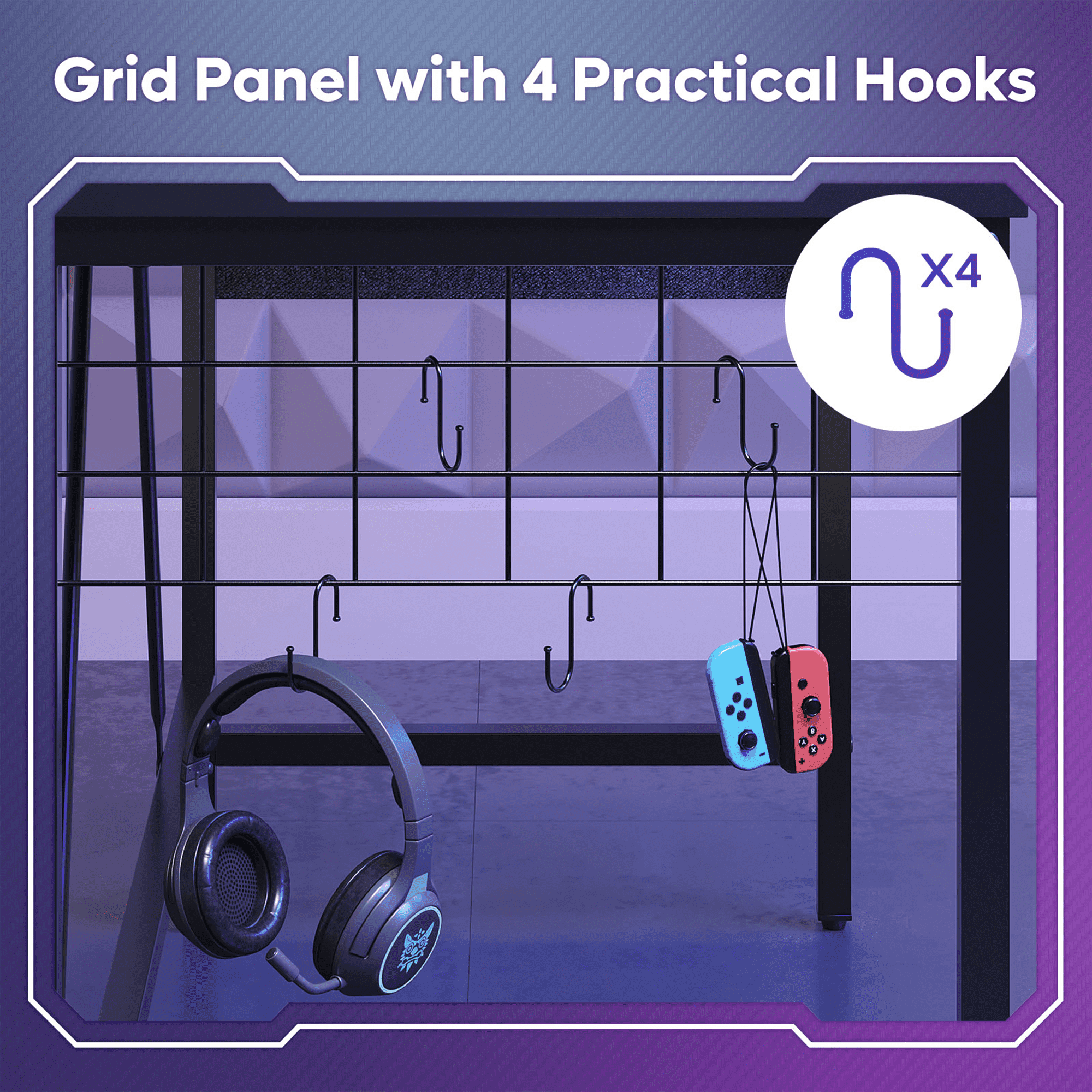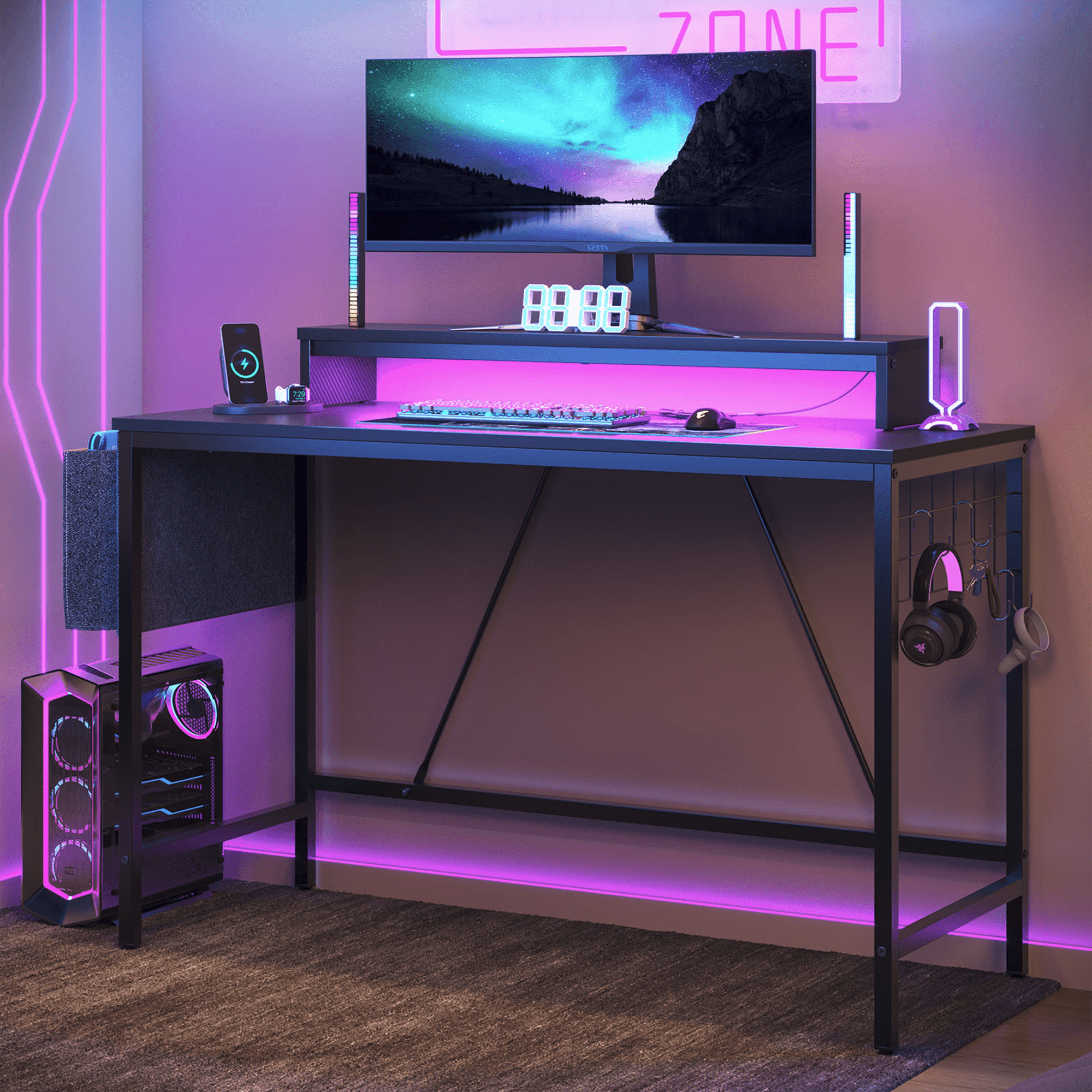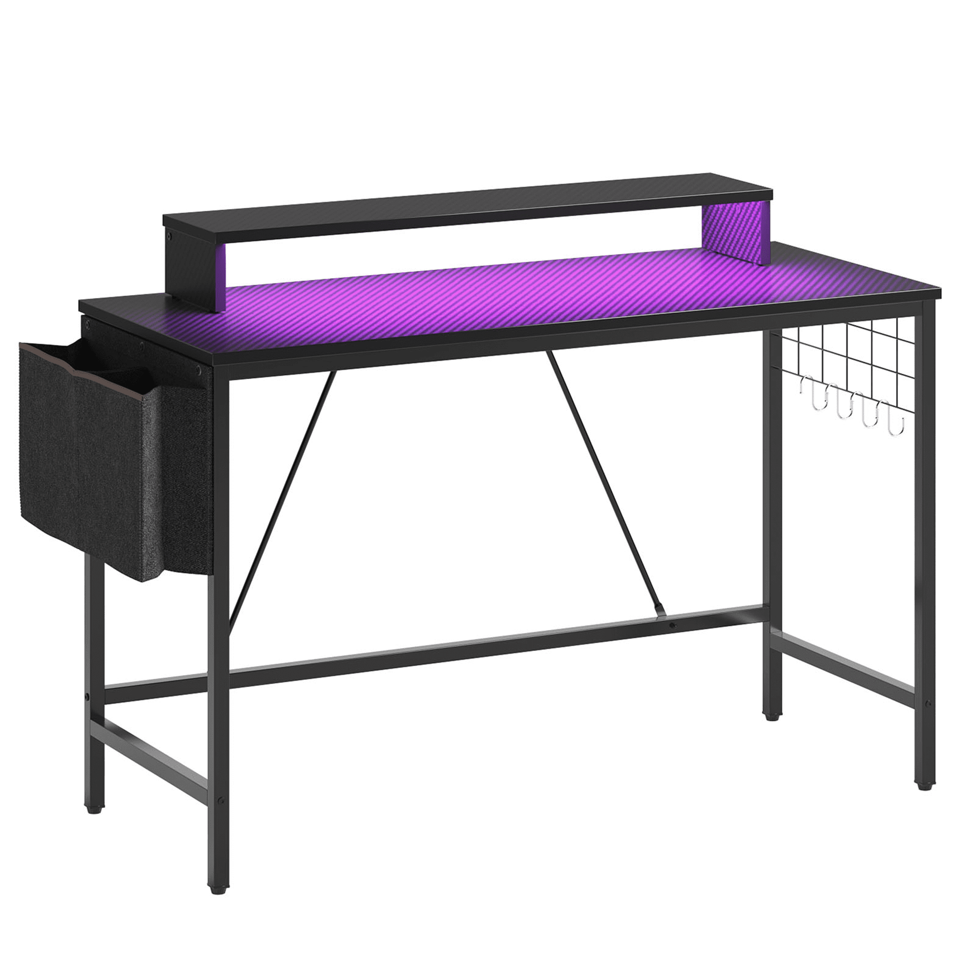 Upgrade your gaming and work setup with the Bestier 41.7 inch Gaming Desk, a versatile computer desk designed for gamers, students, and professionals. This small corner desk is the perfect size for any room, offering both functionality and style. This gamer desk features a LED monitor stand, elevating your screen to an ergonomic height and reducing neck and eye strain. Enhance your gaming experience with dynamic LED lights that create an immersive atmosphere.Stay organized with the convenient storage side pocket, ideal for keeping your gaming accessories, office supplies, or school materials within easy reach. The iron grid comes with four hooks, perfect for hanging your headset and other essentials, ensuring a clutter-free workspace. Whether you’re a gamer looking for the perfect setup or a professional seeking an efficient workspace, the Bestier Gaming Desk is designed to meet all your needs. Its compact size makes it perfect for small spaces, offering both functionality and aesthetic appeal. This desk is not just for gamers; it also serves as an excellent office desk, making it a great addition to any home or office space. Its sleek design and practical features make it an ideal gift for kids and adults alike.