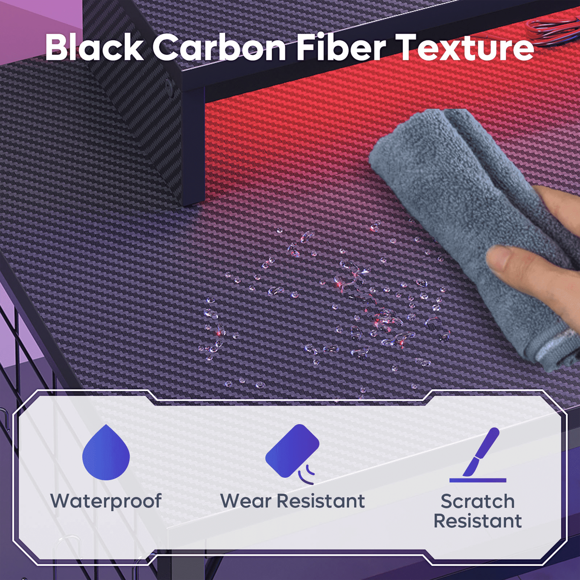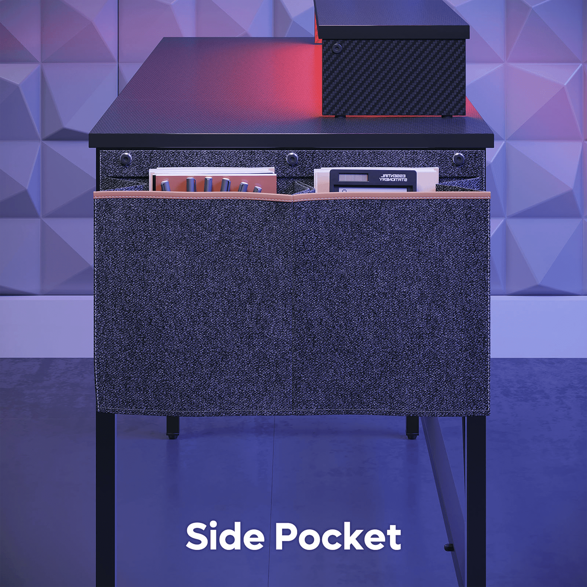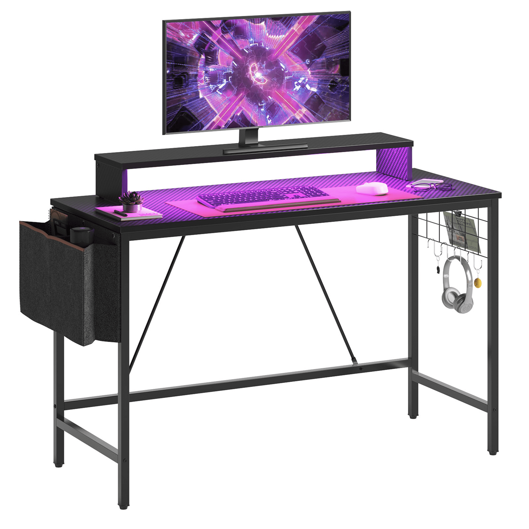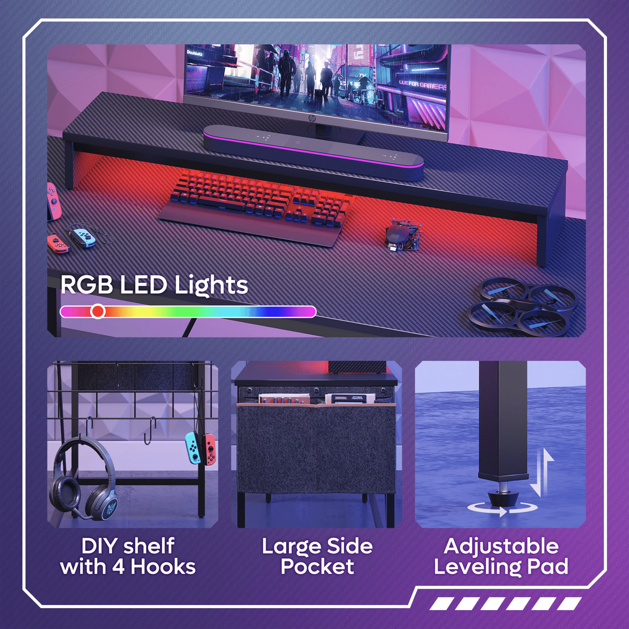 Stylish Gaming Desk Stand out with its black carbon fiber color and eco-friendly particle board that adds a touch of cool and sophistication to your gaming setup. The reinforced legs with crossbars not only look stable but also provide durability and longevity. Capable of supporting up to 100 lbs of gaming gear, monitors, and accessories without compromising performance. Convenience Storage Bag This computer desk with a handy side storage bag offer extra storage space for your office supplies, books, and small items. Keeping your workspace tidy and organized while allowing easy access to your essentials. Additional Storage Space You can take it a step further! With a grid side frame design, pair this corner desk with some additional accessories like pen holders, small boxes, and organizers with hooks. These add-ons provide extra storage options. Say goodbye to clutter and hello to efficiency! Multi-Screen Compatibility For multi-screen work or play, this computer desk with storage features a monitor stand, empowering you to optimize your screen arrangement for enhanced productivity or to immerse yourself fully in the gaming action with dual monitors. And with the built-in headset hook, your gaming gear is always ready for action without cluttering your workspace. Computer Desk with LED Light Immerse yourself in the ultimate gaming atmosphere with our 7 colors and 22 modes LED lighting. Whether you’re working or gaming, dive into intense battles and enjoy every moment to the fullest. Great Gift for gamers, students, and professionals, suitable for kids and adults.