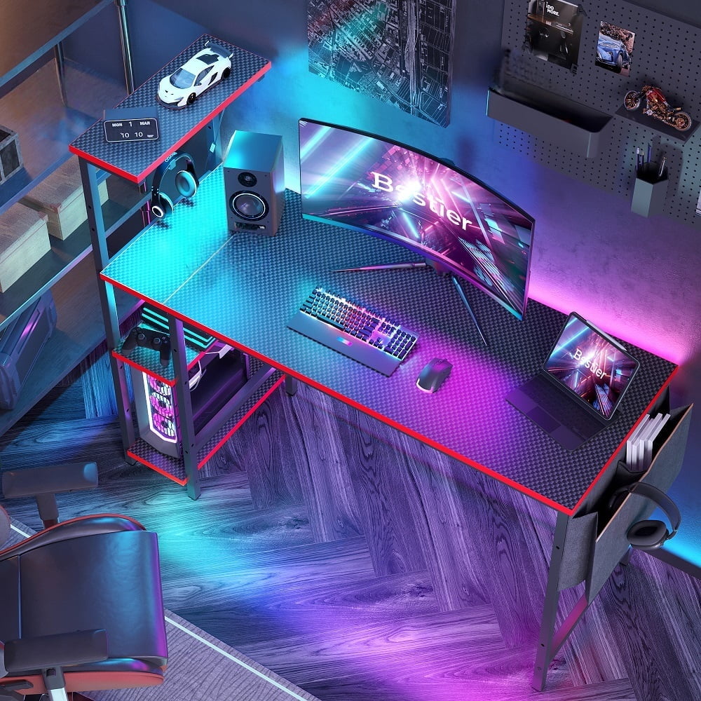 Bestier 52 inch Gaming Desk with LED Lights & Reversible Storage Shelves,LED Gamer Desk for Home and Office,Computer Office Desk with with Side Storage Bag-Carbon Fiber Platform