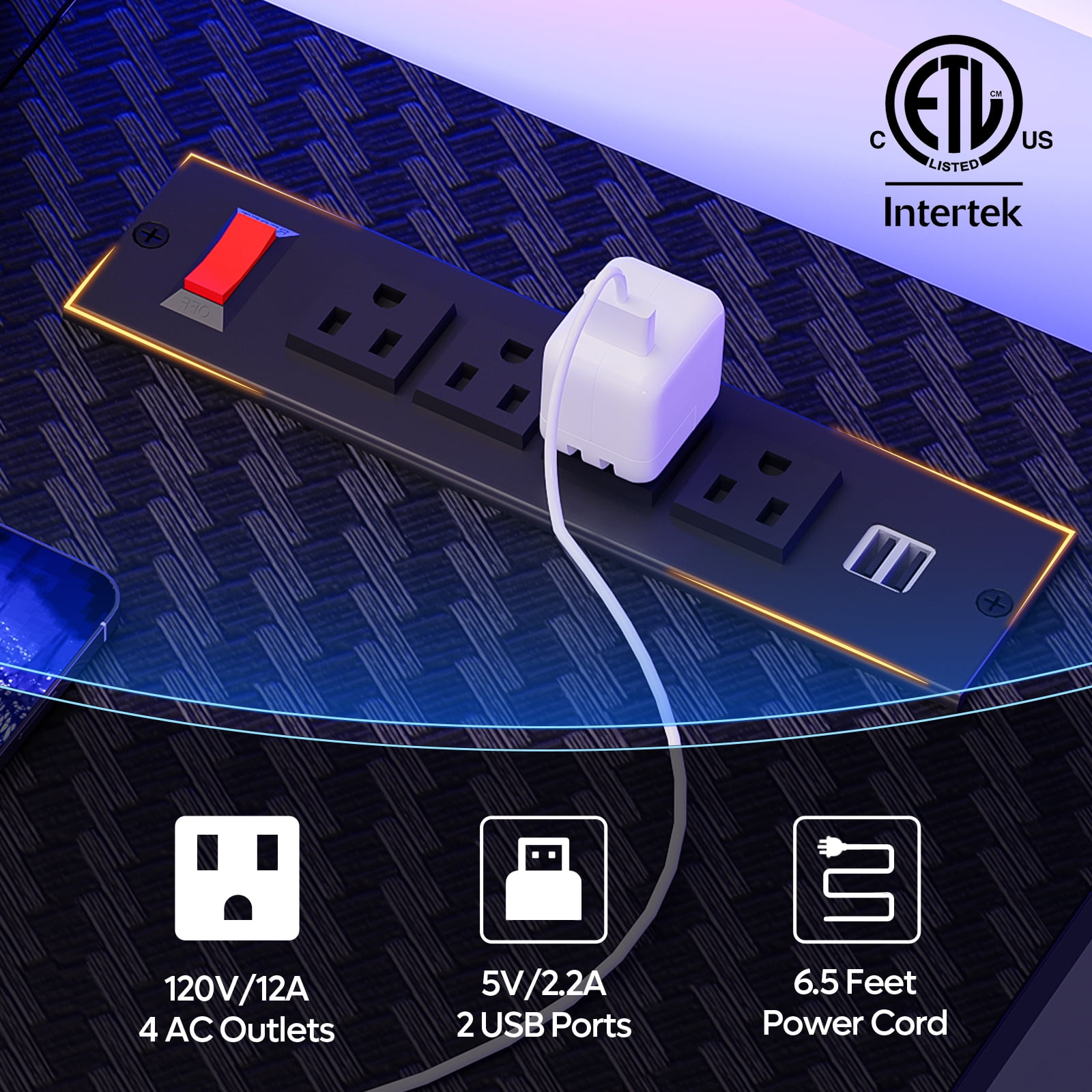 Maximize your gaming experience with the Bestier 52-inch Gaming Desk. This comprehensive gaming station features an ergonomic monitor stand, a cup holder, and a headphone hook for optimal organization. The desk is equipped with an integrated power outlet, including 4 AC outlets, 2 USB ports, and a 6.5-foot power cord for all your charging needs. It also boasts RGB LED lights with 22 dynamic modes and 7 main colors, adding a vibrant touch to your gaming setup. The large workspace measuring 52 x 19.69 inches provides ample room for all your gaming gear. Enhance your gaming performance with this all-in-one, feature-packed gaming desk.