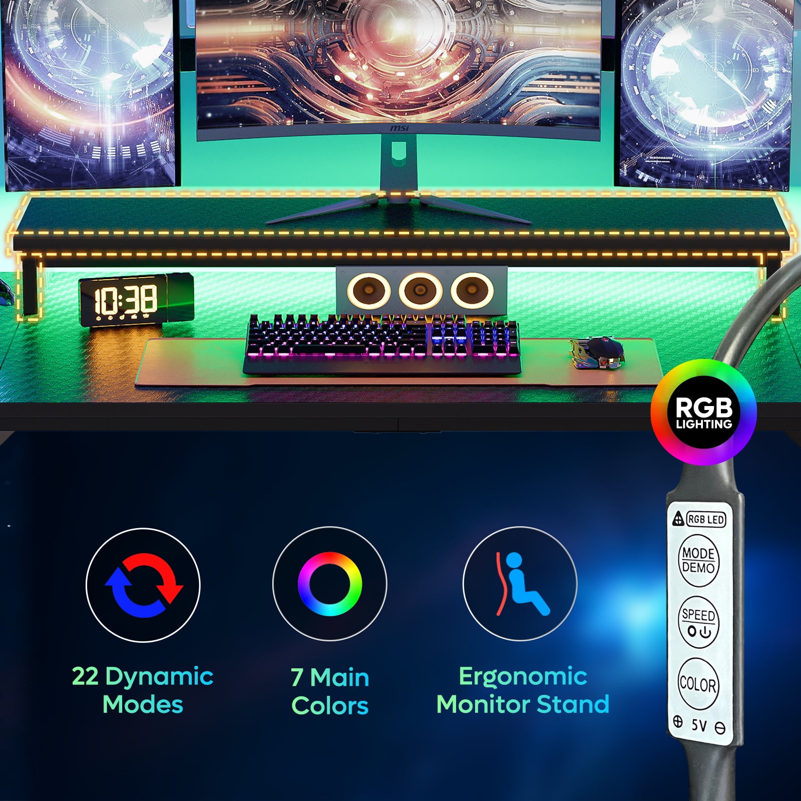 Power Outlets: The Bestier 52 inch Gaming Desk is a comprehensive workspace solution, perfect for gamers and professionals. This desk features a power outlet with 4 AC outlets and 2 USB ports, along with a 6.5 feet power cord for convenient device charging, ensuring your gaming or work session is never interrupted. Its sleek design and durable construction make it a practical and stylish addition to any room. RGB LED Lights: Enhance your gaming or work experience with the Bestier 52 inch Gaming Desk. Equipped with RGB LED lights, it creates a dynamic and immersive gaming or working environment. The lights offer 22 dynamic modes and 7 main colors, adding a modern and stylish touch to your gaming or office space. Monitor Stand: The Bestier Gaming Desk comes with an ergonomic monitor stand, providing a comfortable viewing angle for your gaming or work setup. This feature helps reduce neck strain during long gaming or work sessions, ensuring a comfortable and ergonomic workspace. Cup Holder & Hook: Offering additional convenience, the Bestier 52 inch Gaming Desk features a cup holder and headphone hook. These features help keep your workspace clutter-free, ensuring your gaming or work session is focused and productive. Large Workspace: With a generous 52 x 19.69 inch workspace, the Bestier Gaming Desk provides ample room for your gaming or office setup. Whether you’re using it for gaming or work, its spacious surface, coupled with its unique features, make it a standout addition to any room. Enjoy the convenience and style that this desk brings to your space.