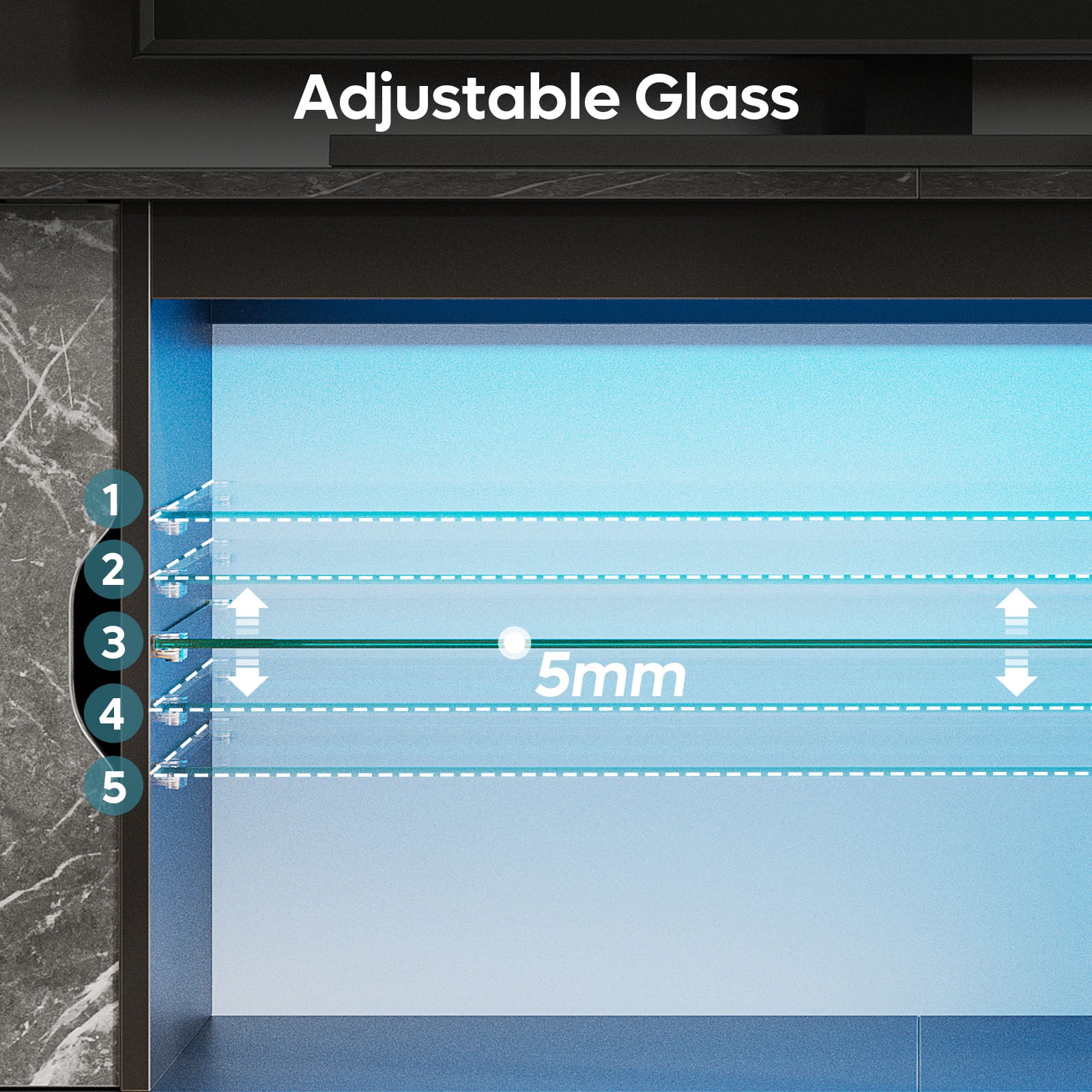 Dynamic Lighting: This gaming TV stand includes a LED light strip with 7 vibrant colors and 22 dynamic modes. The transparent middle glass shelf amplifies the light effects, enhancing the gaming atmosphere. PS5-Friendly Storage: This LED TV stand provides versatile storage options. It features a private cabinet on the left, a middle glass layer with five adjustable height options, and an open storage area on the right for additional gaming equipment like PS5. Durable Design: Designed for up to 65″ TVs, our PS5 entertainment center is made of premium particle board. It includes 2 robust anti-tip kits for secure anchoring, ensuring stability. This TV console is both stylish and functional. Adaptable Placement: The LED TV Stand suits multiple areas in your home. It’s ideal for living room movie nights, a personal entertainment spot in the bedroom, or a gaming center in your game room. Effortless Setup: This contemporary 58-inch TV stand comes with all required hardware and clear instructions. You can assemble this stylish piece quickly and easily, instantly upgrading your space.