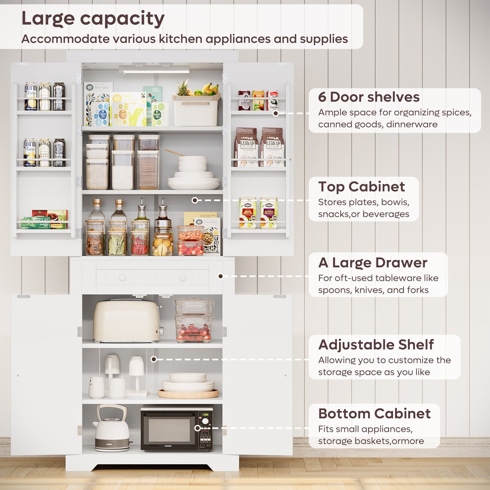Spacious Storage: The kitchen pantry (Dimensions: 72″ H x 30″ W x 16″ D) offers ample storage with 2 large cabinets, 1 drawer, and 6 side door shelves, providing plenty of space for storing your food, utensils. Motion Sensor Light: This pantry cabinet features a motion sensor light, allowing you to find items more clearly and conveniently at night or in low-light environments. With a sensing range of up to 19 feet, the light automatically turns off after 20 seconds of no motion. Equipped with magnets and steel sheets, the light can be easily attached anywhere you need it. 5V/2W Adjustable Shelves: This kitchen pantry storage cabinet features 2 adjustable shelves, allowing you to customize the height by up and down to 2.5 inches to meet your different storage needs. Sturdy & Durable: Crafted from high-quality P2 board, this white storage cabinet is designed for durability and stability. Equipped with an anti-tipping device, it can hold up to 320 pounds, ensuring it remains secure even if your pet runs around. User-friendly Design: The side door shelves of this kitchen cabinet are equipped with anti-drop bars to prevent items from falling. The round handles and magnetic doors ensure easy opening and closing, while the smooth drawer slides make it effortless to retrieve items. Easy to Assemble: This pantry cabinet includes all required accessories and detailed instructions for easy installation. Simply follow the step-by-step guide to quickly assemble it.