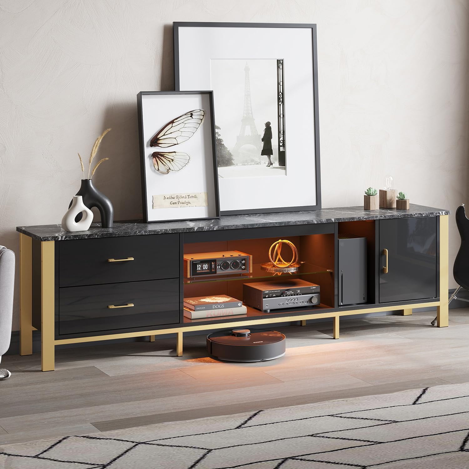 The Bestier 80-inch TV stand, on available , combines style and functionality. It’s designed to hold large TVs up to 85 inches and features a modern design with a bright front cabinet and a clear glass accent. The LED light strip enhances the ambiance and complements the modern style. The stand offers ample storage with drawers and a cabinet, perfect for gaming consoles like the Xbox controller. A unique feature is the bottom space that allows a robotic vacuum cleaner to pass through, making cleaning easier. This TV stand is a stylish and practical addition to your home.