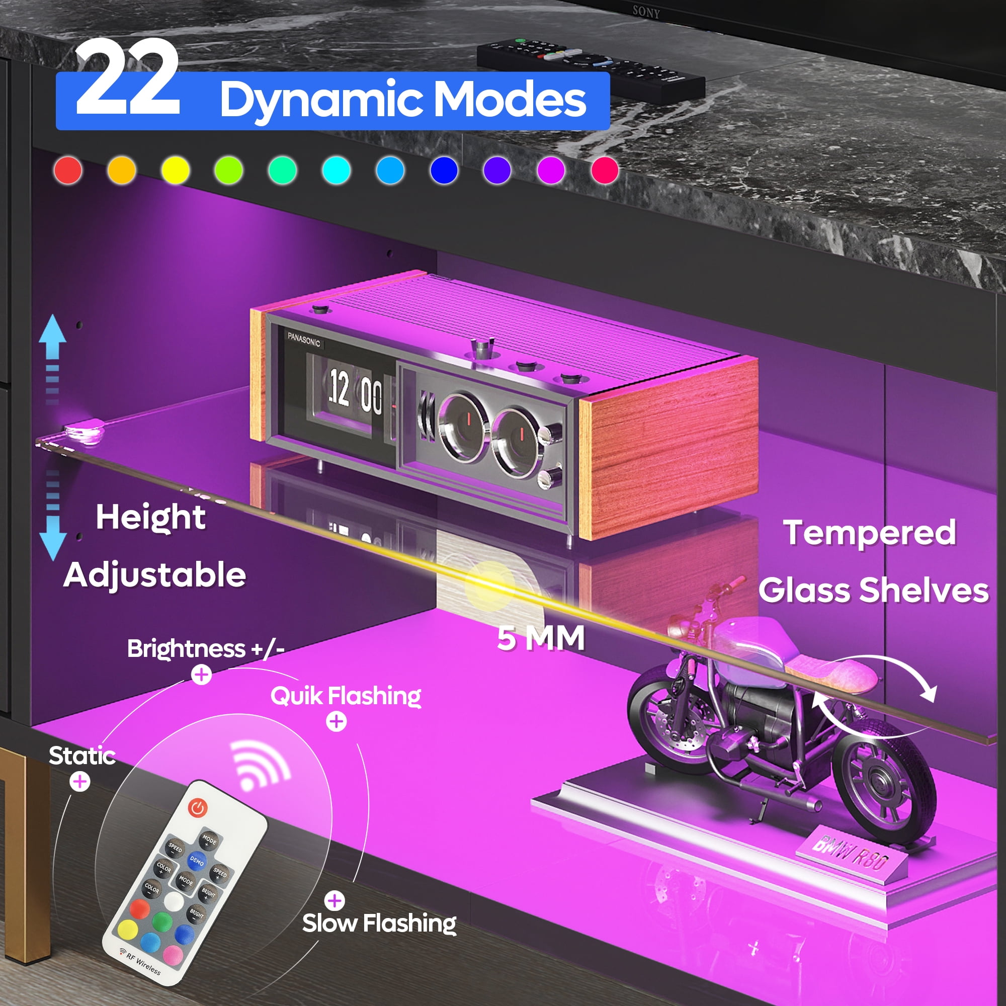 Features: Large Size: With its 80-inch size, this TV stand is designed to accommodate large televisions up to 85 inches. It provides a secure and stylish platform for your TV, making it an excellent centerpiece for your living room. LED Light Strip: The TV stand is equipped with an LED light strip, adding a modern and stylish touch to the unit. The soft glow from the light strip enhances the viewing experience, creating a cozy and comfortable atmosphere for movie nights. Spacious Storage: This TV stand, available on , features drawers and a cabinet, providing ample storage space. It’s perfect for storing gaming consoles like the Xbox controller, remotes, and other entertainment accessories, helping to keep your living area organized and clutter-free. Contemporary Design: The TV stand features a bright surface on the front cabinet, reflecting a sleek and modern style. The LED light strip complements this design, enhancing the overall aesthetic and making it a stylish addition to any contemporary living space. Robotic Vacuum-Friendly: The TV stand is designed with a bottom space that allows for the passage of a robotic vacuum cleaner. This thoughtful feature makes cleaning around the stand easy and convenient, helping you maintain a clean and dust-free living space. Specifications: Color: Black Maximum load capacity: 100lb Maximum Screen Size: 85 inch