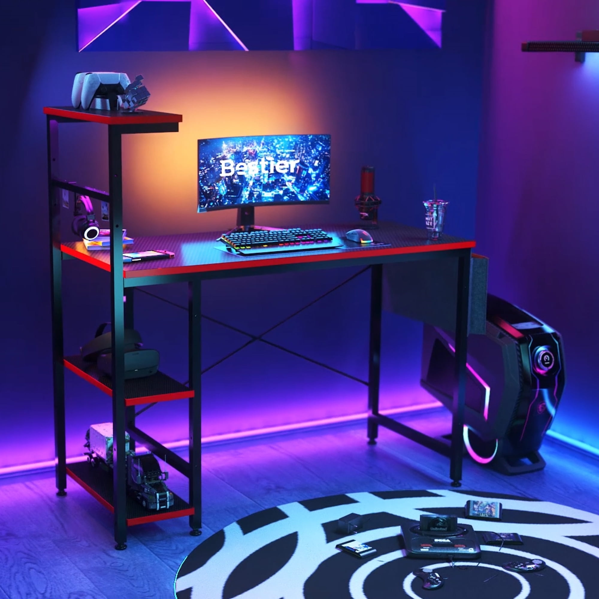 Bestier Carbon fiber gaming desk has a spacious desktop providing ample room for your monitor, PC, laptop, speakers, and more. The cool LED lights create a fun and exciting atmosphere, you will completely immerse yourself in your gaming or work time. Equipped with a headphone hook, a side pocket storage bag, and three open storage shelves, the gaming table will keep all of your gaming gear organized and be convenient for your daily needs. A perfect addition to any small home office, playroom, bedroom, dorm room, or any area that needs a computer desk.