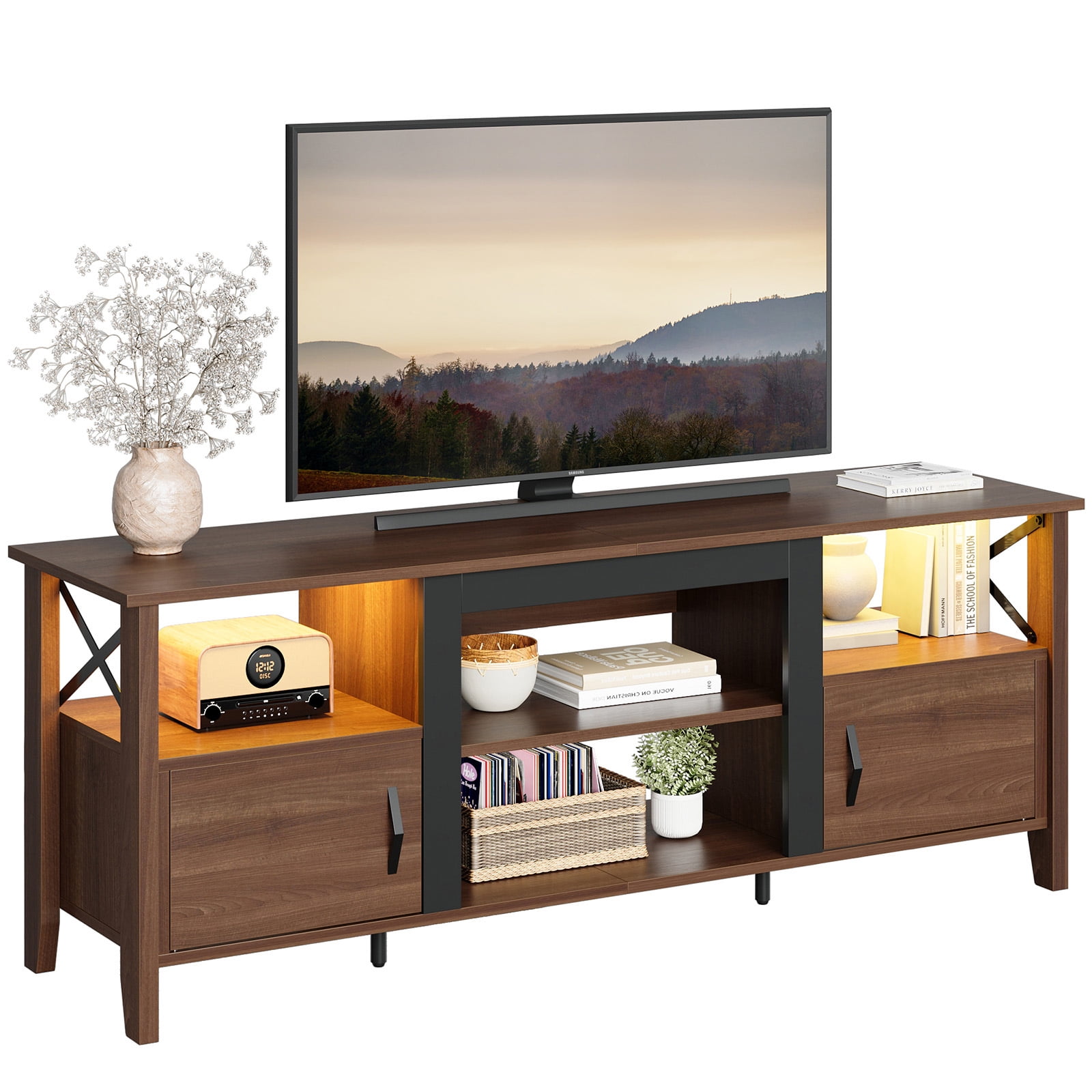 Bestier Farmhouse LED TV Stand for TVs up to 70″ Entertainment Center with Cabinet in Ancona Walnut