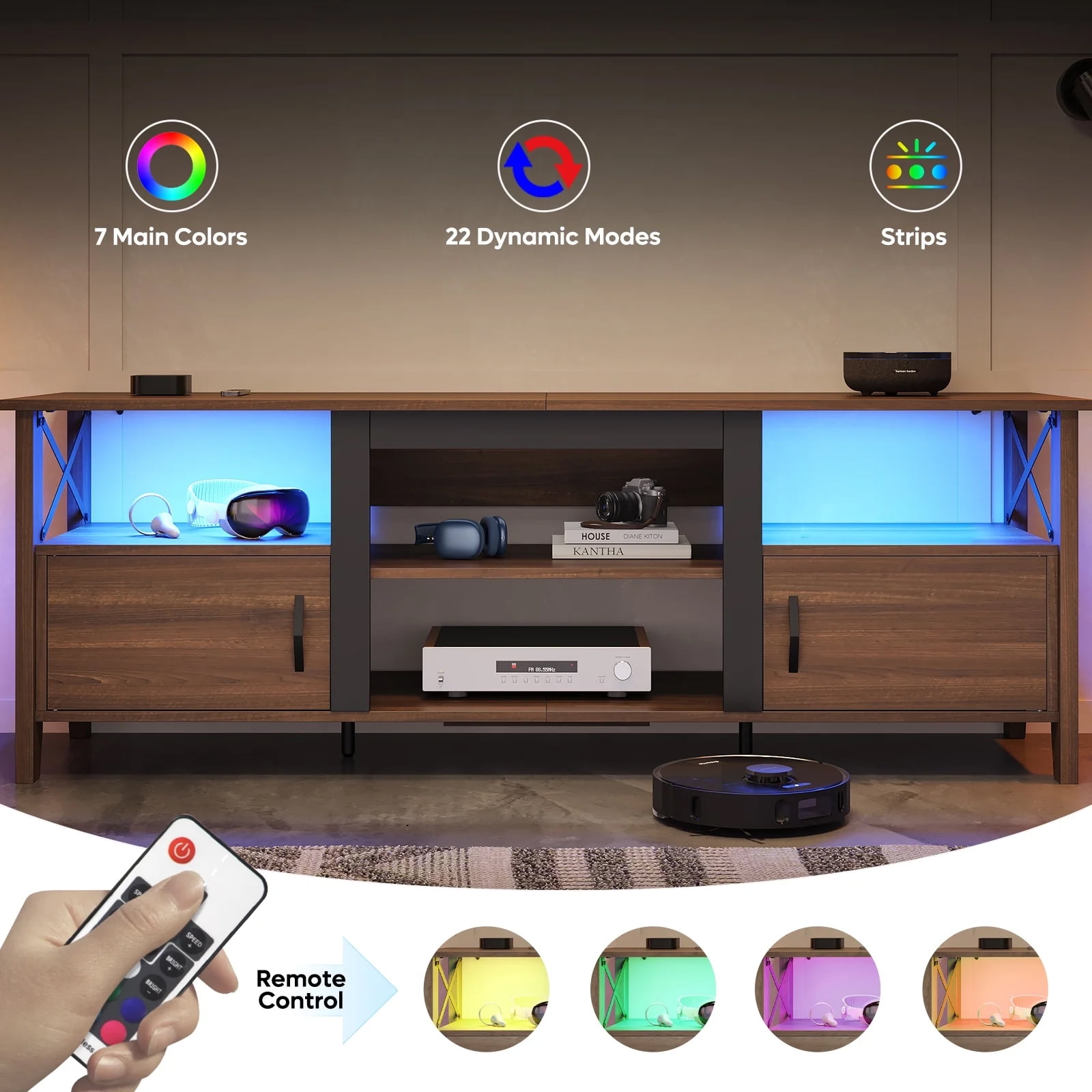 RGB LED Lights: The Bestier 63-inch Farmhouse Style TV Stand features RGB LED lights, perfect for creating an immersive gaming or movie-watching experience in your living room. With 22 dynamic modes and 7 primary colors, you can customize the lighting to suit your mood or match your decor. The LED lights also add a modern, stylish touch to this traditional farmhouse-style entertainment center. Multiple Storage Spaces: This TV stand offers ample storage space to keep your living area tidy and organized. It features two open shelves for easy access to your media devices, two cabinets for storing DVDs or games, and one additional shelves with adjustable storage options. This design allows you to customize your storage to suit your needs and keep your entertainment center clutter-free. for 65 inch and 70 inch TV: With a width of 63 inches, this TV stand is designed to accommodate TVs up to 70 inches, making it a versatile choice for most homes. Whether you have a smaller TV or a large home theater system, this stand provides a sturdy, stylish base that blends seamlessly with any decor. Two Storage Cabinets: The two side cabinets on this TV stand provide a private storage solution, perfect for keeping your belongings out of sight. Whether you’re storing DVDs, games, or other items, these cabinets protect your items from dust and damage while keeping your entertainment center looking neat and tidy. Sturdy Construction: Constructed from durable P2 particle board and metal, this TV stand is designed to last. In addition to the four legs, there are two additional legs on the bottom panel for extra stability. The top panel can support a maximum load of 88 pounds, ensuring it can safely hold your TV and other media devices. Specification: Color: Ancona Walnut Assembled Product Length: 63 inch Material: P2 Particle Board