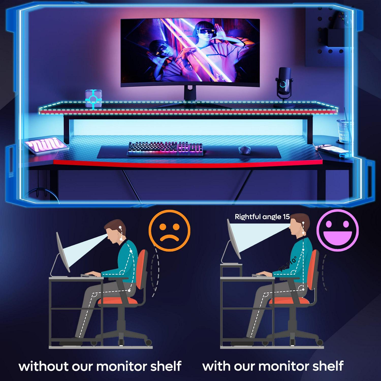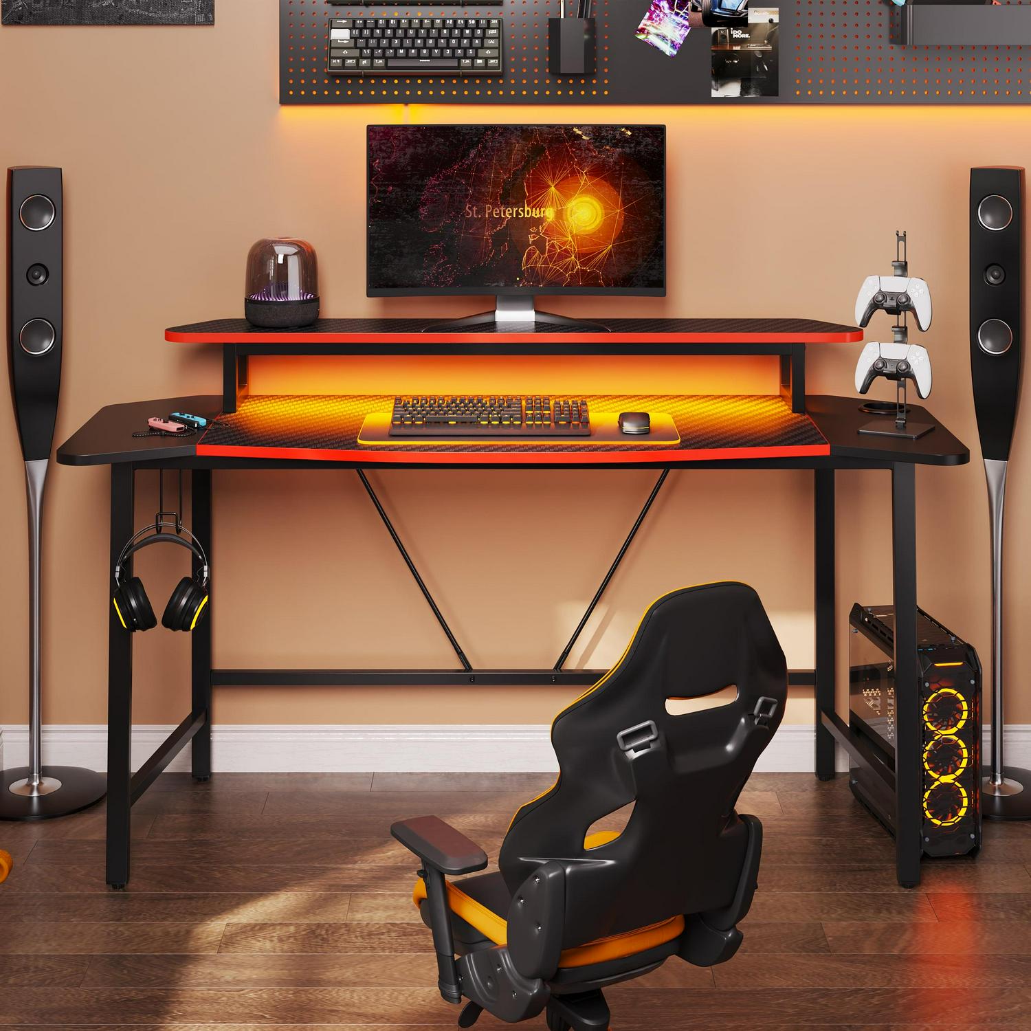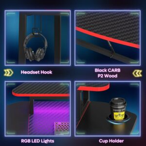 – RGB LED Lighting: This gaming desk includes customizable RGB LED strips. Tailor the lighting in your home office or study to match your preferences. The LEDs also serve as practical lighting for nighttime work or study sessions.